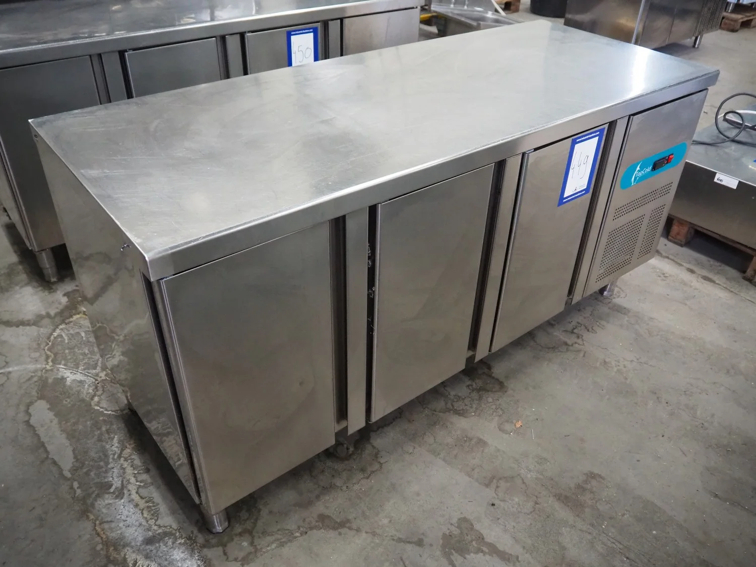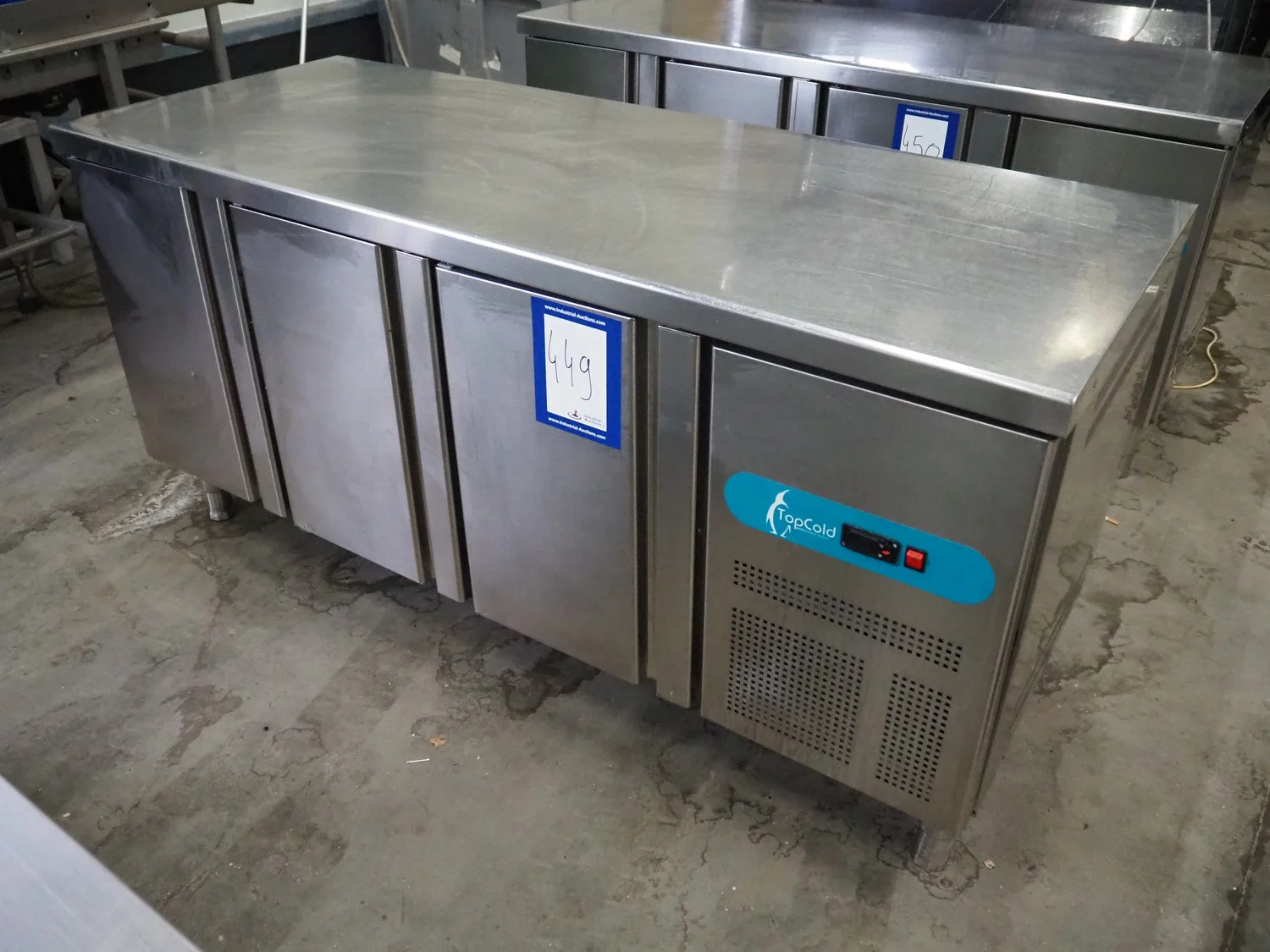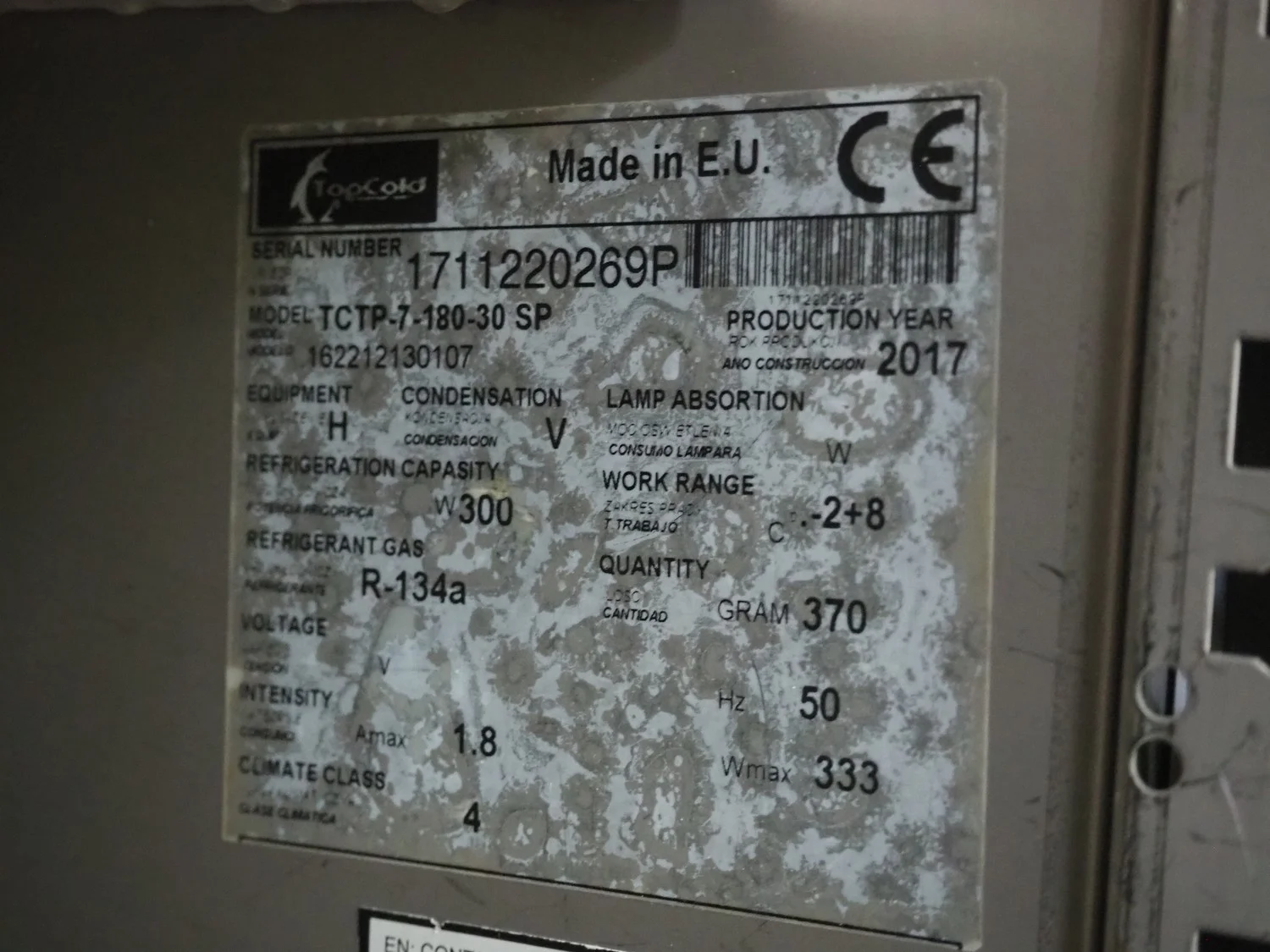 Top Cold refrigerated counter, model: TCTP-7-180-30 SP, serial number: 1711220269P, year of construction: 2017, 50 Hz, refrigerant: R-134a, 370 gram, top dimensions: 1800 mm x 700 mm, floor dimensionsL 570 mm x 330 mm, total dimensions: 1800 mm x 700 mm x 900 mm.