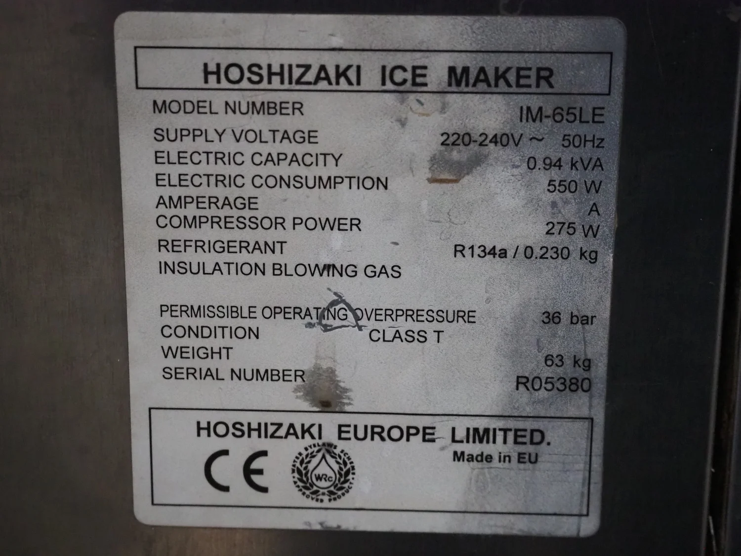 Hoshizaki ice maker, model: IM-65LE, serial number: R05380, 220/240 V, 50 Hz, 550 Watt, weight: 63 kg, refrigerant: R134a, 0.230 kg, dimensions: 630 mm x 500 mm x 900 mm.