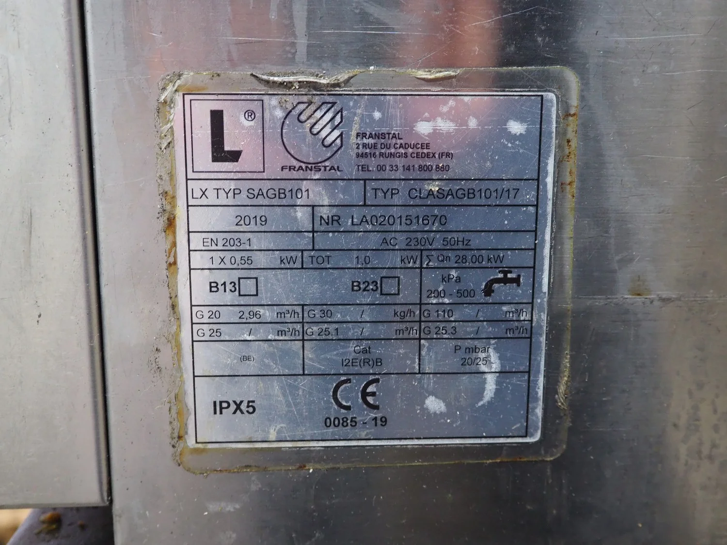 Franstal combi steamer, type: CLASAGB101/17, number: LA020151670, year of construction: 2019, 230 V, 50 Hz, 0.55/1 kW, dimensions: 950 mm x 900 mm x 1750 mm.