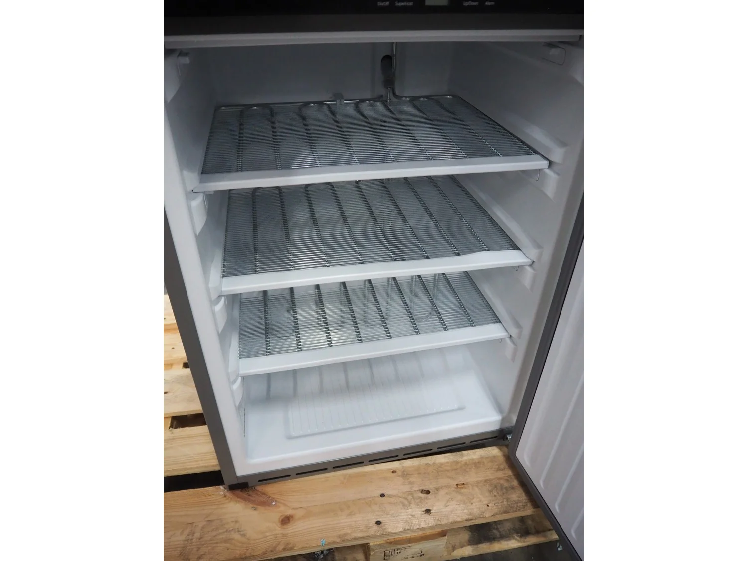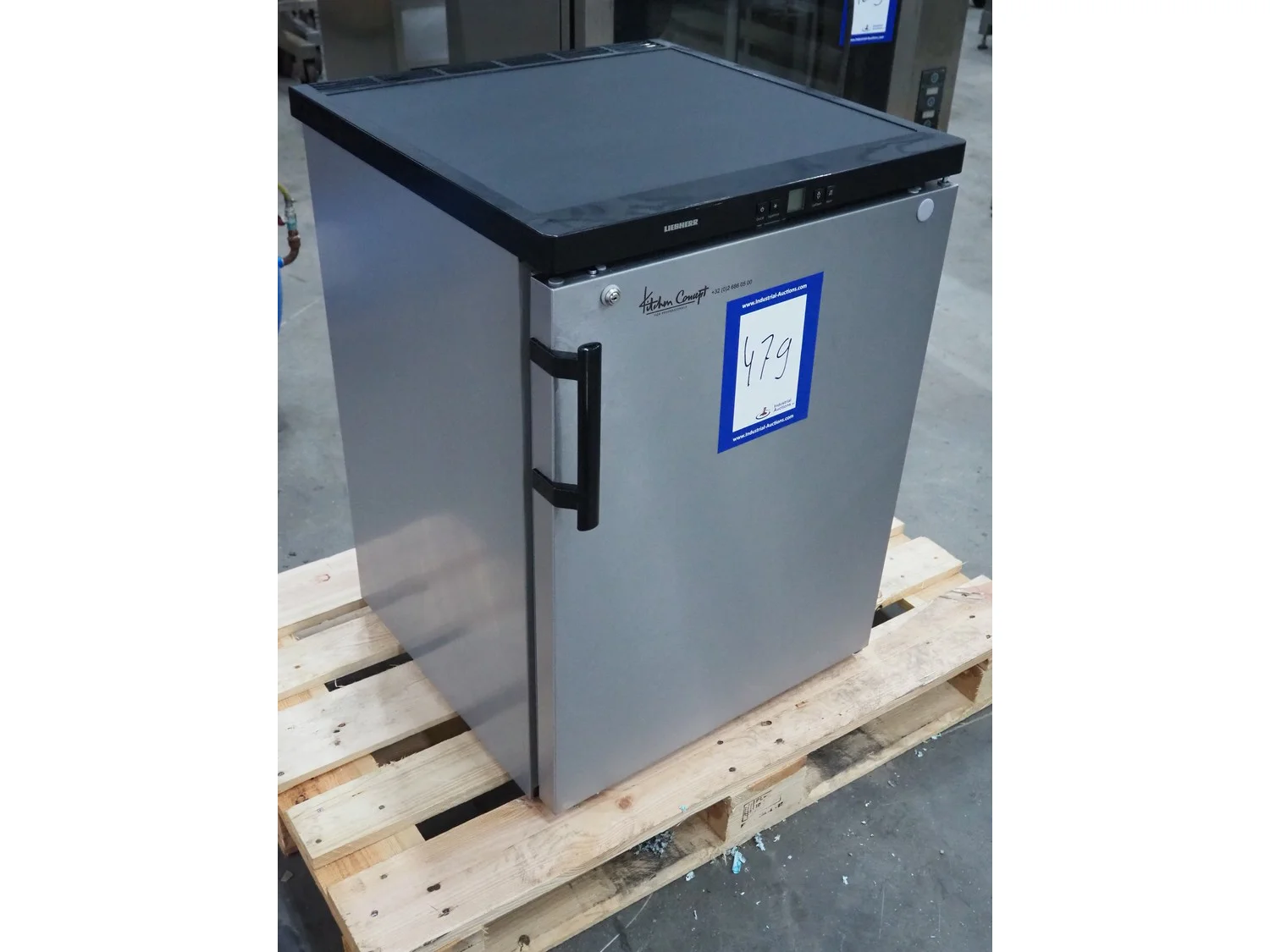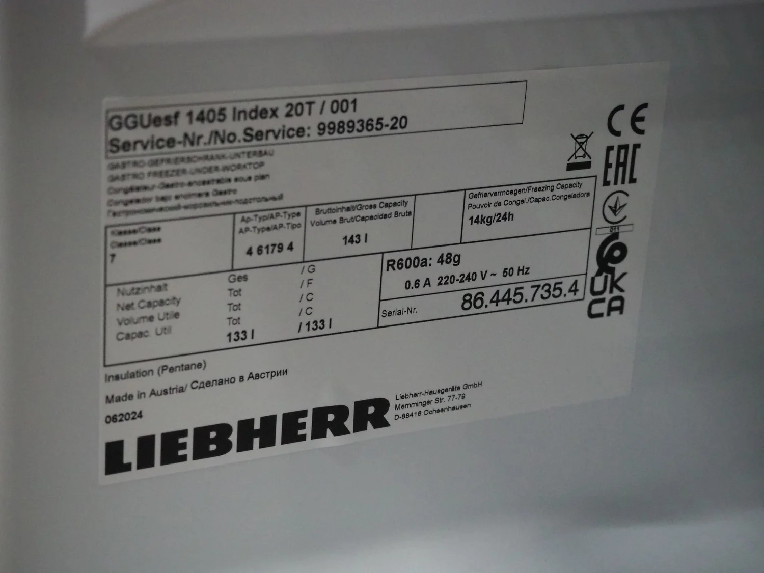 Liebherr shock freezer, serial number: 86.445.735.4, 220/240 V, 50 Hz, 0.6 A, 143 liter, refrigerant: R600a, 0.49 gram, 3 floors, floor dimensions: 470 mm x 430 mm, total dimensions: 650 mm x 600 mm x 850 mm.