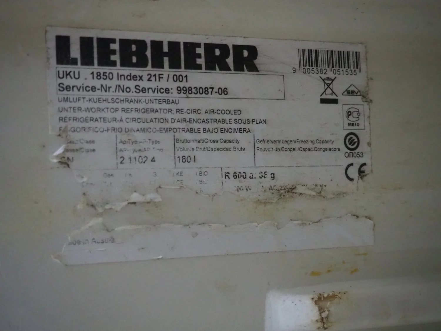 Liebherr refrigerator, model: 1850 Index 21F/001, serial number: 9983087-06, refrigerant: R600a/35 g, capacity: 180 liter, 2 floors, floor dimensions: 530 mm x 400 mm, total dimensions: 600 mm x 650 mm x 850 mm.