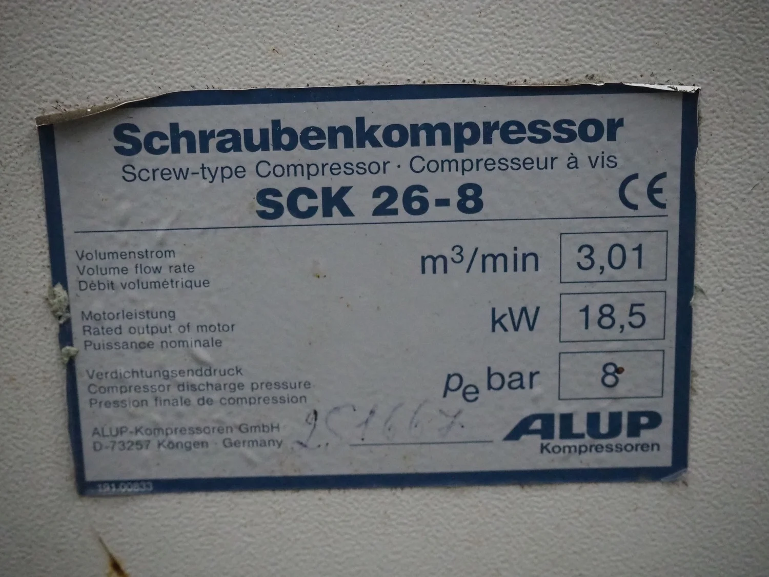 Alup Kompressoren screw compressor, model: SCK 26-8, 18.5 kW, volume flow rate: 3.01 m³/min, compressor discharge pressure: 8 pe bar, dimensions: 800 mm x 1300 mm x 1500 mm.