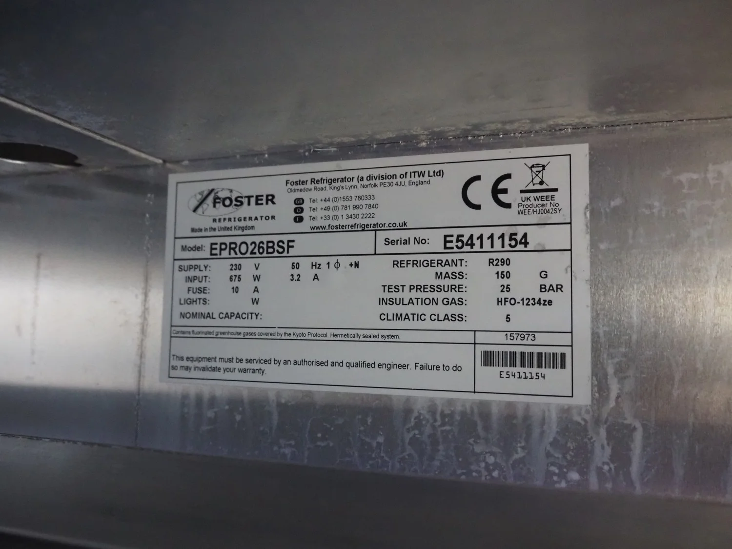 Foster mobile refrigerator, model: EPRO25BSF, serial number: E5411154, 230 V, 1 Ph, 50 Hz, 3.2 A, 675 Watt, refrigerant: R290, 150 gram, 16 floors, 5 plastic crates, crate dimensions: 760 mm x 450 mm x 90 mm, total dimensions: 700 mm x 930 mm x 2270 mm.