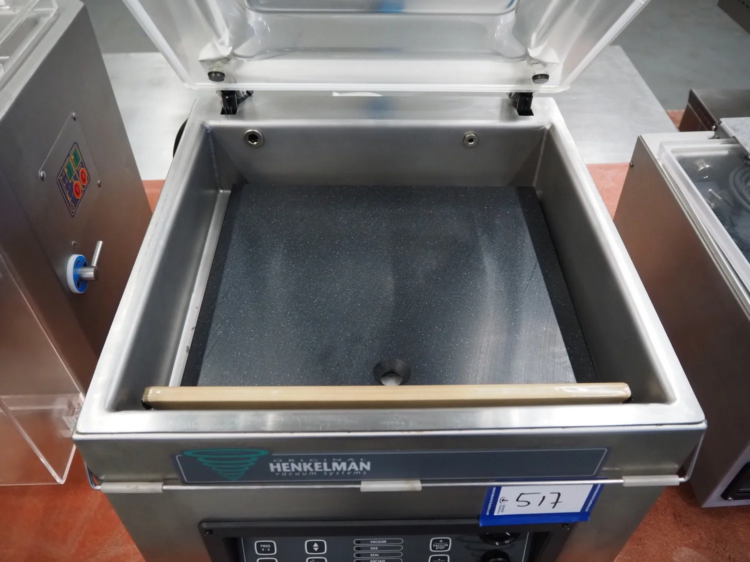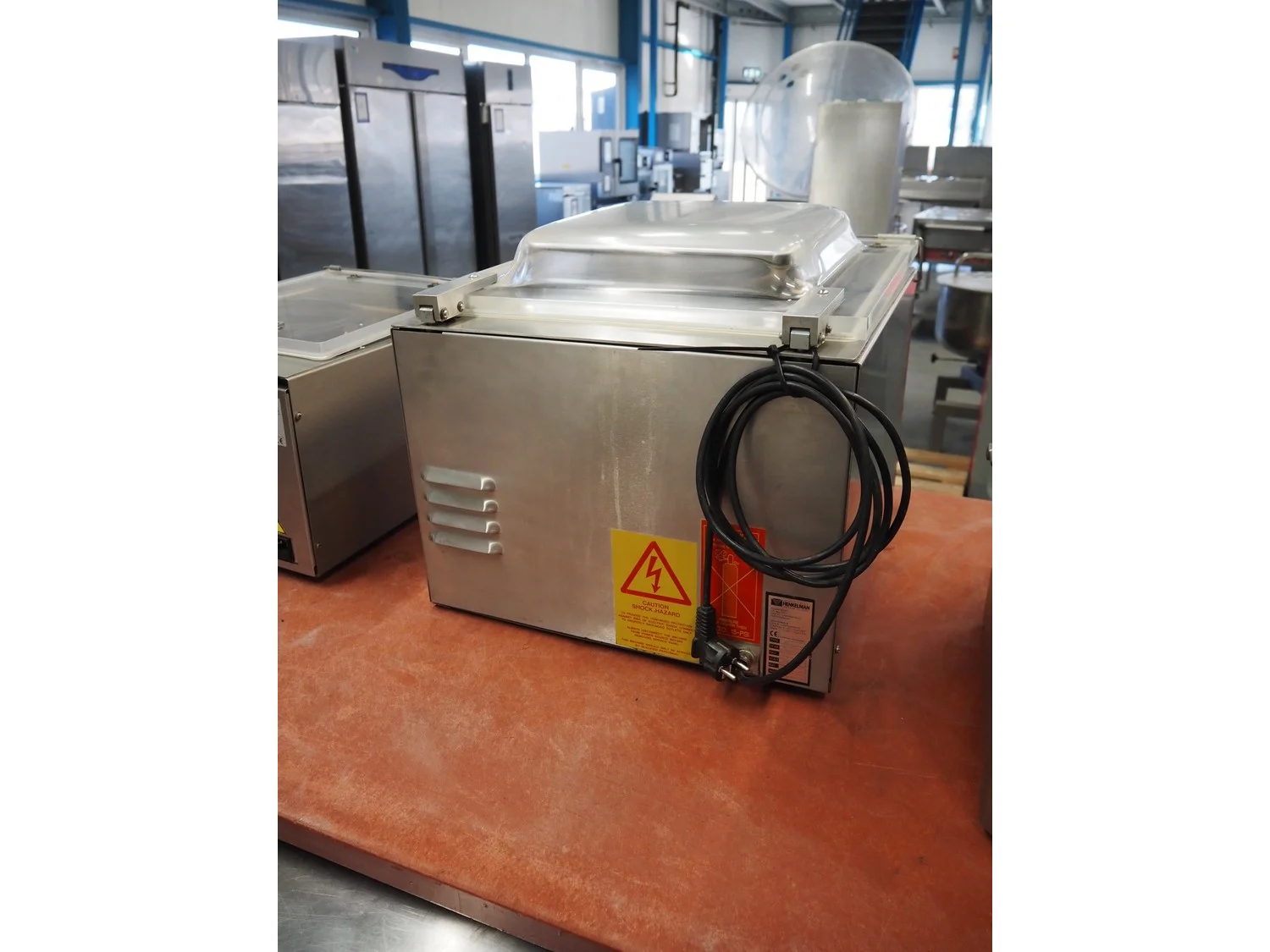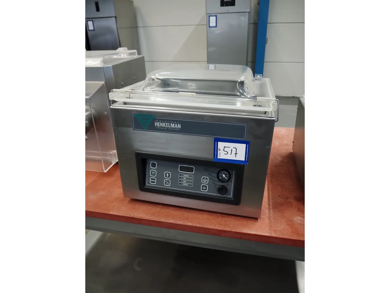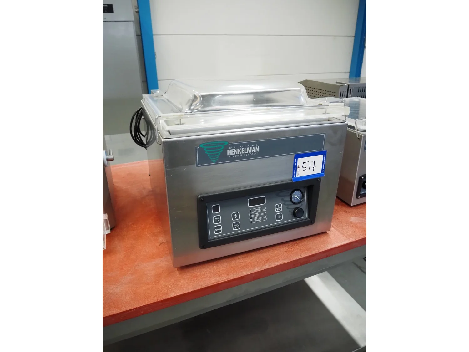 Henkelman vacuum machine, machine number: 20610283, year of construction: 1996, 230 V, 1 Ph, 50/60 Hz, 8 A, 1.6 kW, seal length: 410 mm, chamber dimensions: 425 mm x 4100 mm, total dimensions: 520 mm x 500 mm x 450 mm.