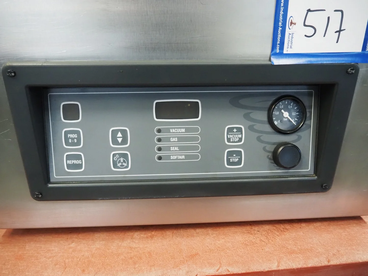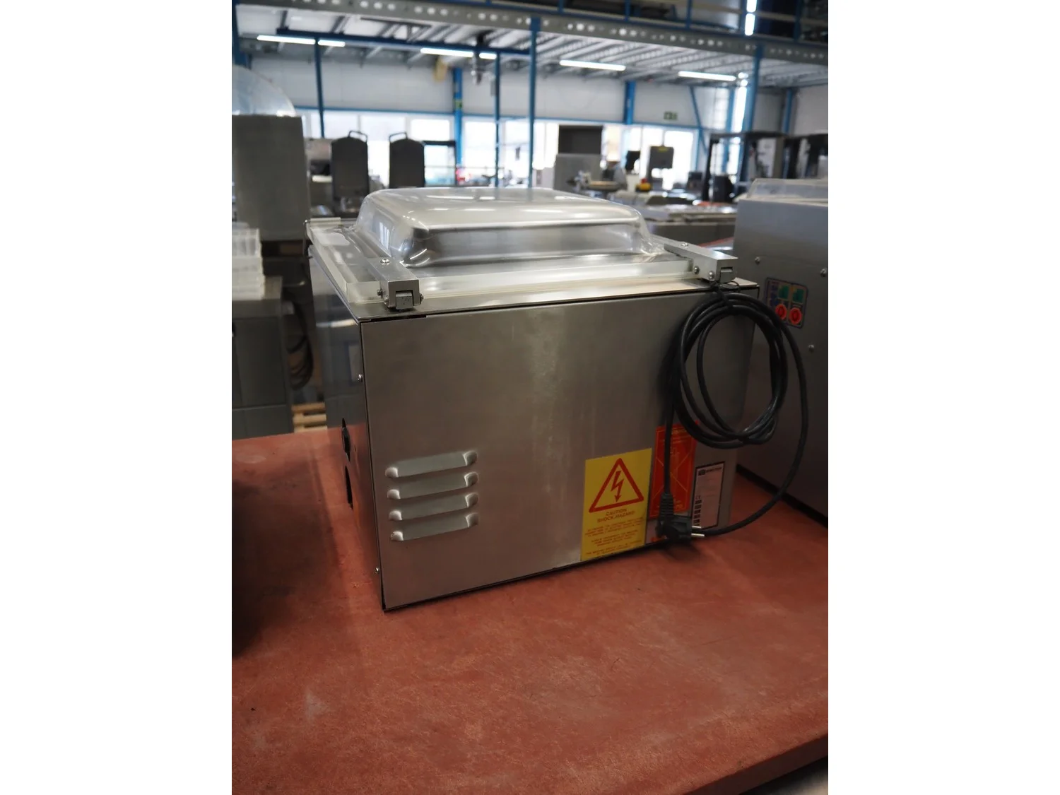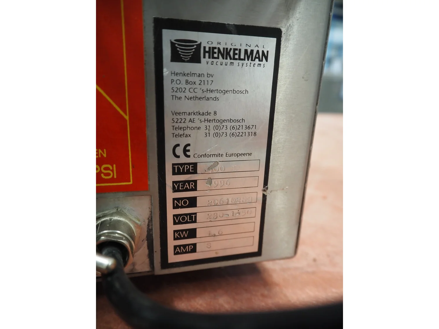 Henkelman vacuum machine, machine number: 20610283, year of construction: 1996, 230 V, 1 Ph, 50/60 Hz, 8 A, 1.6 kW, seal length: 410 mm, chamber dimensions: 425 mm x 4100 mm, total dimensions: 520 mm x 500 mm x 450 mm.