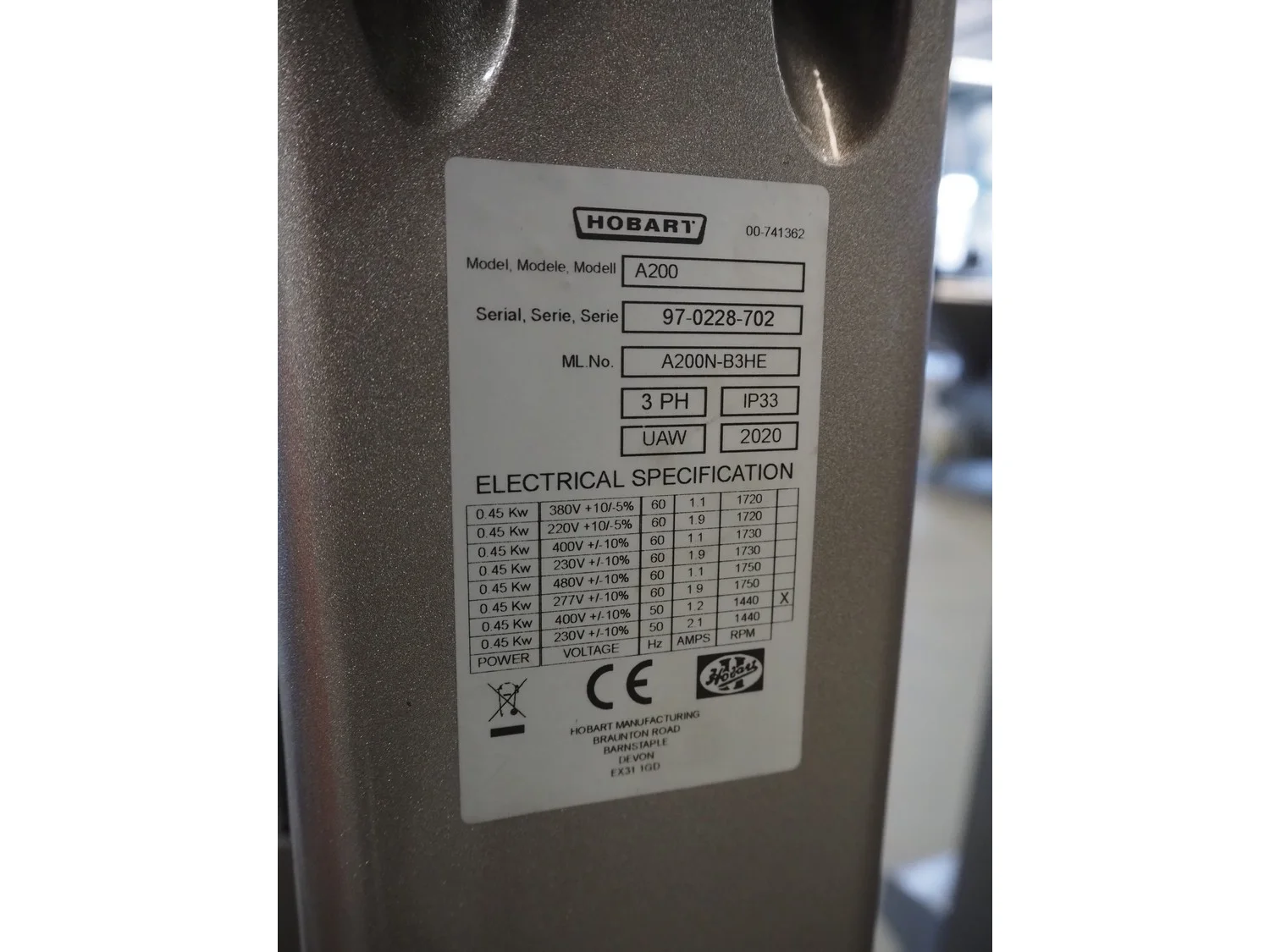 Hobart mixer, model: A200, serial number: 97-0228-702, 400 V, 50 Hz, 1.2 A, 0.45 kW, dimensions: 400 mm x 450 mm x 900 mm. Including mixing arm.