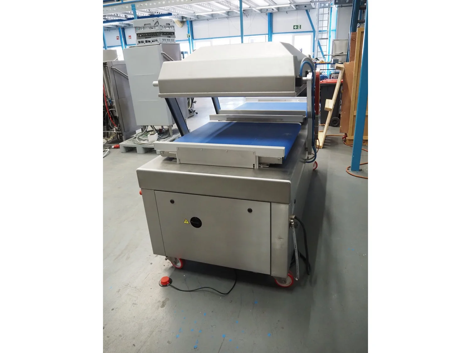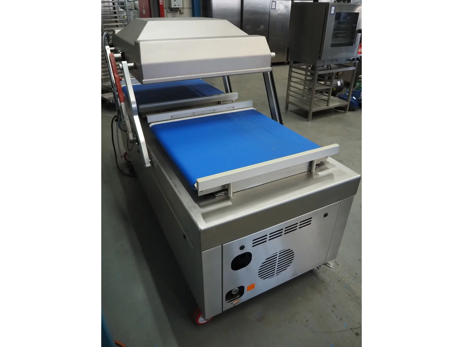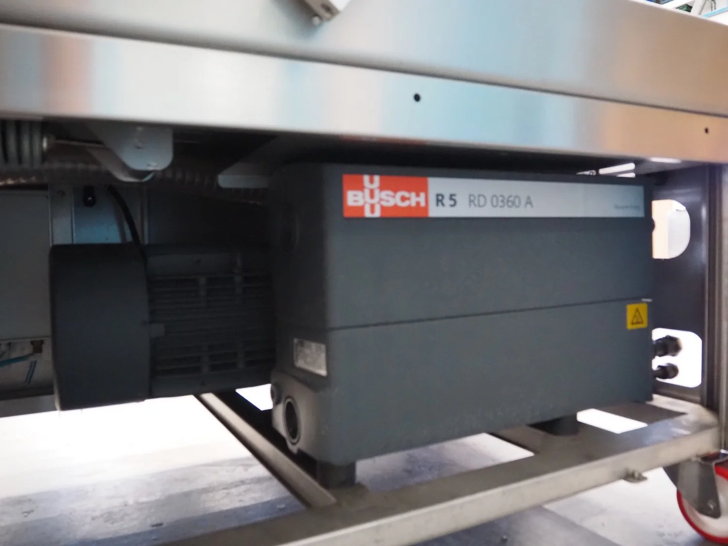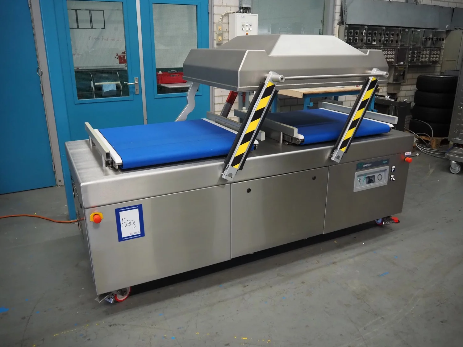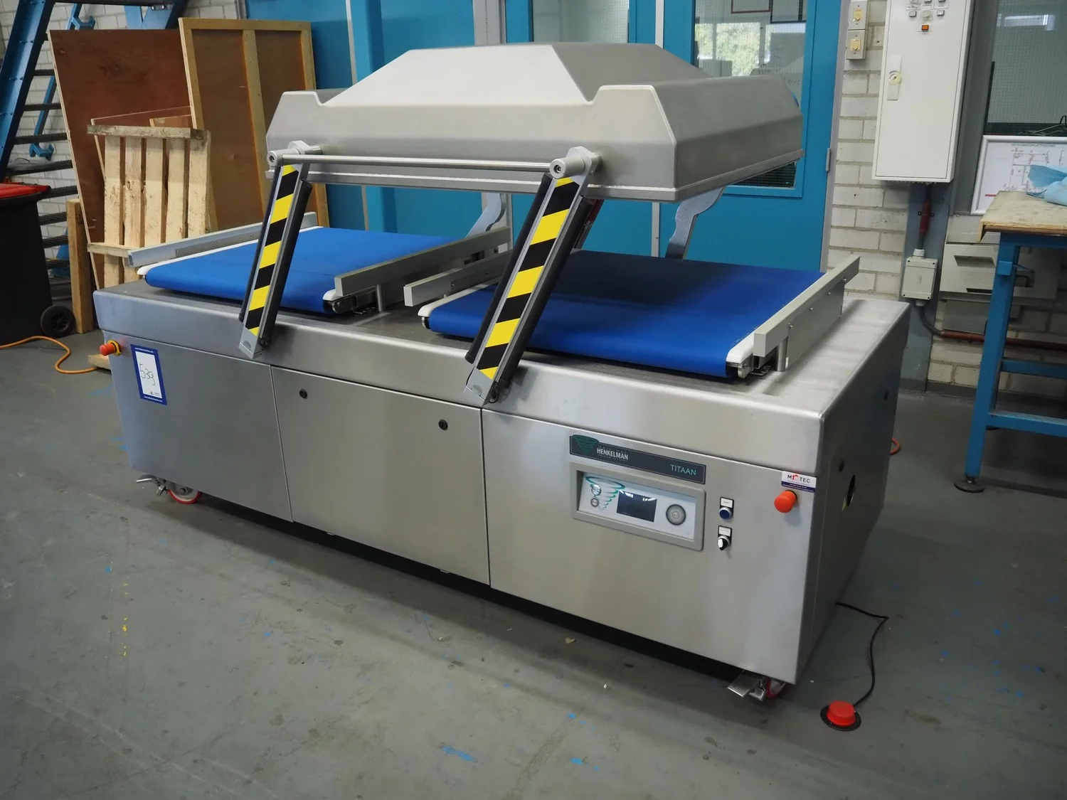 Henkelman mobile double chamber vacuum machine, type: Titaan 2-90, machine number: HTN10190004, year of construction: 2019, 400 V, 3 Ph, 50 Hz, 5.5 kW, seal length: (4x) 850 mm, chamber dimensions: (2x) 850 mm x 900 mm, working hours: 46:32, Busch vacuum pump, type: RD 0360 A 5H3, capacity: 300 m³ per hour, total dimensions: 2500 mm x 1200 mm x 1150 mm.
