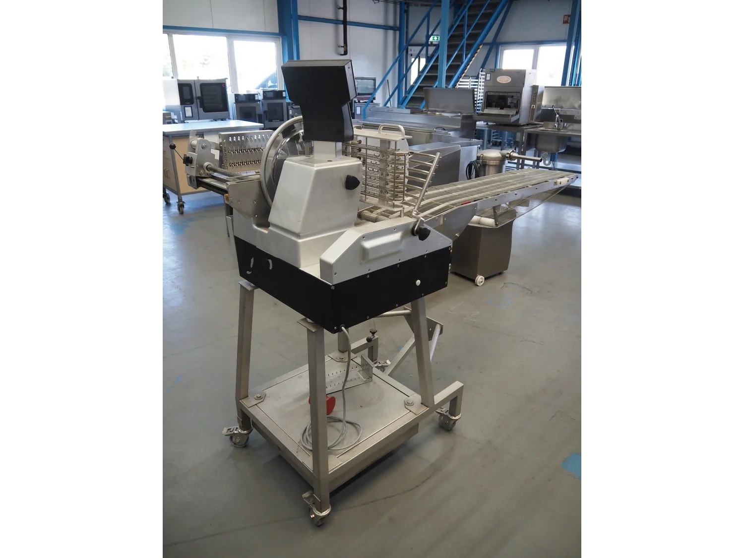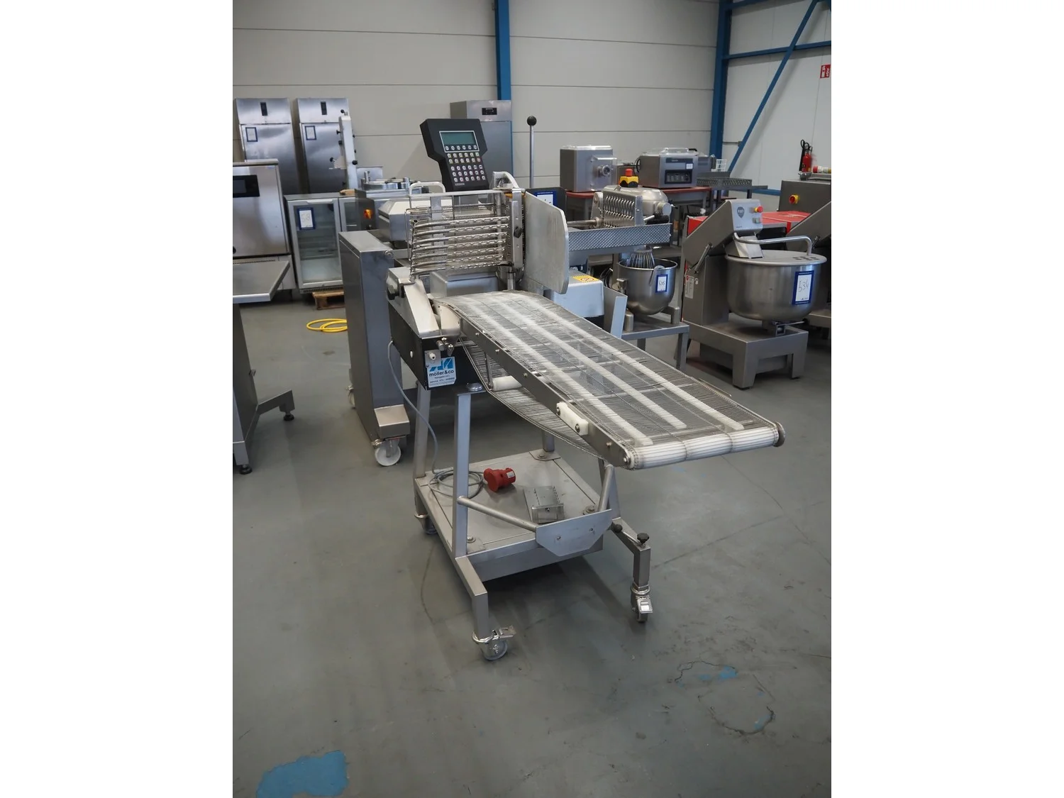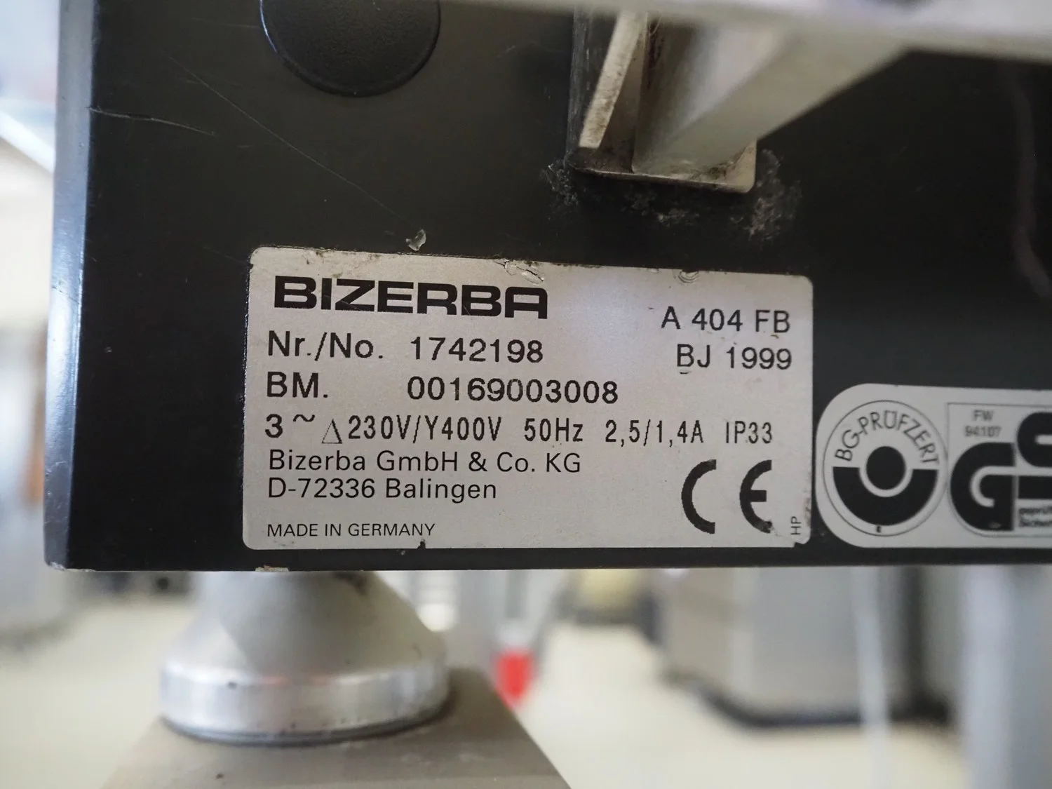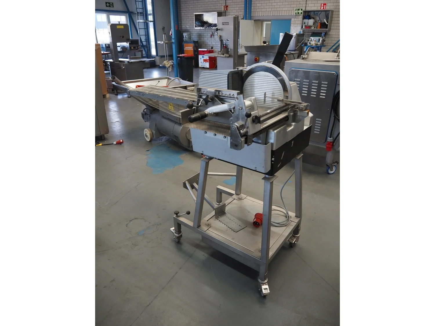 Bizerba mobile automatic slicer, model: A 404 FB, number: 1742198, year of construction: 1999, 230/400 V, 3 Ph, 50 Hz, 2.5/1.4 A, s/s mesh outfeed belt, belt width: 250 mm, total dimensions: 1700 mm x 1000 mm x 1600 mm.