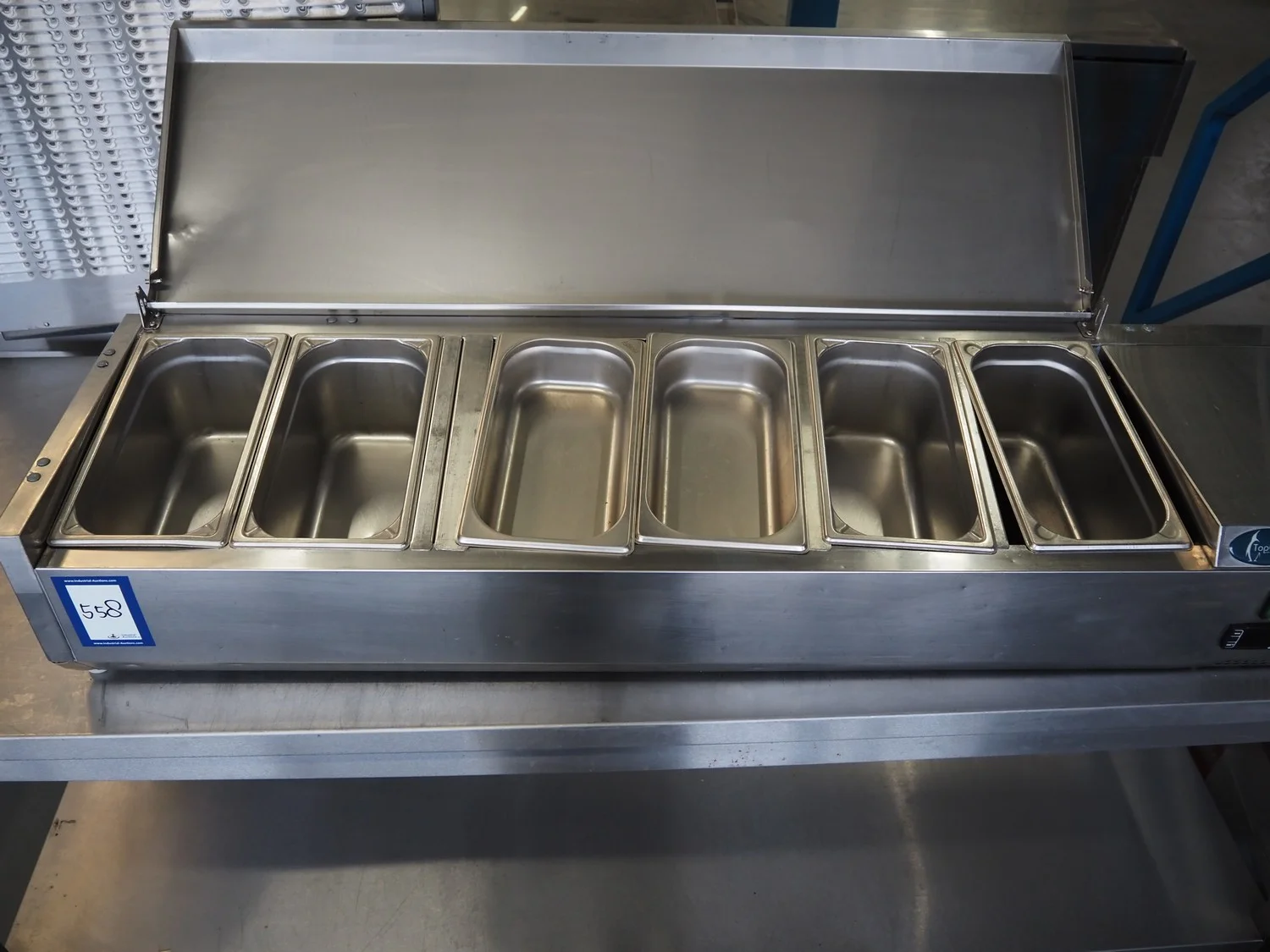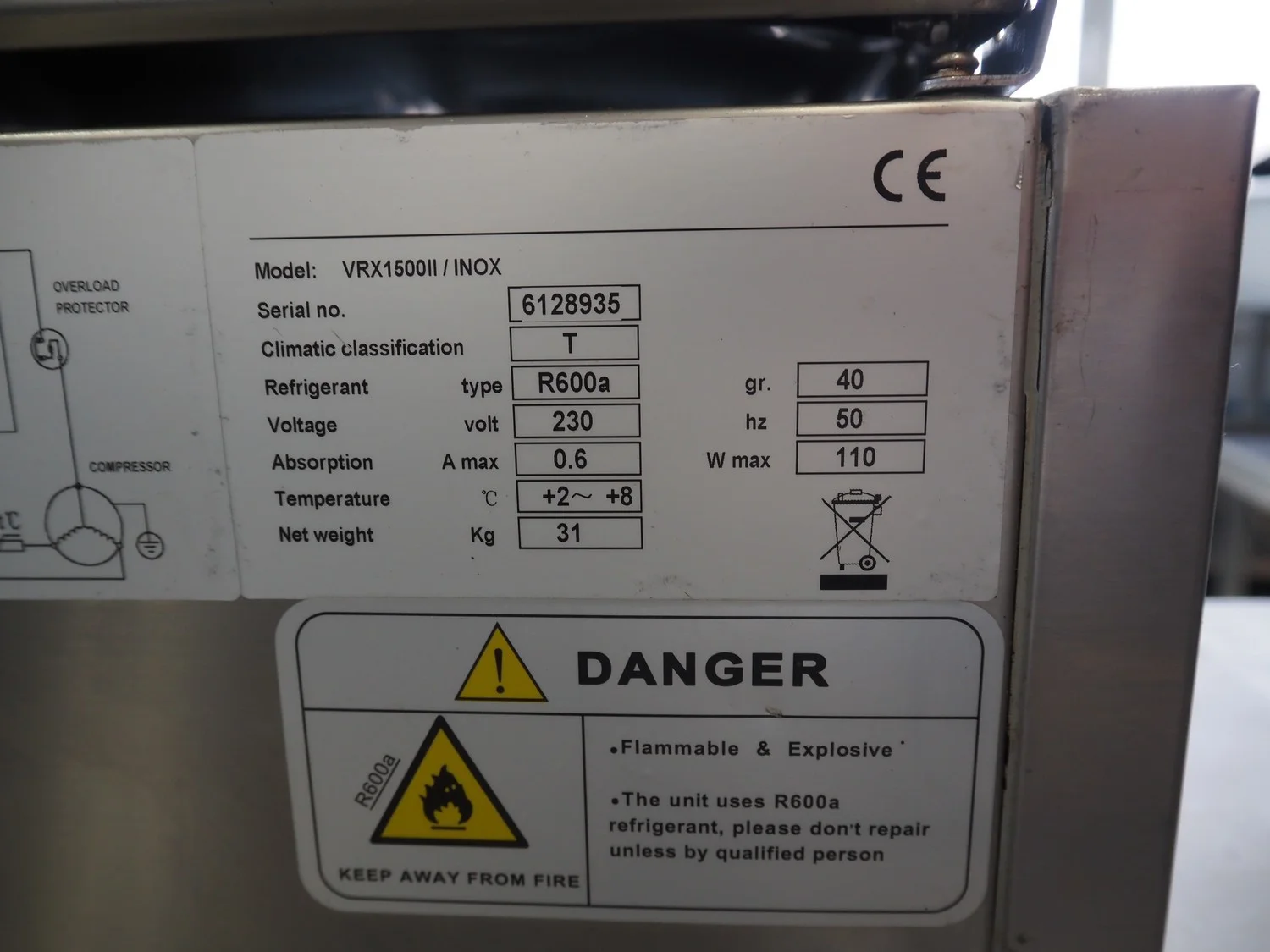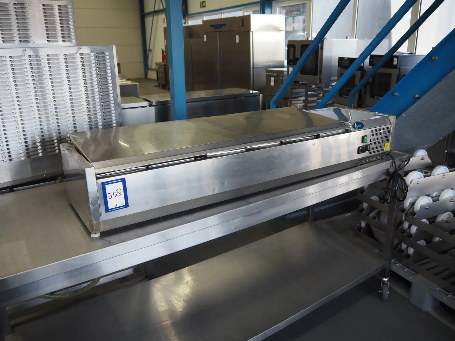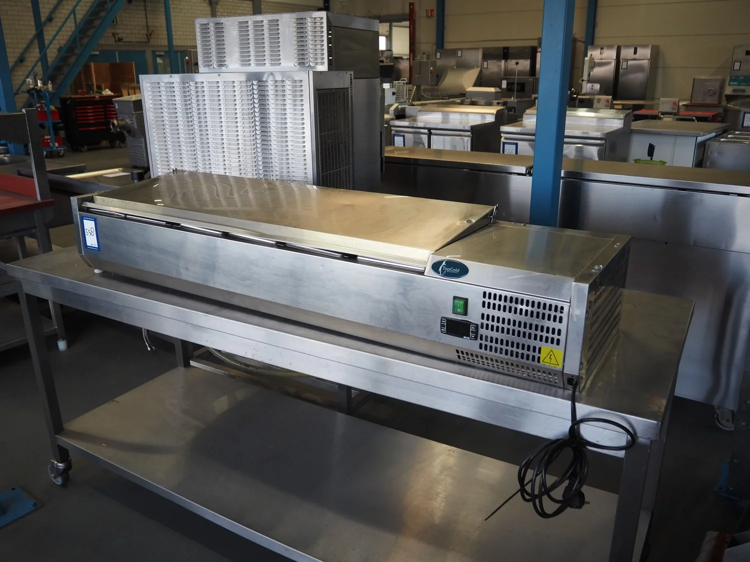Topcold refrigerated showcase, model: VRX1500II/INOX, serial number: 6128935, year of construction: 07.2016, 230 V, 50 Hz, 0.6 A, 110 W, weight: 31 kg, refrigerant: R600a, dimensions: 1500 mm x 400 mm x 1280 mm.