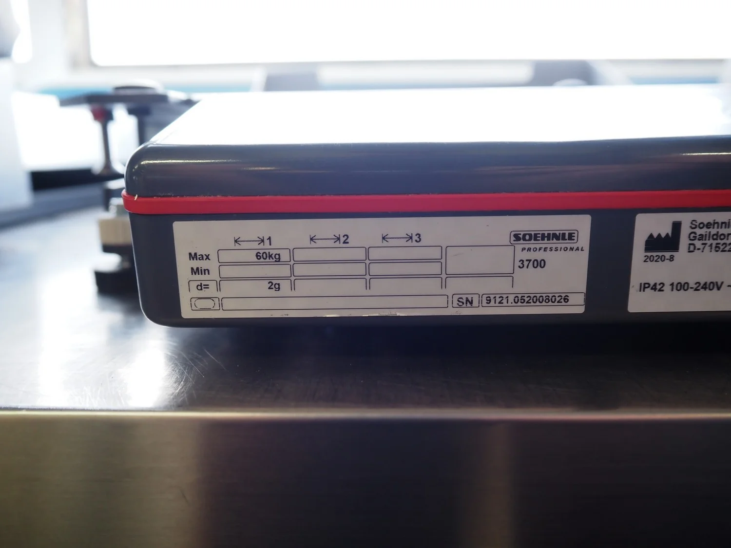 Soehnle weighing scale with indicator, model: 3700, serial number: 9121.052008026, 100-240 V, 50-60 Hz, maximum weight: 60 kg, d= 2 gram, dimensions: 400 mm x 380 mm x 80 mm.