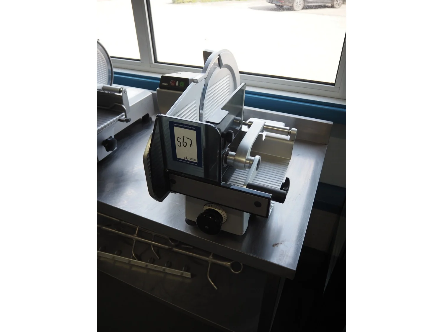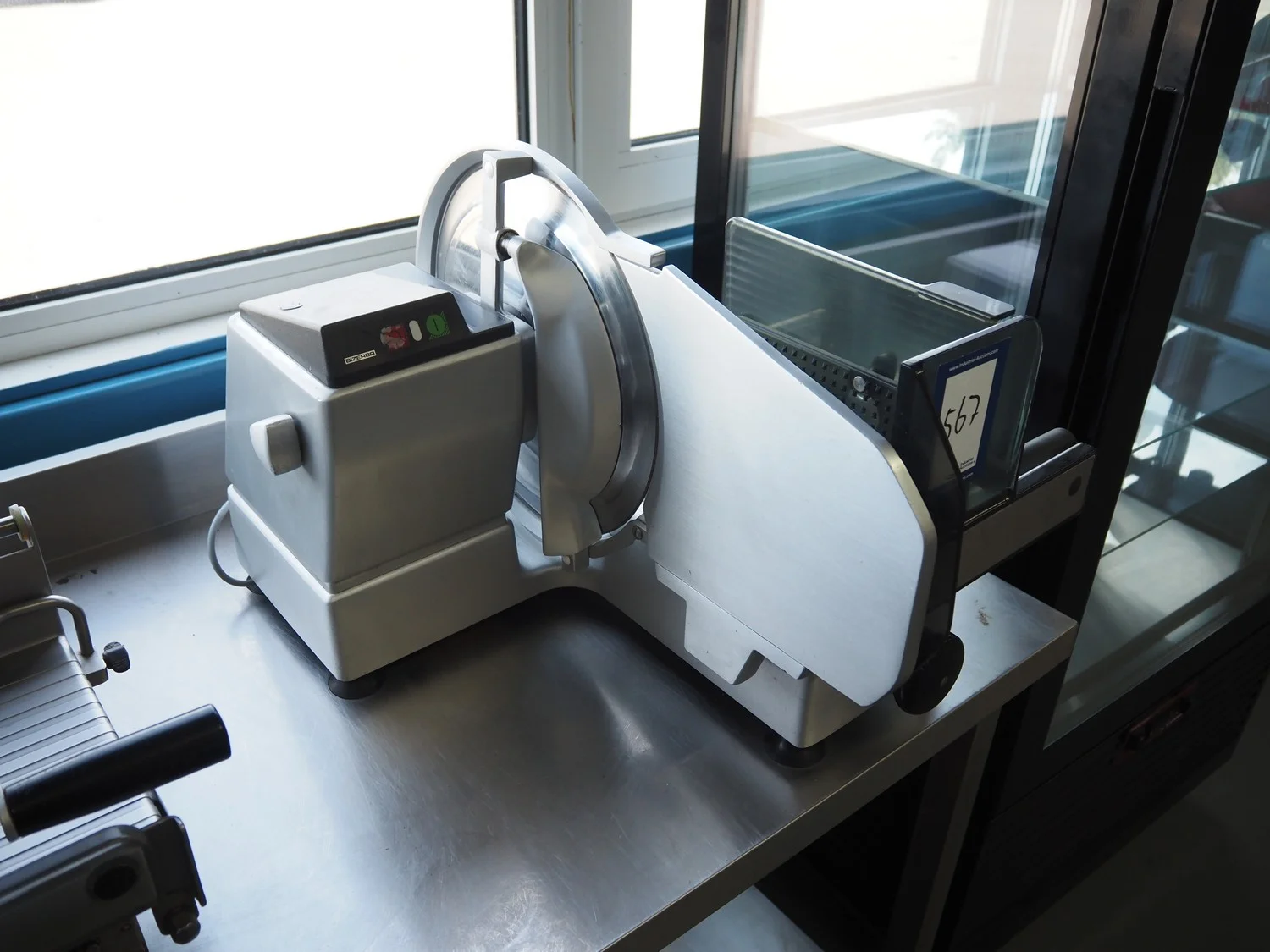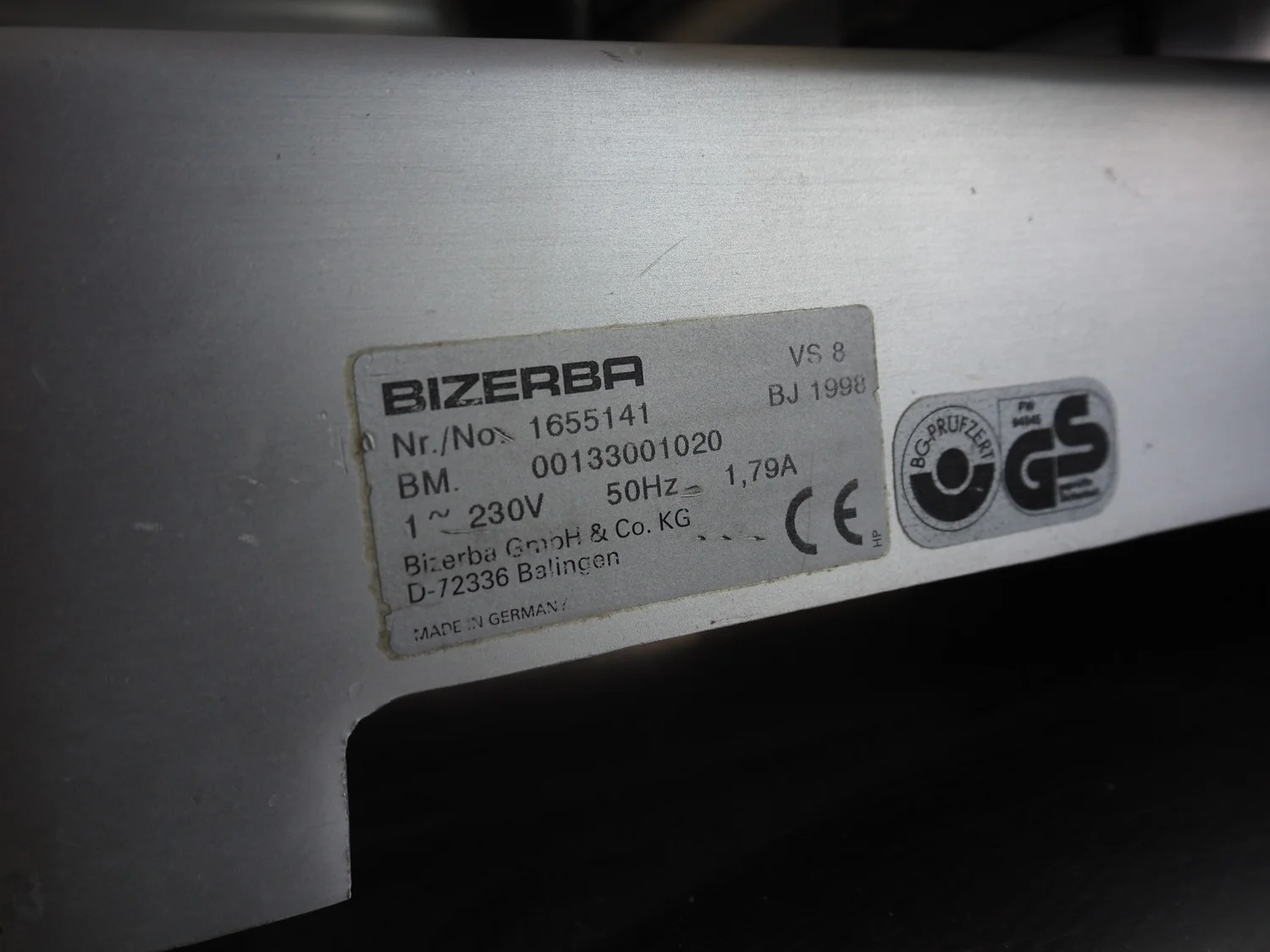 Bizerba slicer, type: VS 8, number: 1655141, year of construction: 1998, 230 V, 1 Ph, 50 Hz, 1.79 A, dimensions: 655 mm x 530 mm x 430 mm.