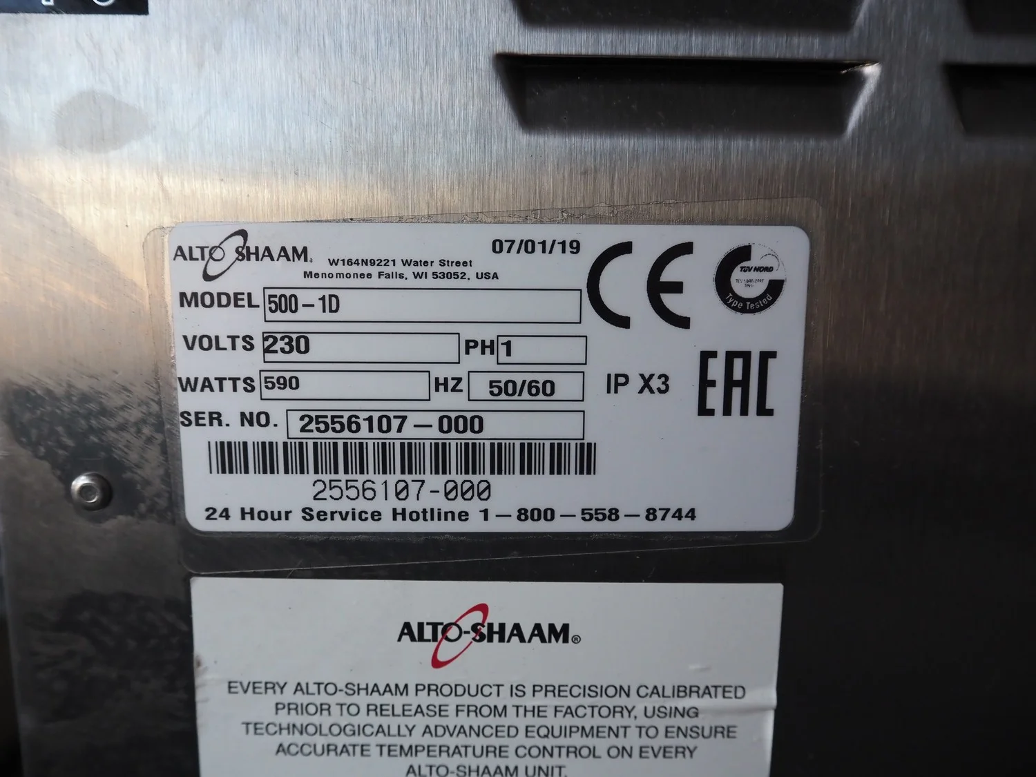 Alto-Shaam heated cabinet, model: 500-1D, serial number: 2556107-000, year of construction: 2019, 230 V, 1 Ph, 50/60 Hz, 590 Watt, dimensions: 620 mm x 600 mm x 300 mm.