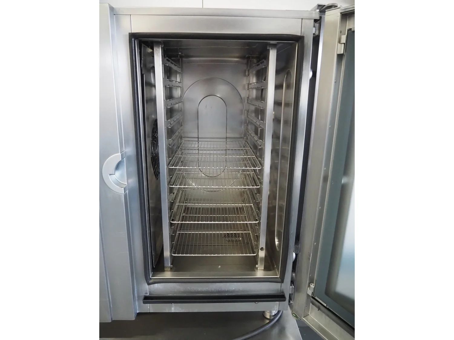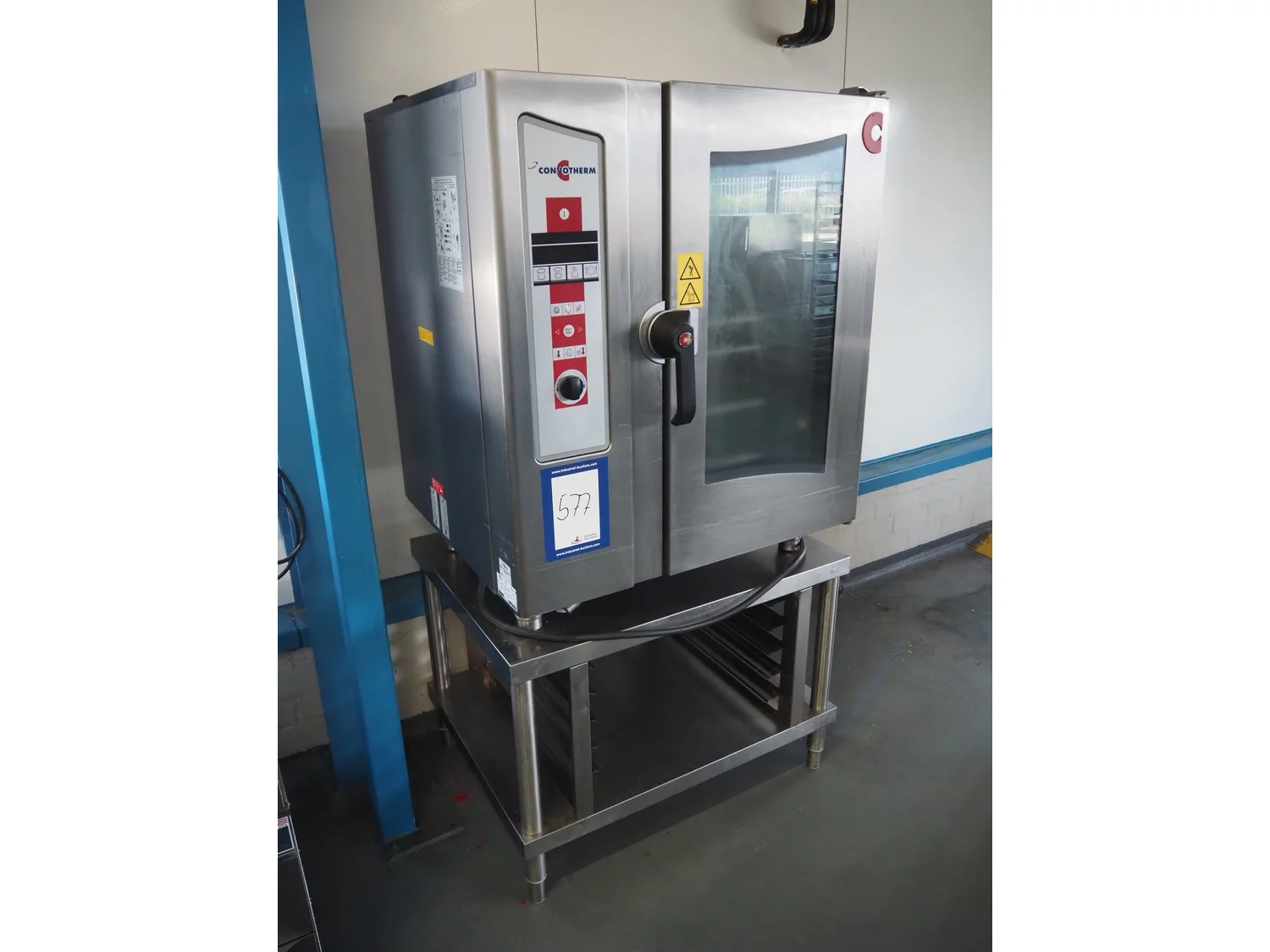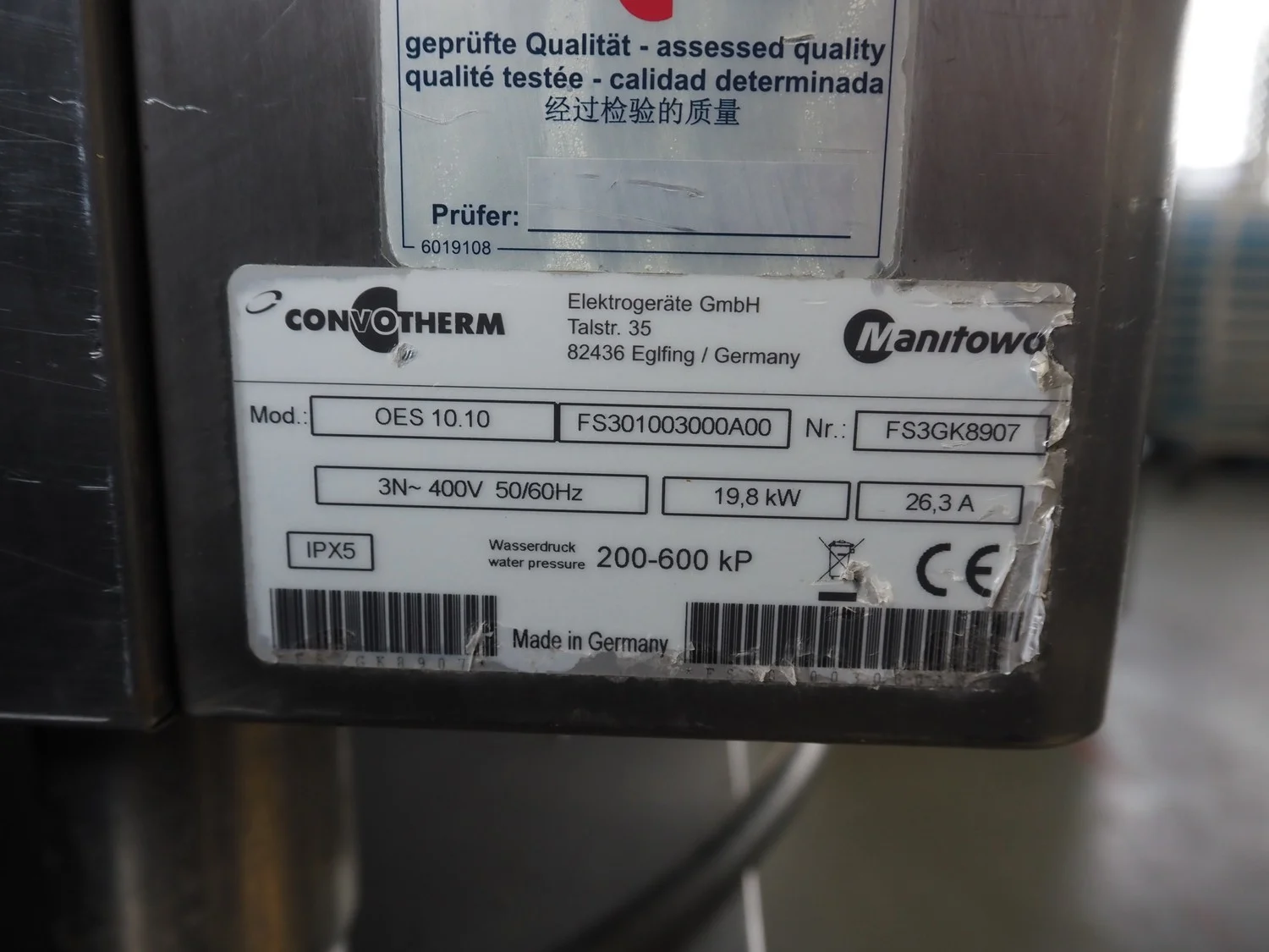 Convotherm combi steamer, type: OES 10.10, number: FS301003000A00, 400 V, 3 Ph, 50/60 Hz, 26.3 A, 19.8 kW, 11 floors, dimensions floor: (11x) 530 mm x 320 mm, total dimensions: 900 mm x 930 mm x 1800 mm.