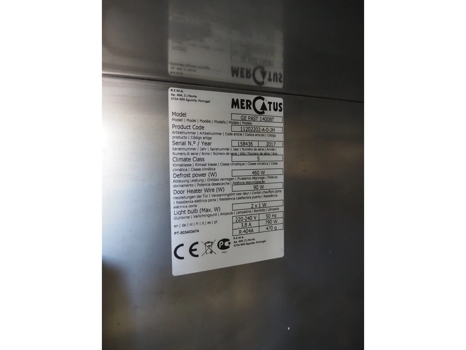 Mercatus refrigerator, model: GE PAST 1400BT, serial number: 158436, year of construction: 2017, 220-240 V, 50 Hz, 3.8 A, 790 W, refrigerant: R-404A, (2x) 17 floors, dimensions each floor: 600 mm x 400 mm, total dimensions: 1440 mm x 850 mm x 2050 mm.
