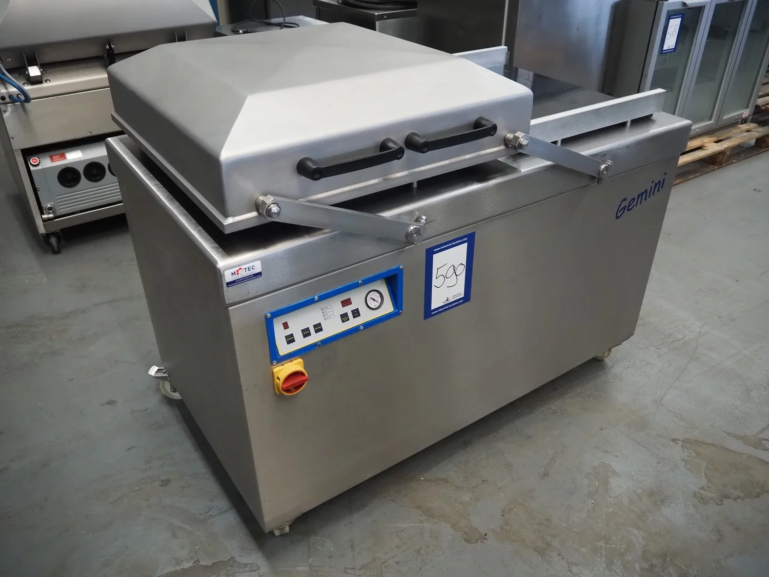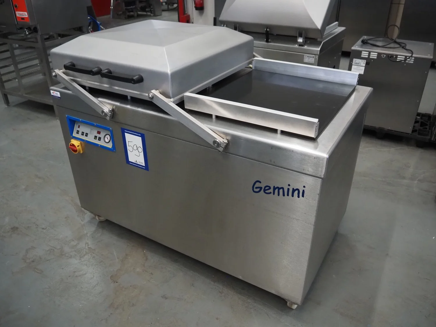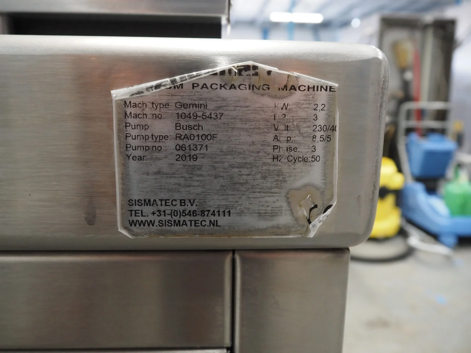 Stephanal Alvac mobile double chamber vacuum machine, type: Gemini, machine number: 1049-5437, year of construction: 2019, 230/400 V, 3 Ph, 50 Hz, 8.5/5 A, 2.2 kW, seal length: (4x) 550 mm, chamber dimensions: 615 mm x 550 mm, Busch vacuum pump, type: RA 0100 F 5R3, serial number: D18061371, capacity: 100 m³ per hour, total dimensions: 1500 mm x 500 mm x 1500 mm.