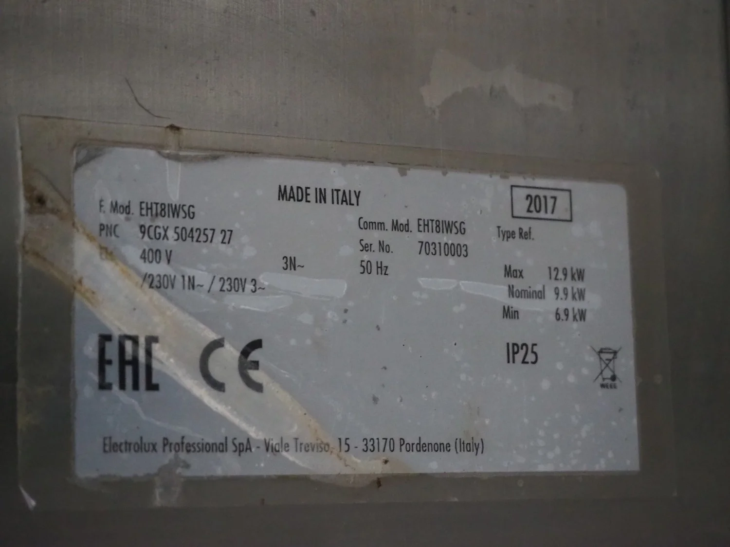 Electrolux dishwasher, model: EHT8IWSG, serial number: 70310003, year of construction: 2017, 400/230 V, 3/1 Ph, 50 Hz, 12.9/9.9/6.9 kW, inside dimensions: 500 mm x 500 mm x 440 mm, total dimensions: 760 mm x 900 mm x 1550 mm.