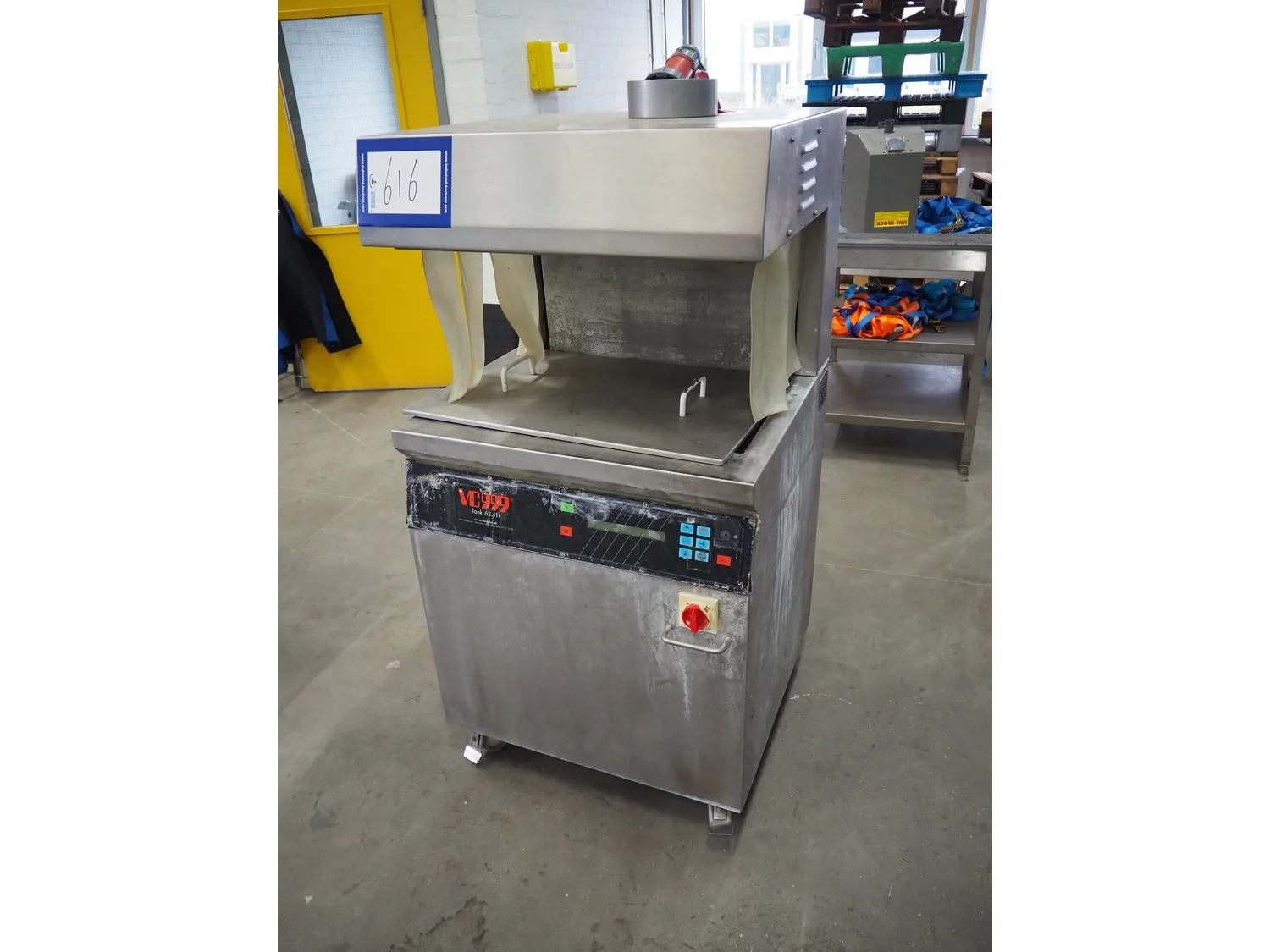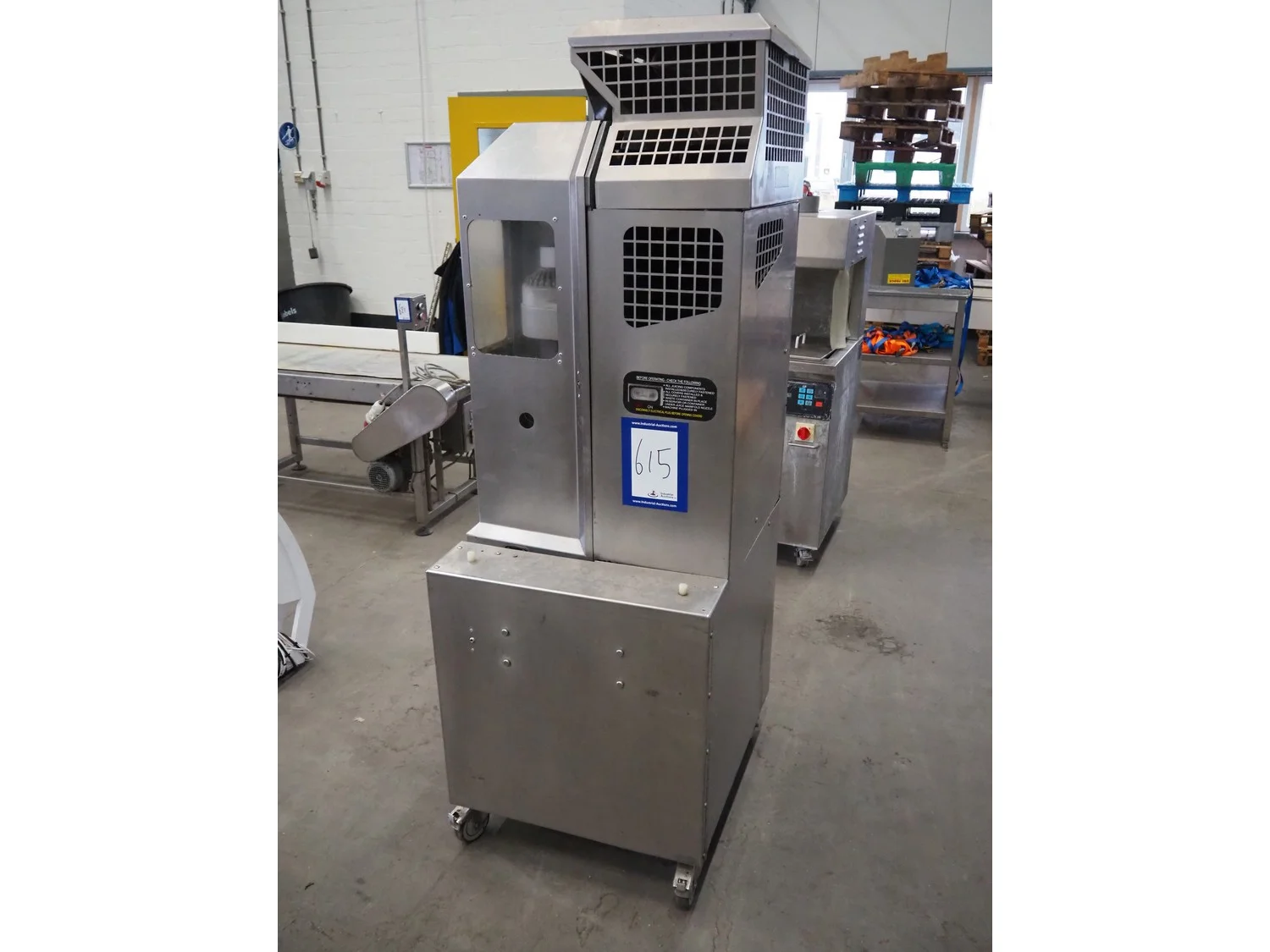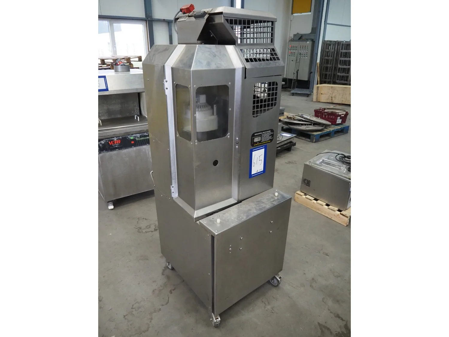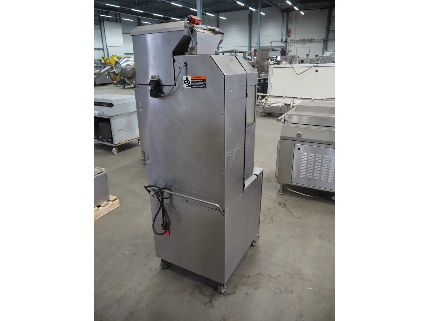 FMC FoodTech mobile multi-fruit juicer, model: POS-1, serial number: 82005006, 220 V, 1 Ph, 50 Hz, 10 A, dimensions: 850 mm x 550 mm x 1860 mm.
