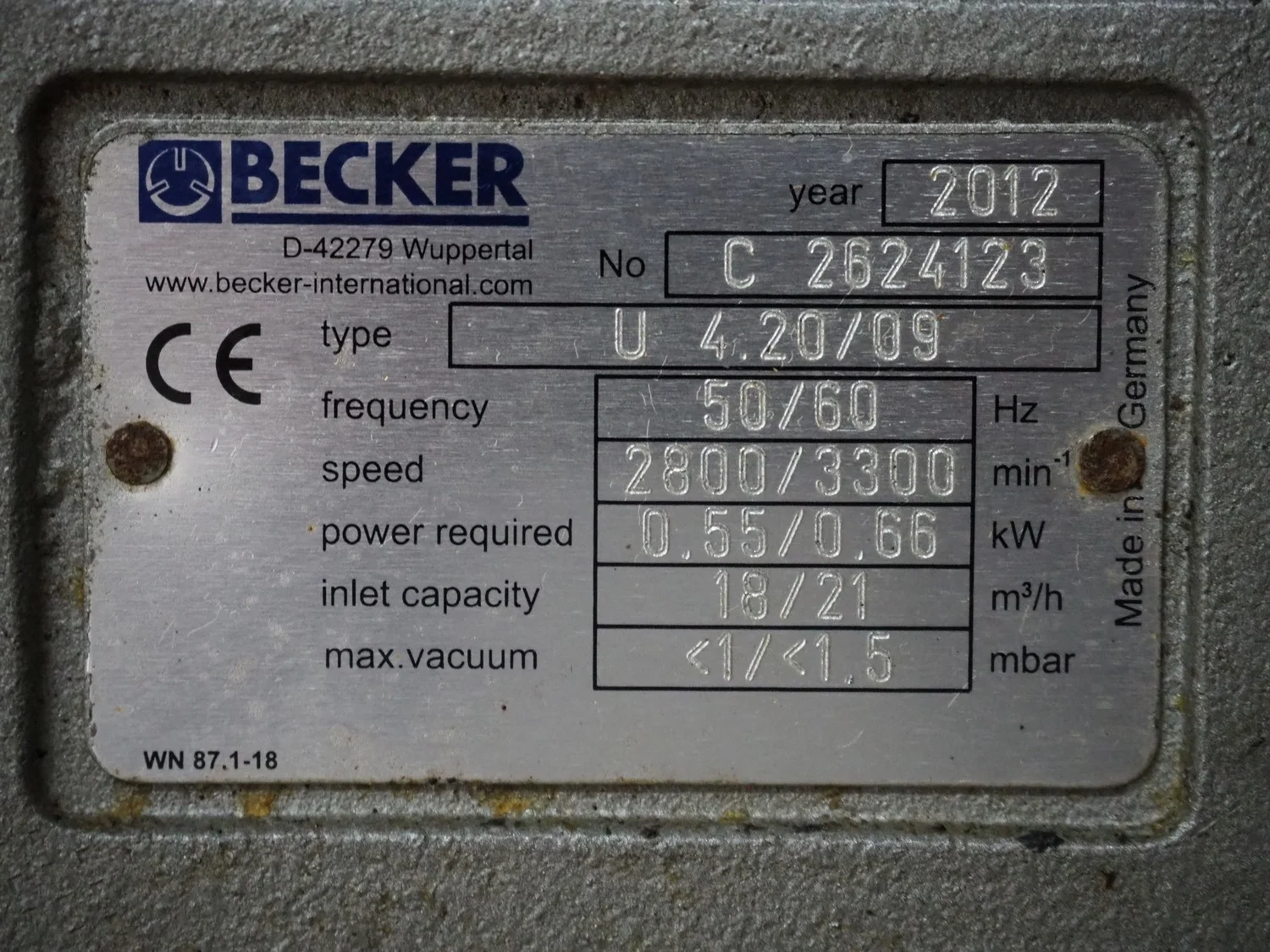 Günther cooled vacuum tumbler, type: GPA 300K, machine number: 30342, year of construction: 2007, 400 V, 16 A, 2.5 kW, Becker vacuum pump, type: U 4.20/09, dimensions: 2100 mm x 1750 mm x 1630 mm.