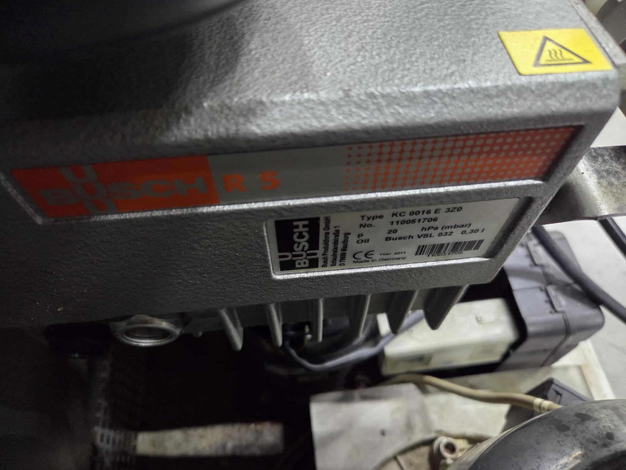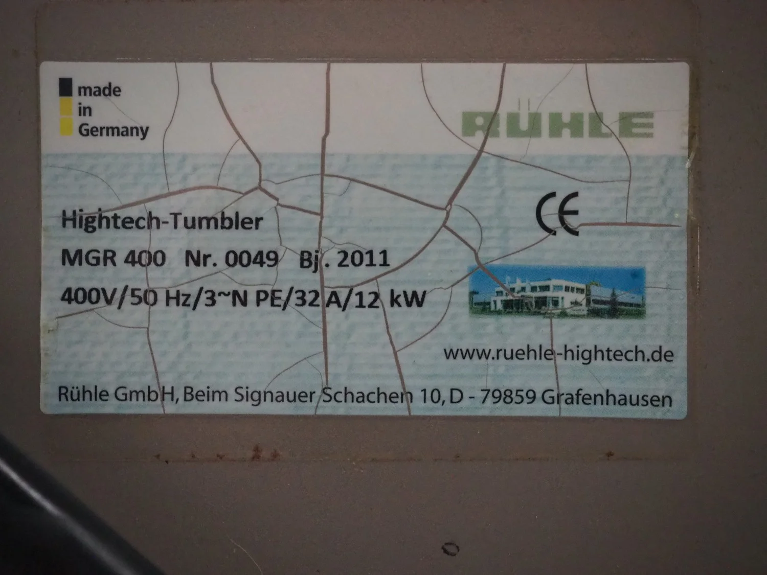 Rühle cooled vacuum tumbler, type: MGR 400, number: 0049, year of construction: 2011, 400 V, 3 Ph, 50 Hz, 32 A, 12 kW, Busch vacuum pump, type: KC 0016 E 3Z0, capacity: 16 m³ per hour, dimensions: 2100 mm x 2100 mm x 1950 mm.