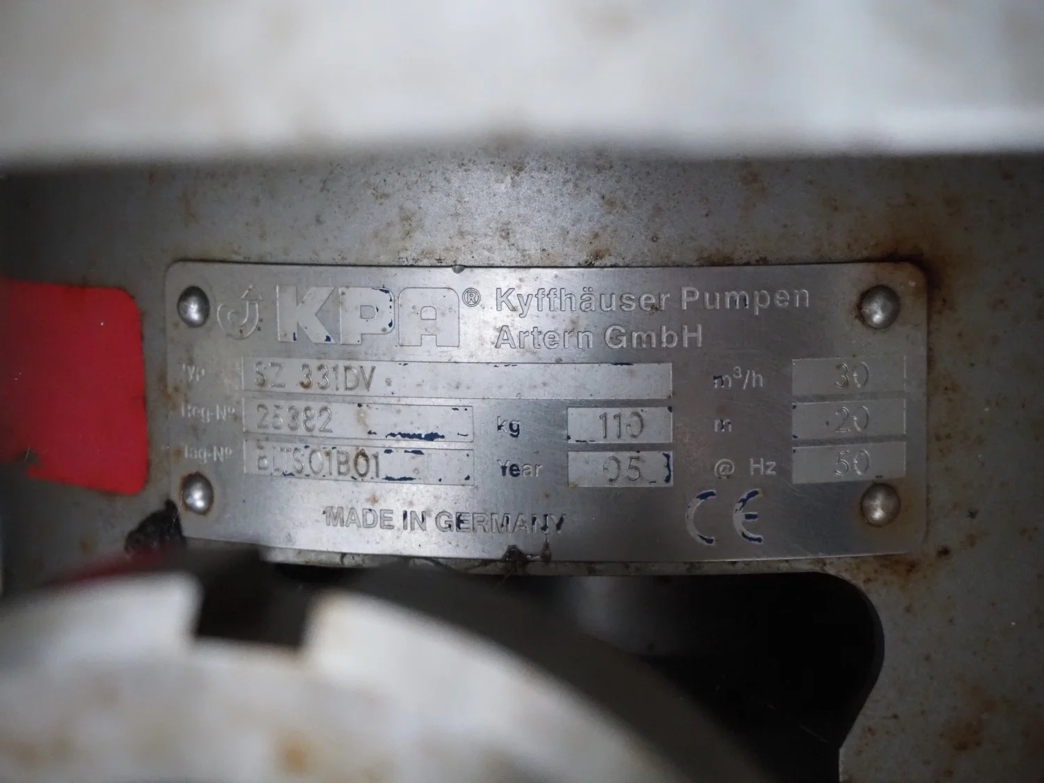 KPA centrifugal pump, type: SZ 331DV, number: 25382, year of construction: 2005, weight: 110 kg, capacity: 30000 liter per hour, dimensions: 800 mm x 350 mm x 450 mm.