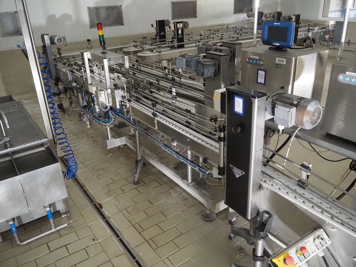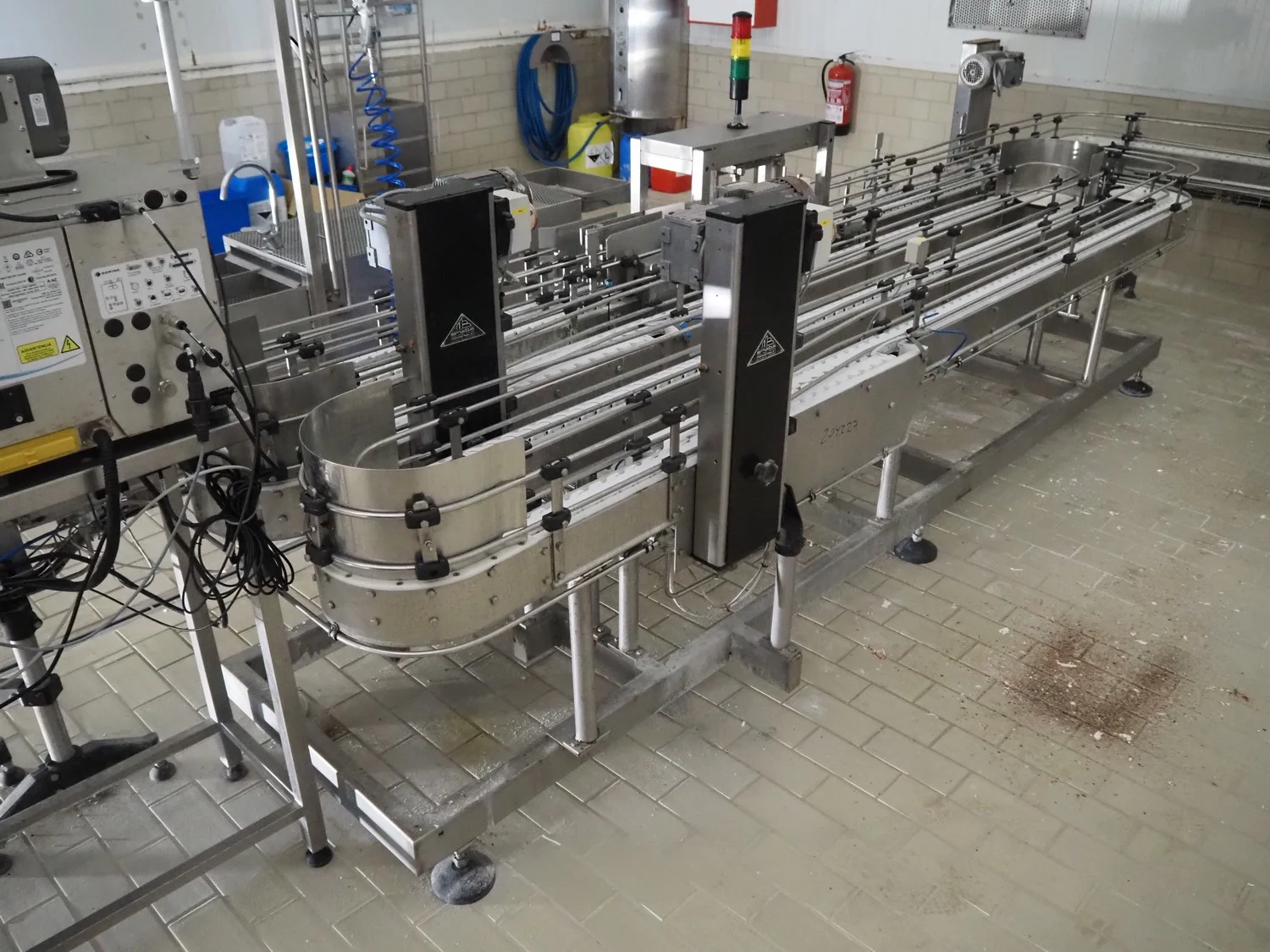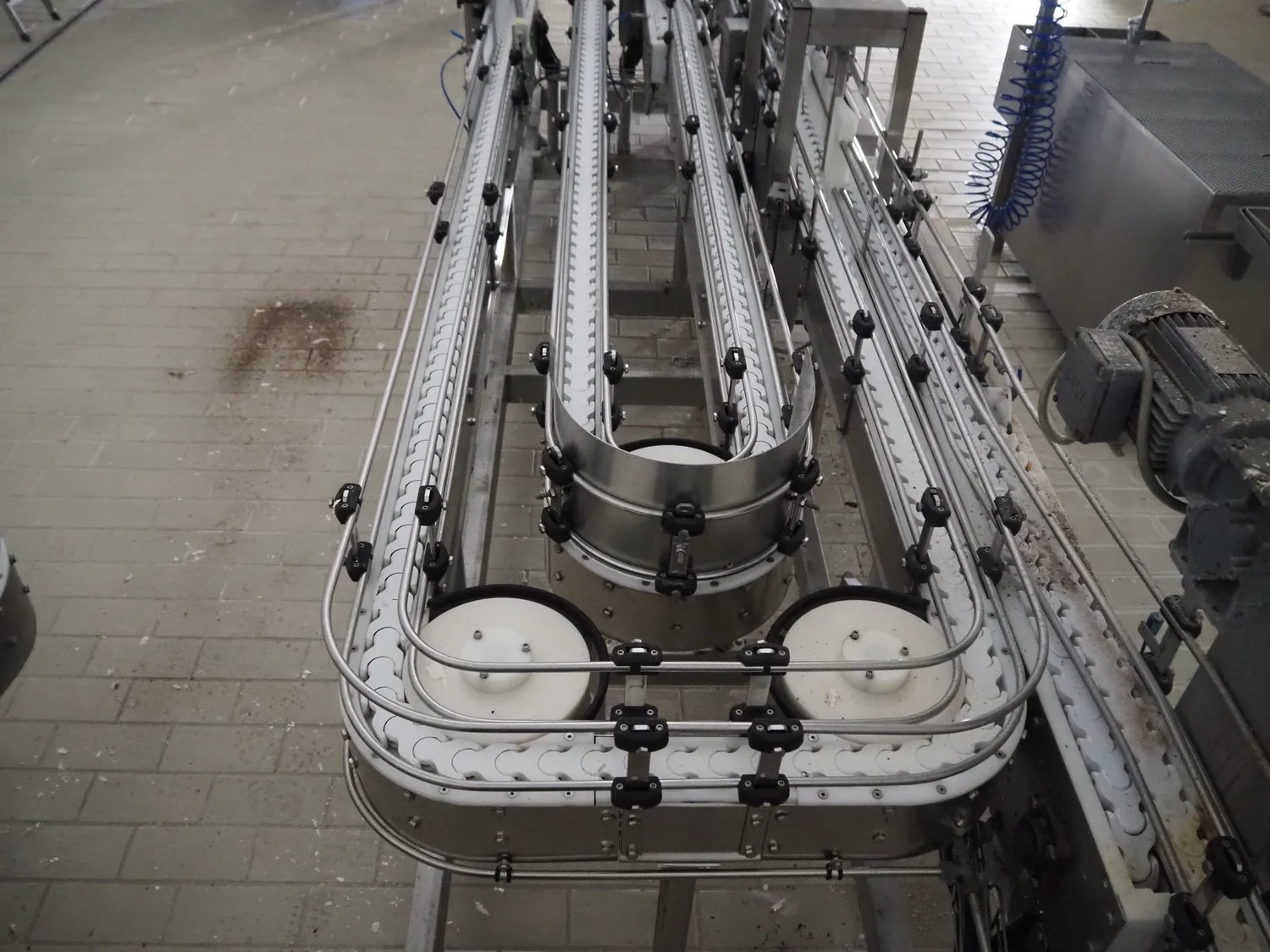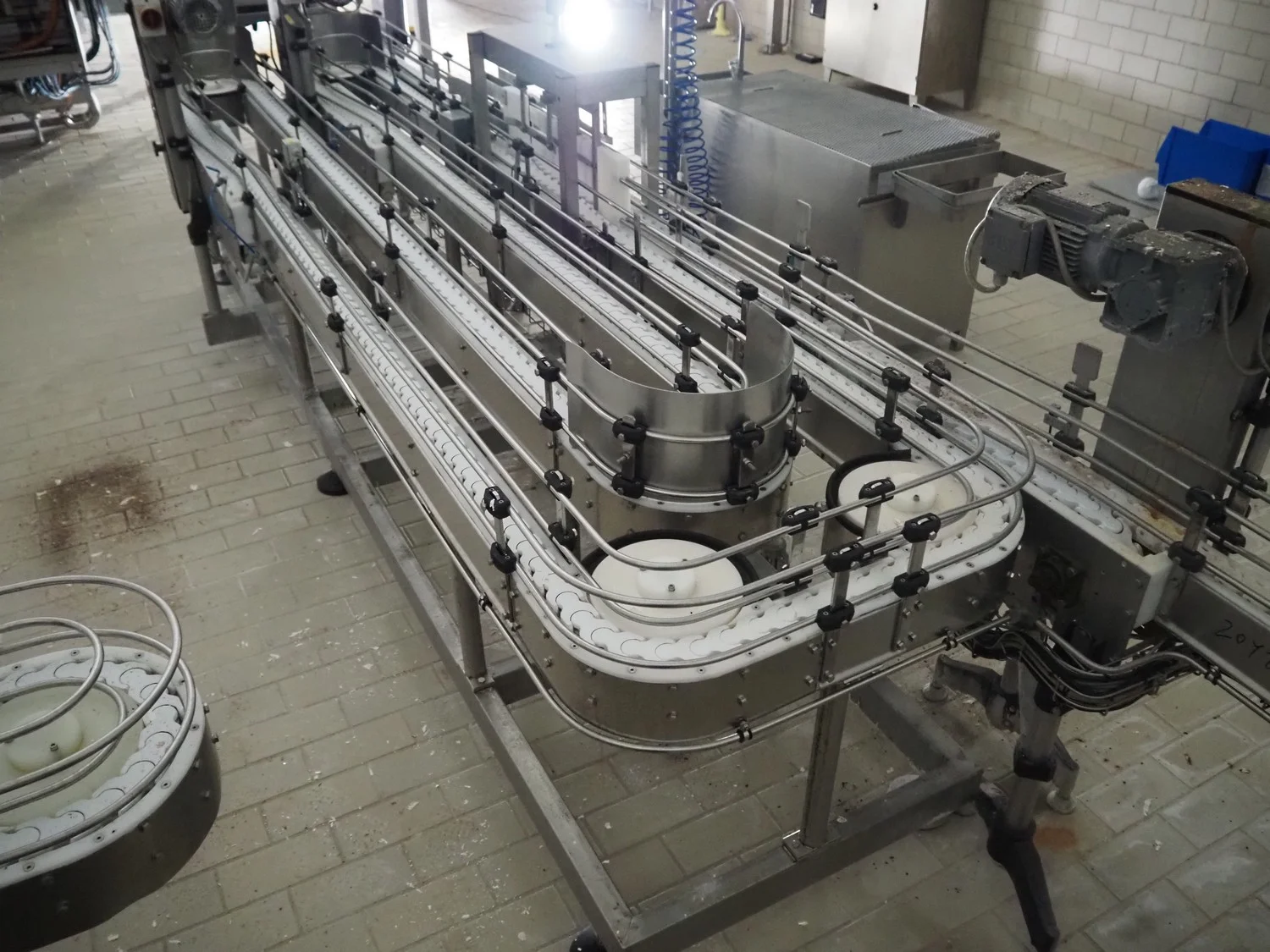 Emebe accumulation conveyors, s/s frame, plastic belt, belt width: 70 mm, total dimensions: 8200 mm x 1500 mm x 1650 mm.