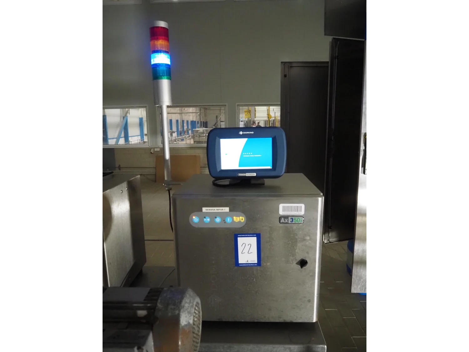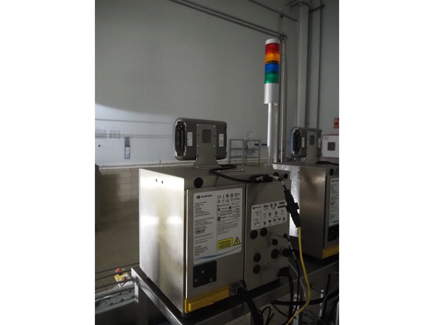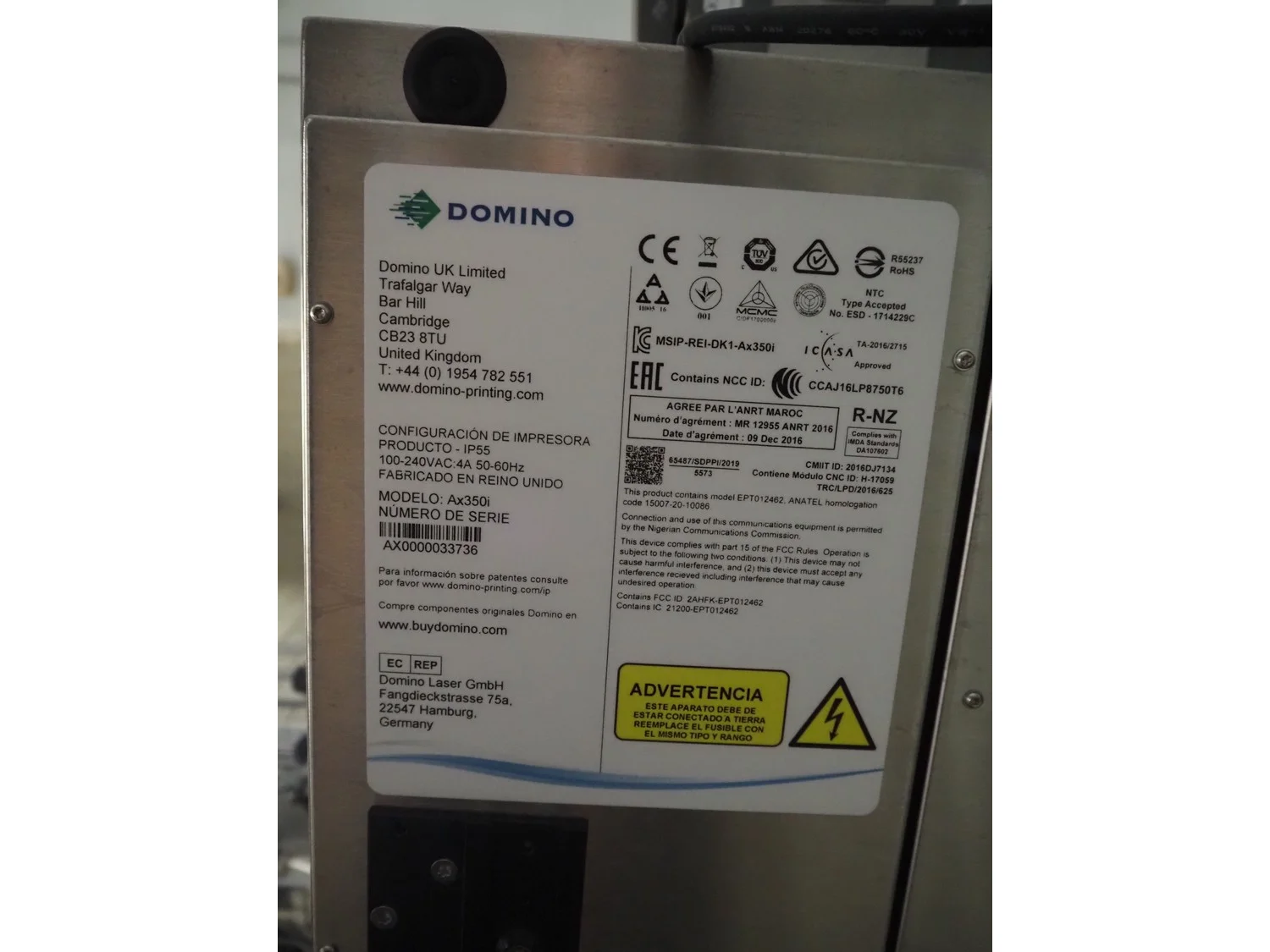 Domino inkjet printer, model: Ax350i, serial number: AX0000033736, year of construction: 2016, 100-240 V, 50-60 Hz, 4 A, dimensions: 500 mm x 450 mm x 950 mm.