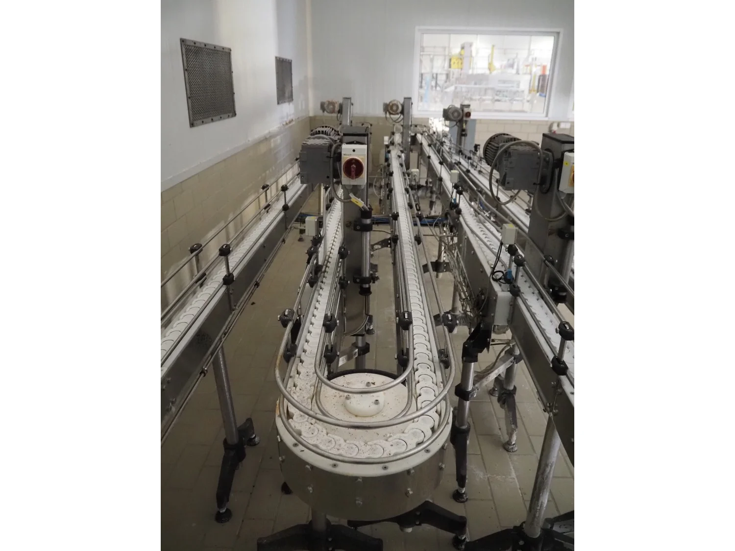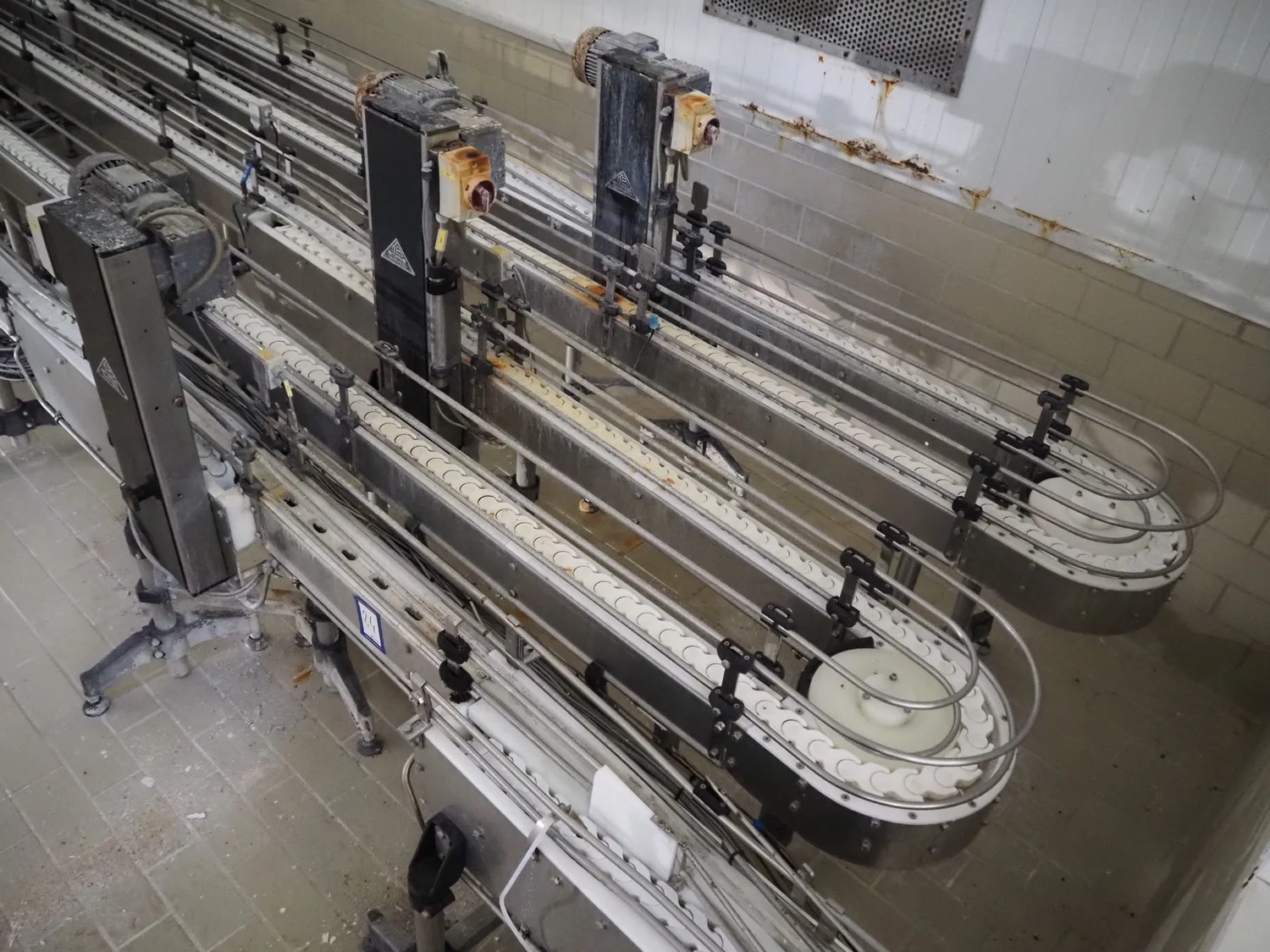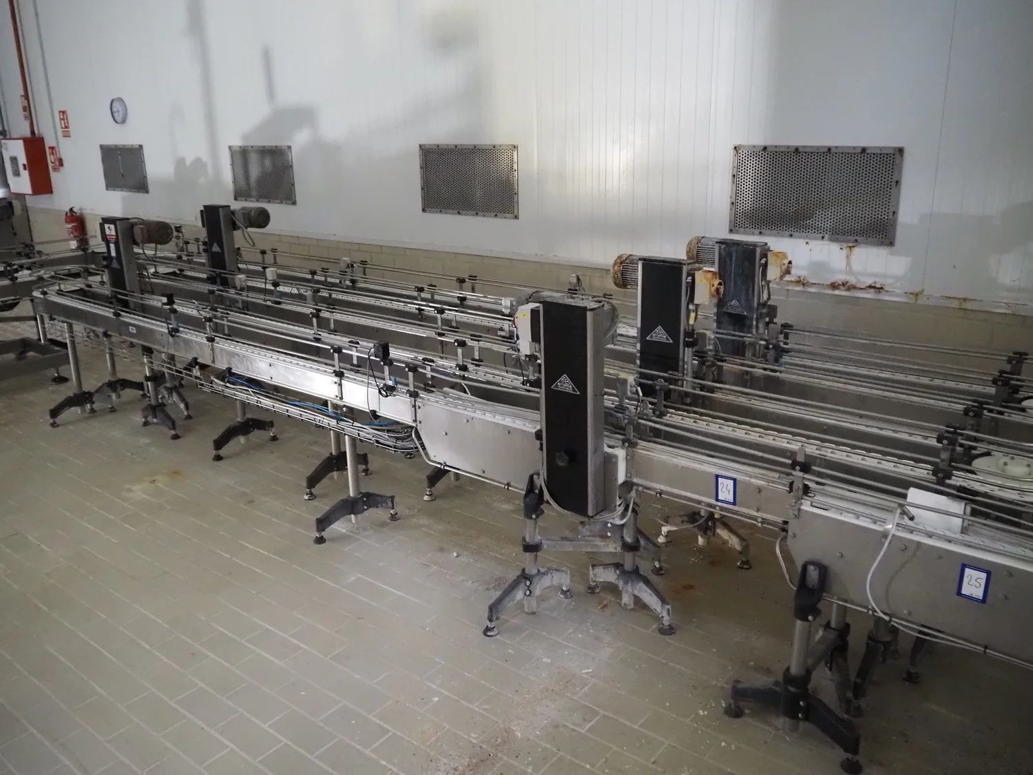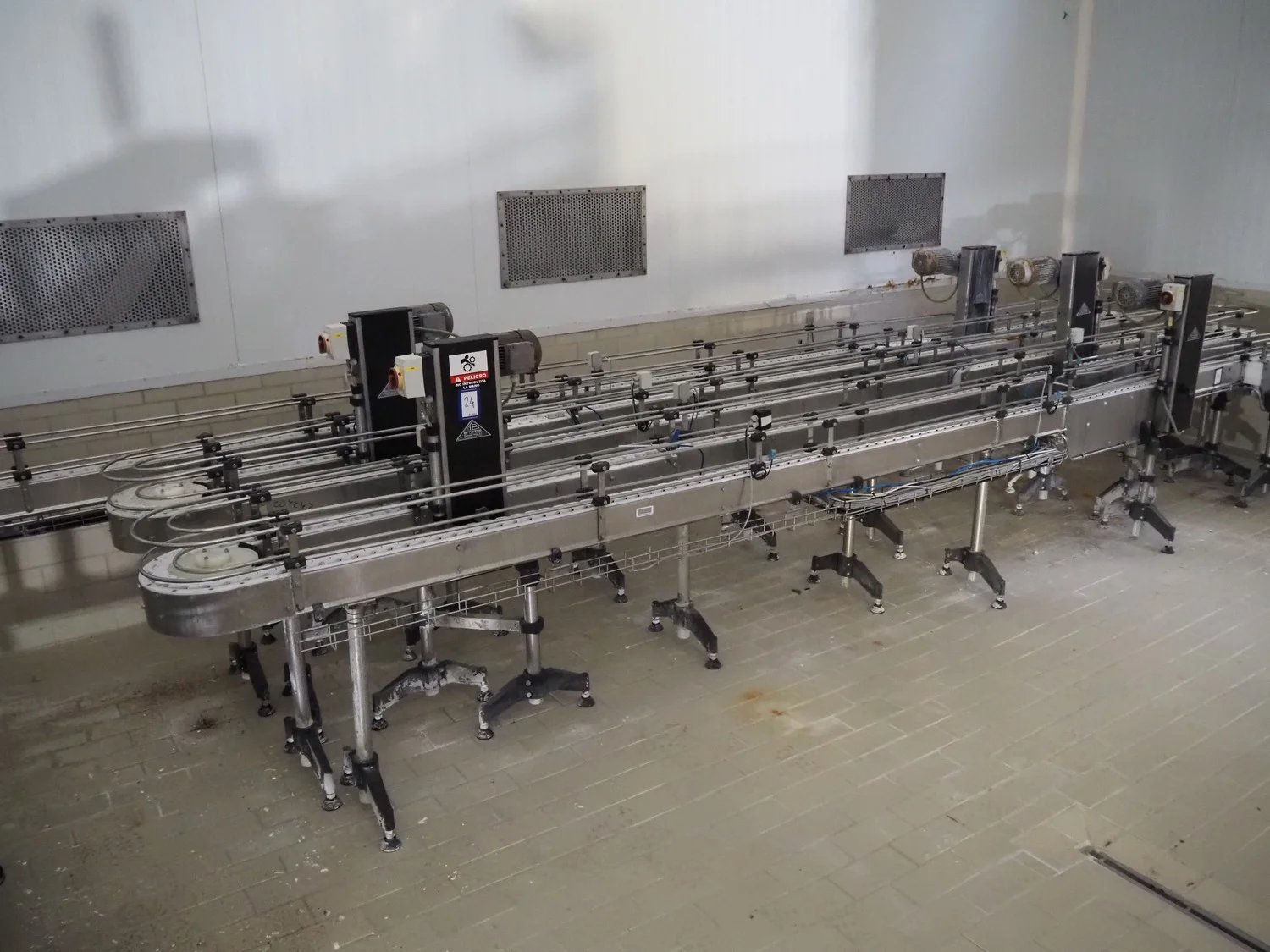 Emebe accumulation conveyors, s/s frame, plastic belt, belt width: 70 mm, total dimensions: 7300 mm x 1650 mm x 1400 mm.