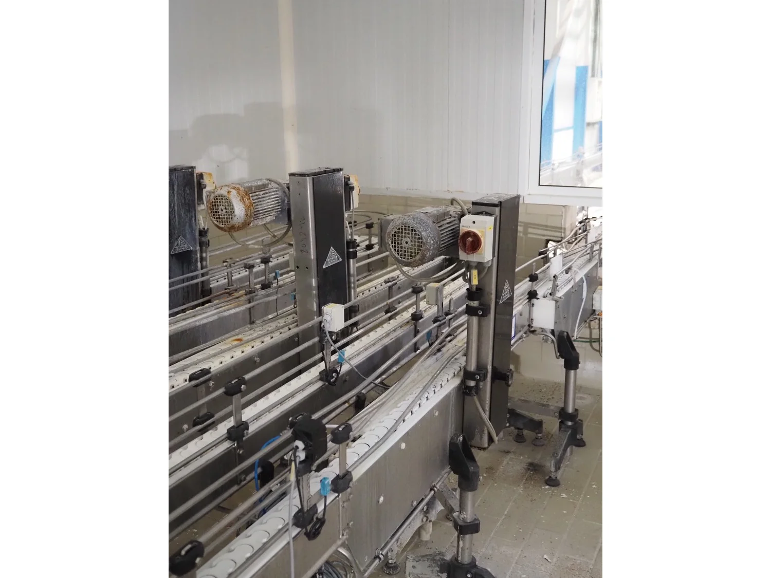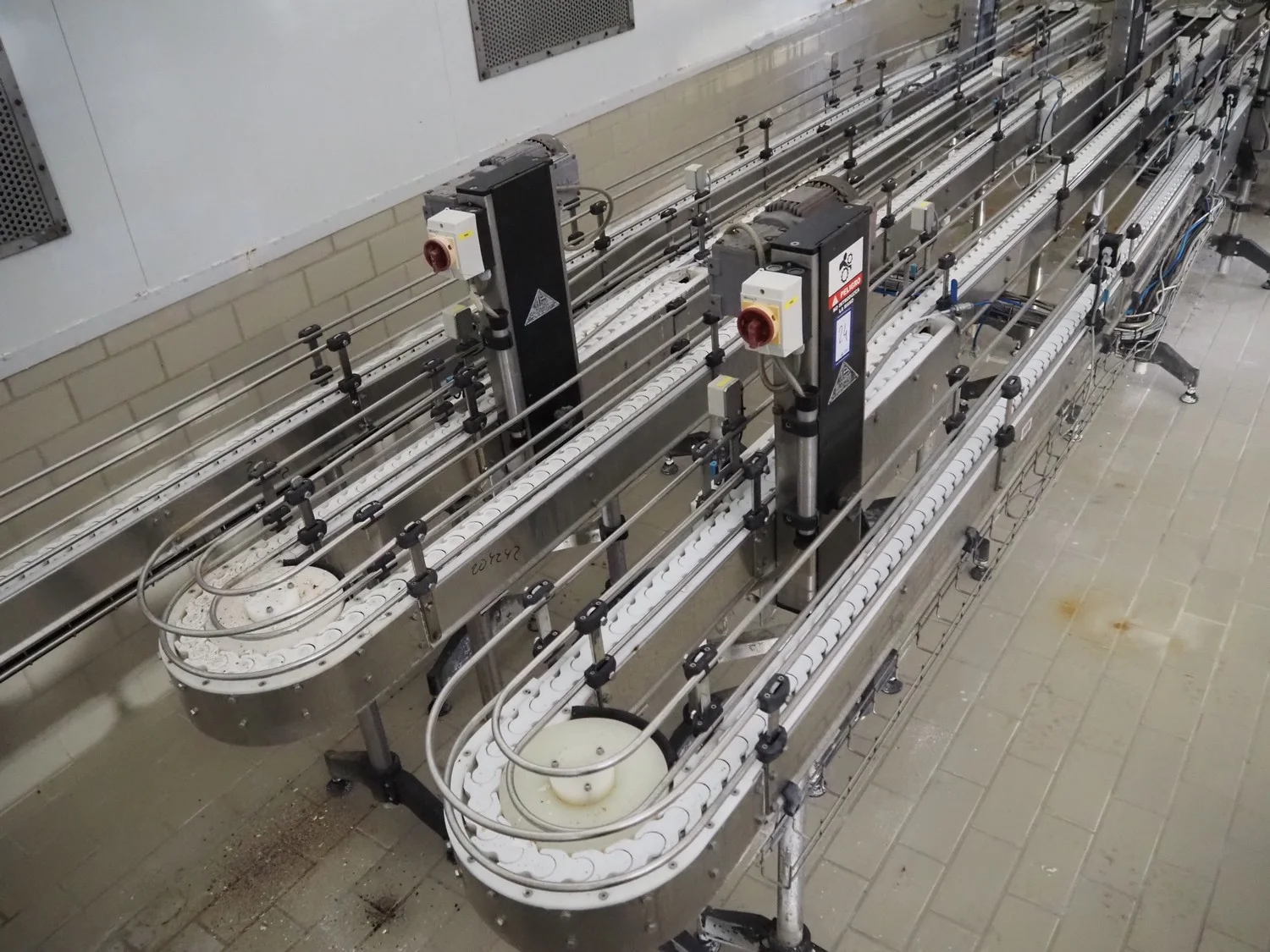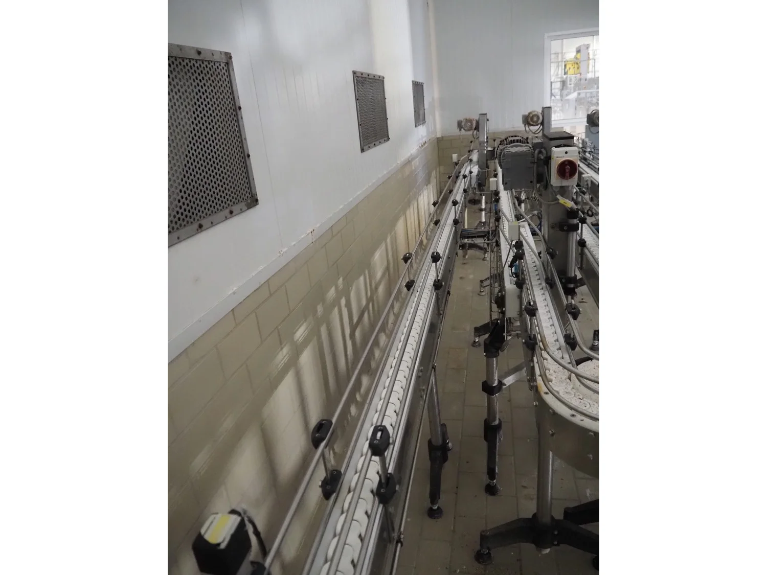 Emebe accumulation conveyors, s/s frame, plastic belt, belt width: 70 mm, total dimensions: 7300 mm x 1650 mm x 1400 mm.