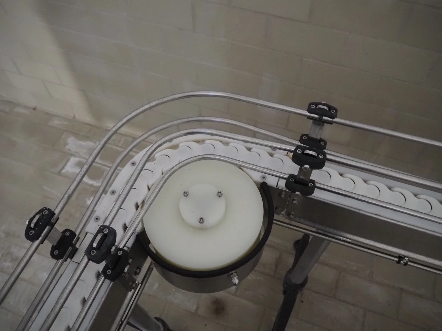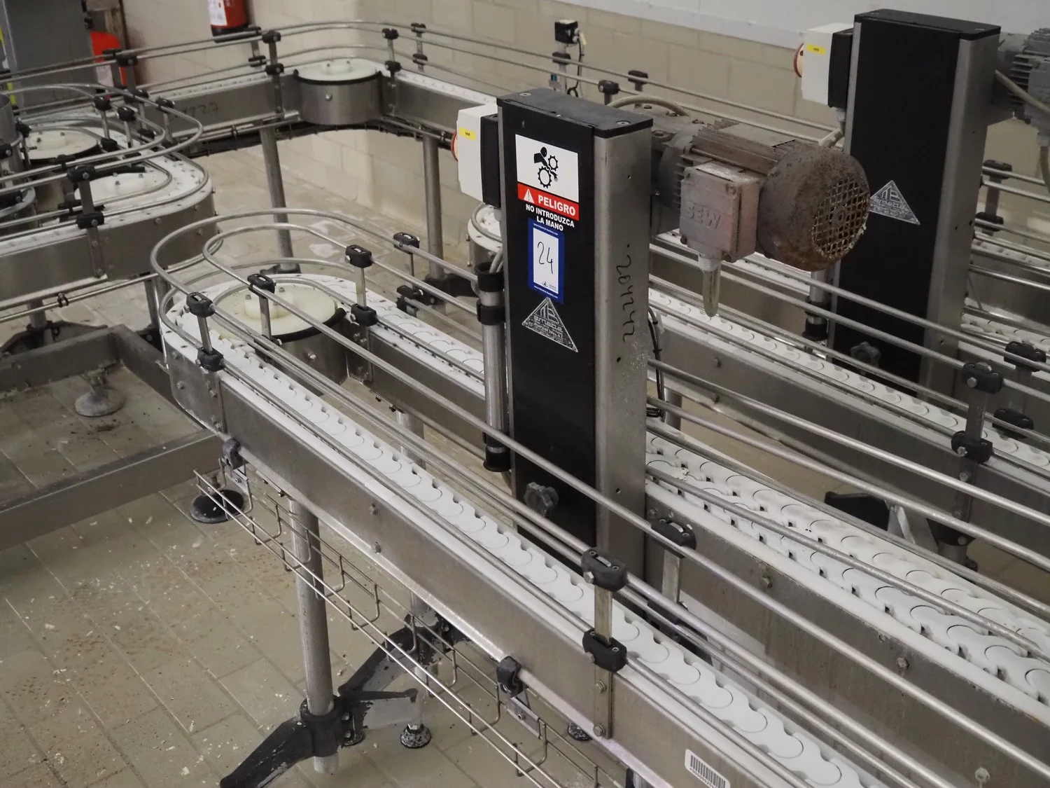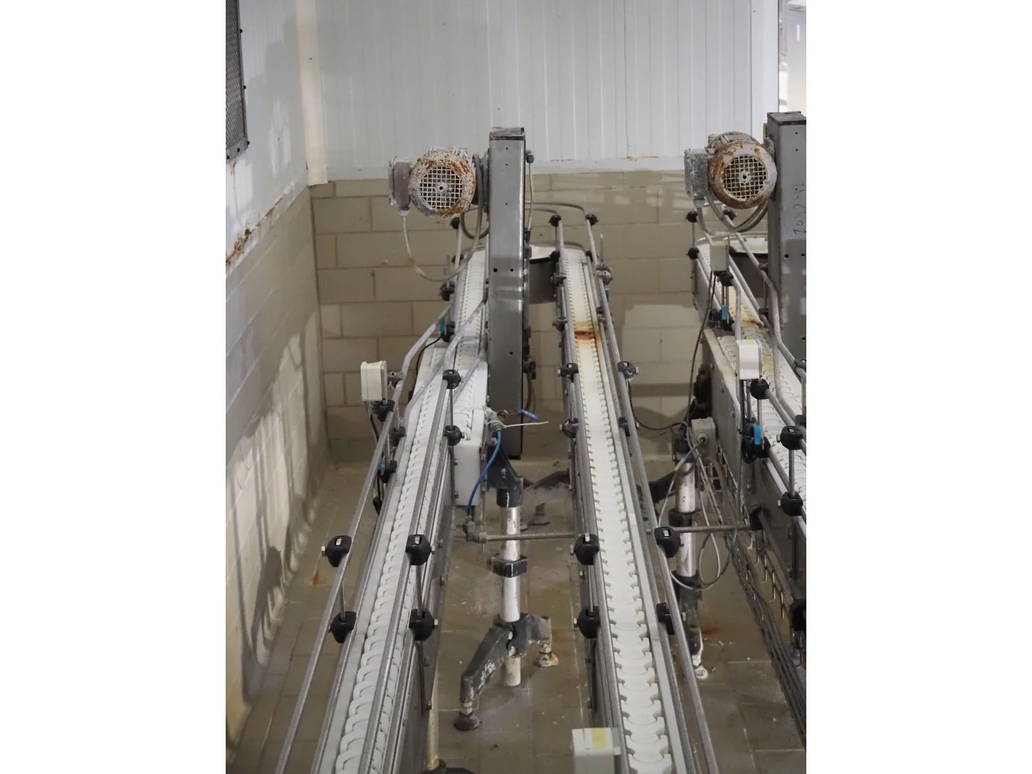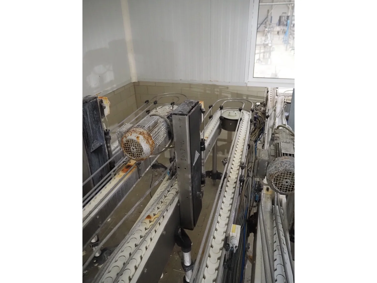 Emebe accumulation conveyors, s/s frame, plastic belt, belt width: 70 mm, total dimensions: 7300 mm x 1650 mm x 1400 mm.