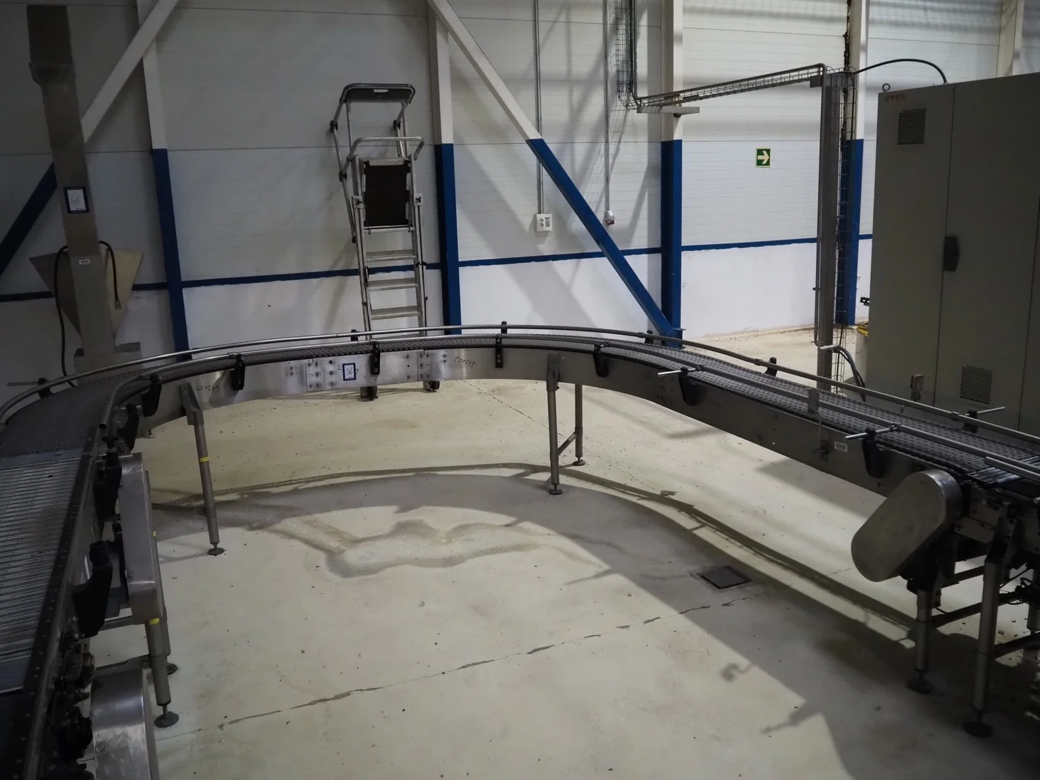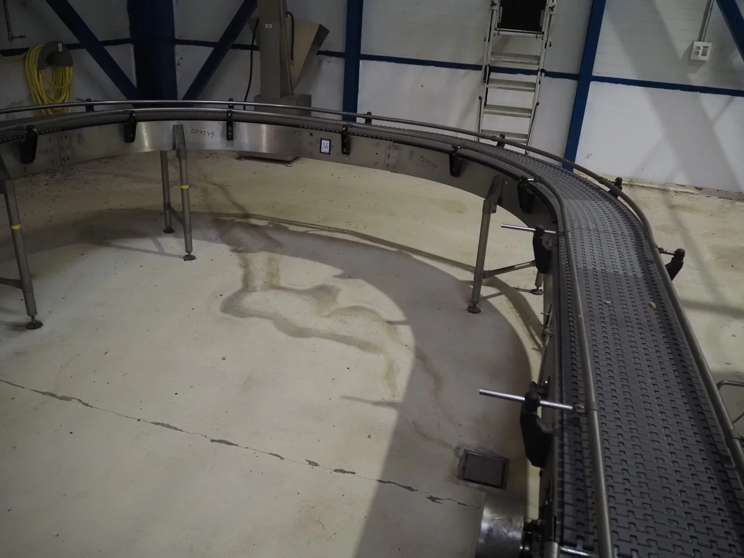 180° curve conveyor, s/s frame, plastic belt, belt width: 350 mm, total dimensions: 3800 mm x 1100 mm x 3500 mm.