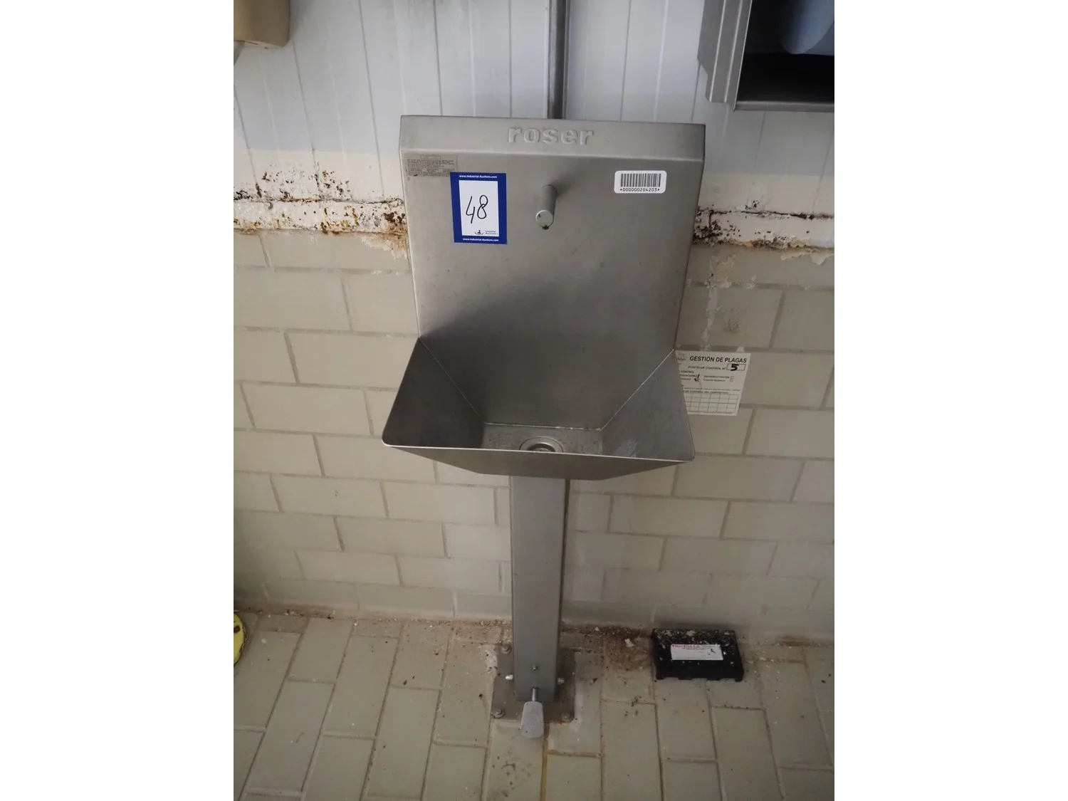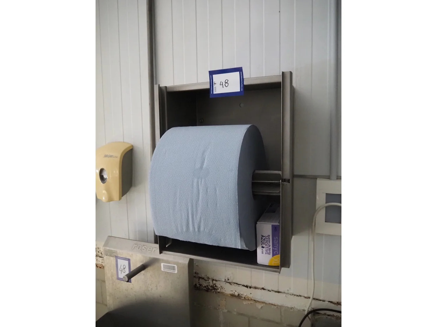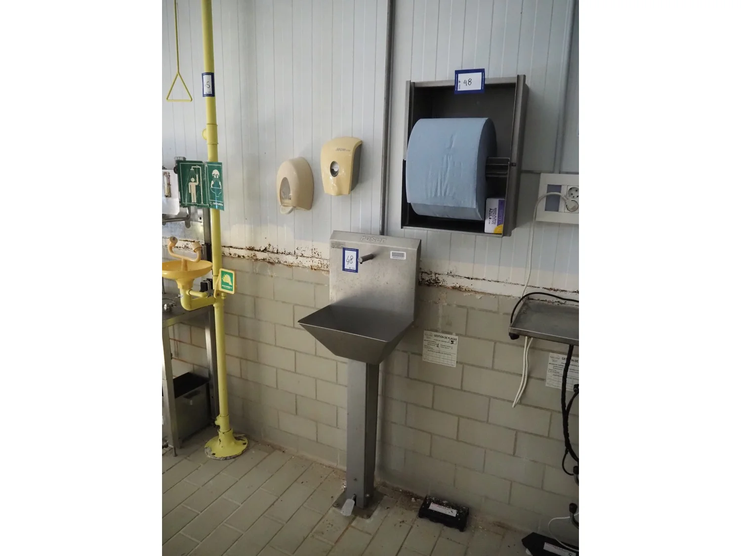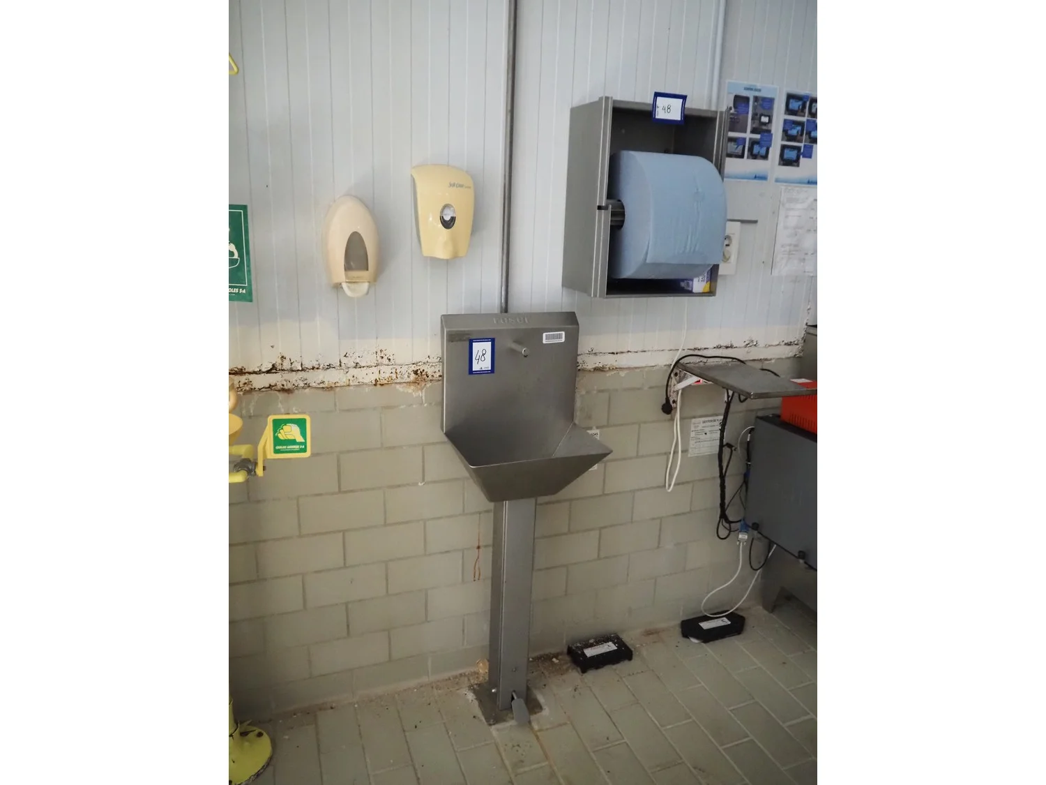 S/s sink, dimensions: 500 mm x 400 mm x 1400 mm, with s/s paper dispenser, dimensions: 400 mm x 250 mm x 500 mm and 2 plastic soap dispensers.