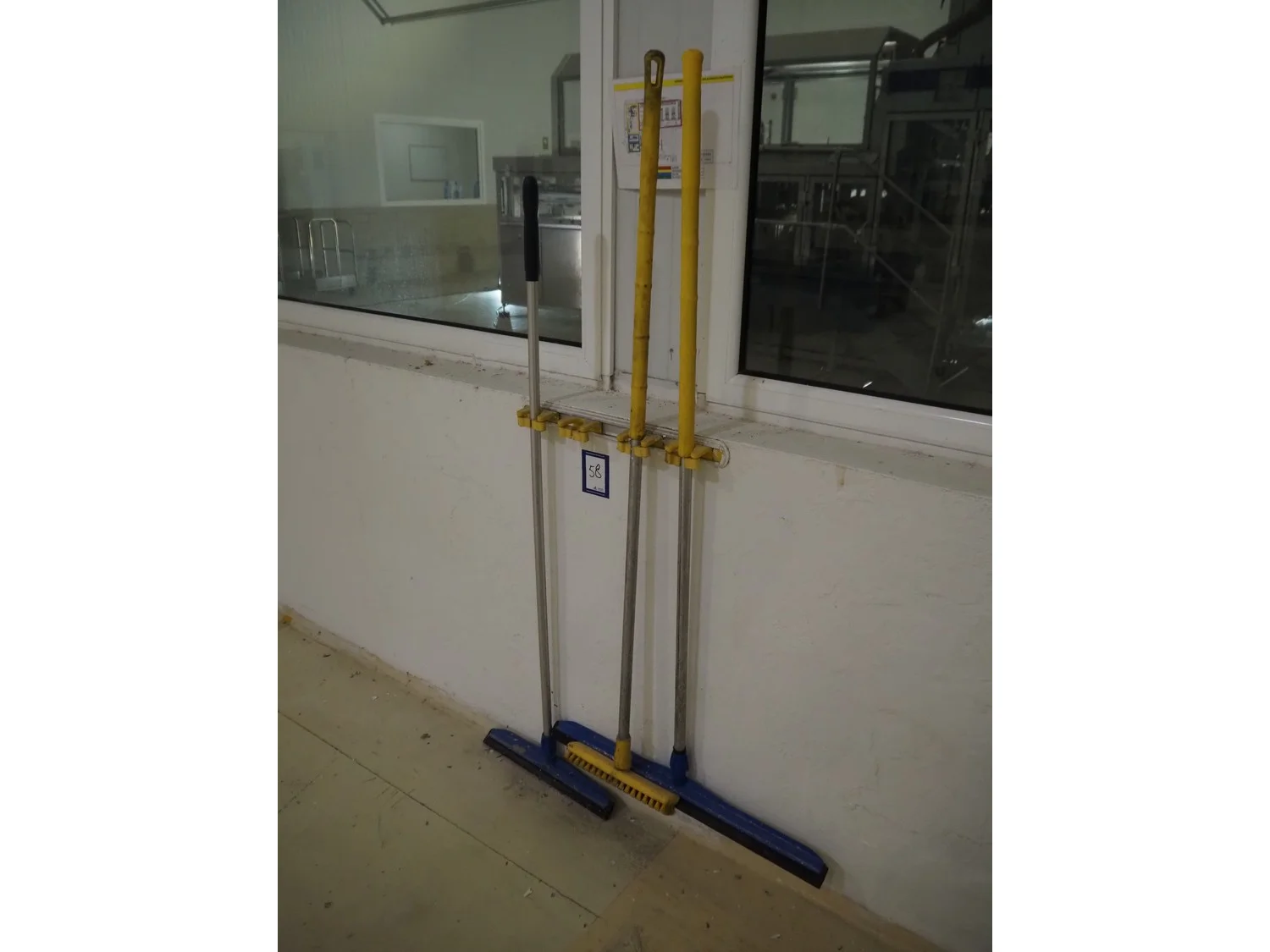 Plastic peg with 2 plastic squeegees and plastic broom.