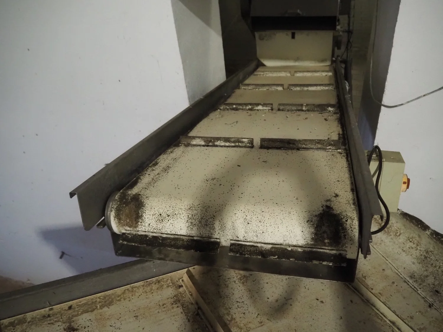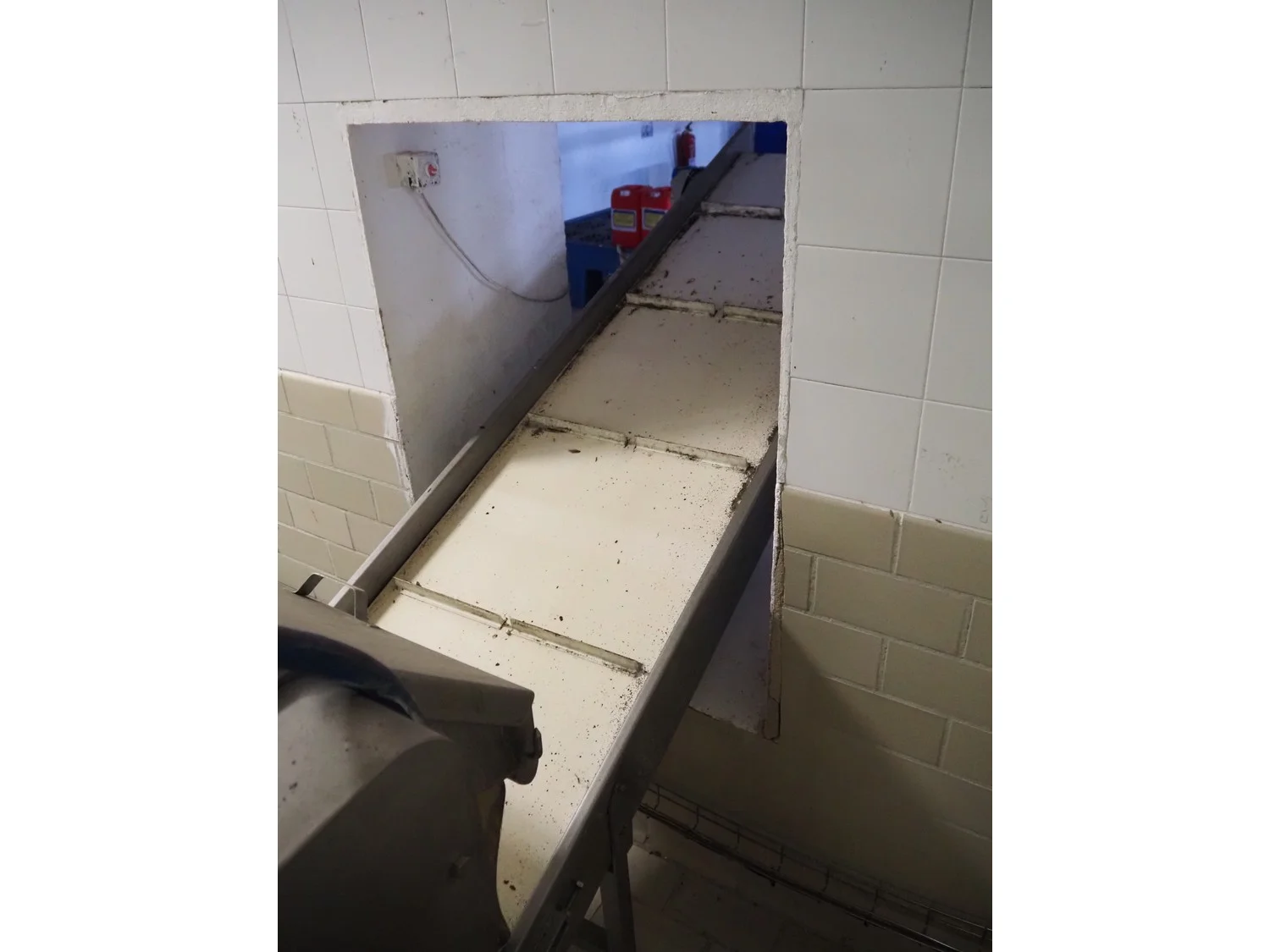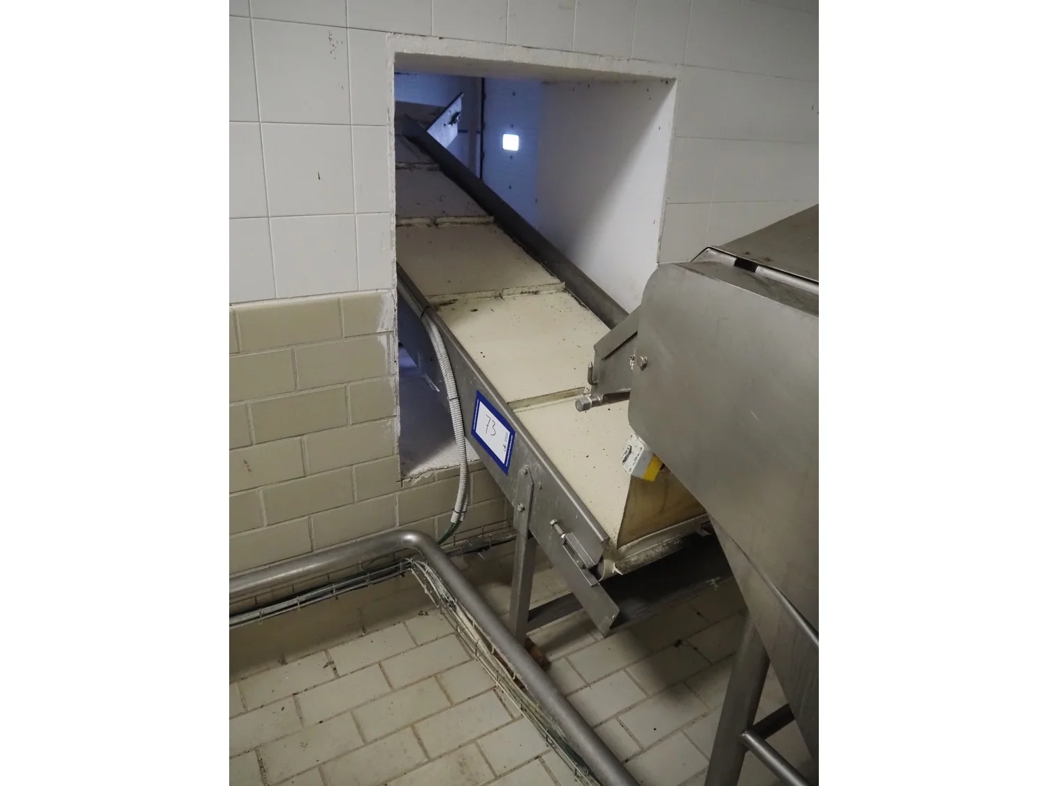Grupali elevating belt, type: TBC, number: 120601, year of construction: 2006, 380 V, 50 Hz, 0.25 kW, s/s frame, plastic belt, belt width: 600 mm, total dimensions: 2600 mm x 800 mm x 1500 mm.