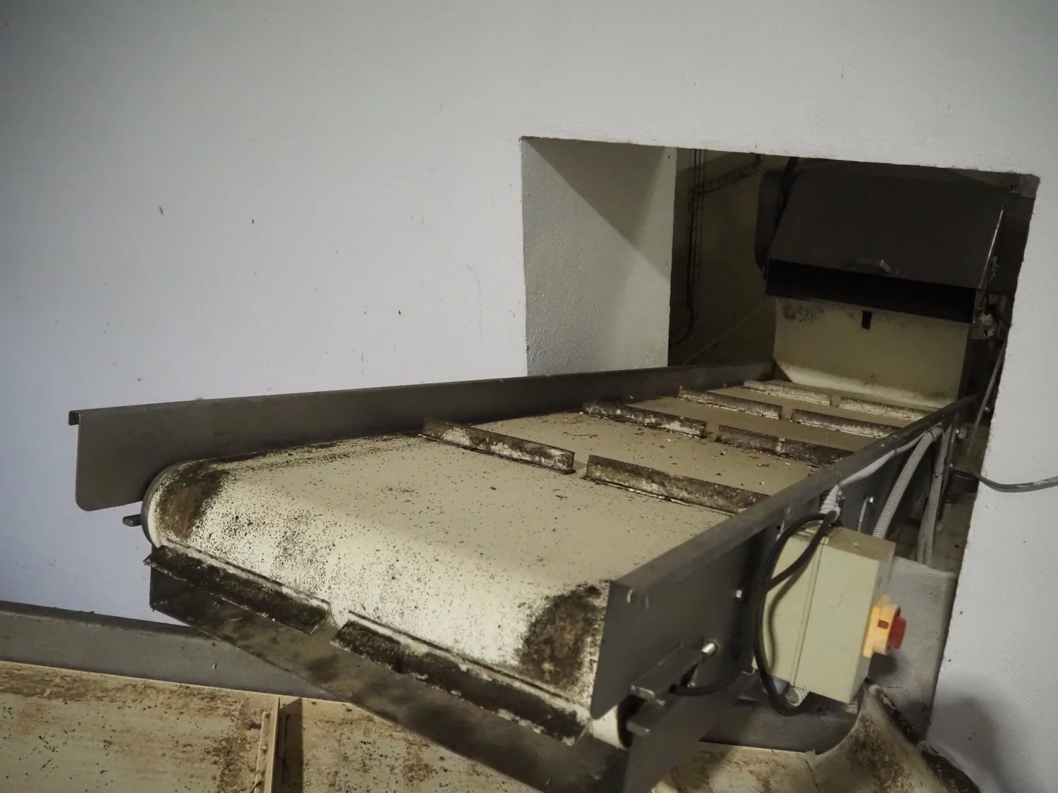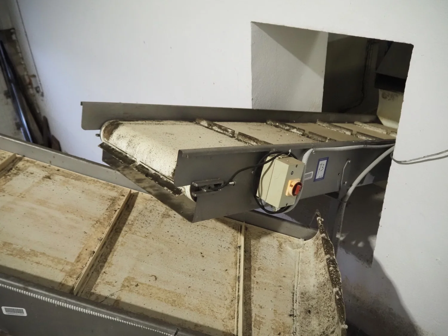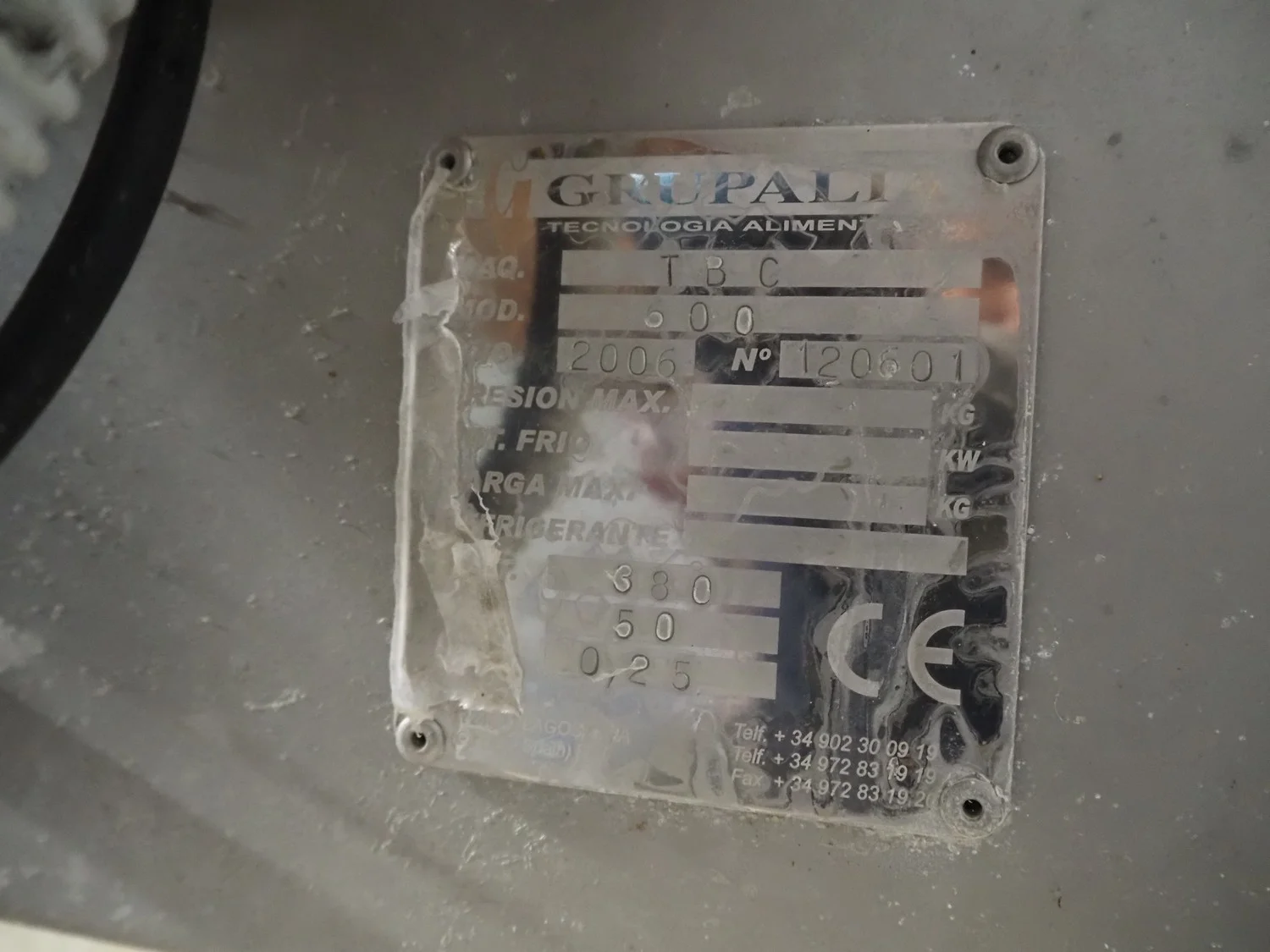 Grupali elevating belt, type: TBC, number: 120601, year of construction: 2006, 380 V, 50 Hz, 0.25 kW, s/s frame, plastic belt, belt width: 600 mm, total dimensions: 2600 mm x 800 mm x 1500 mm.