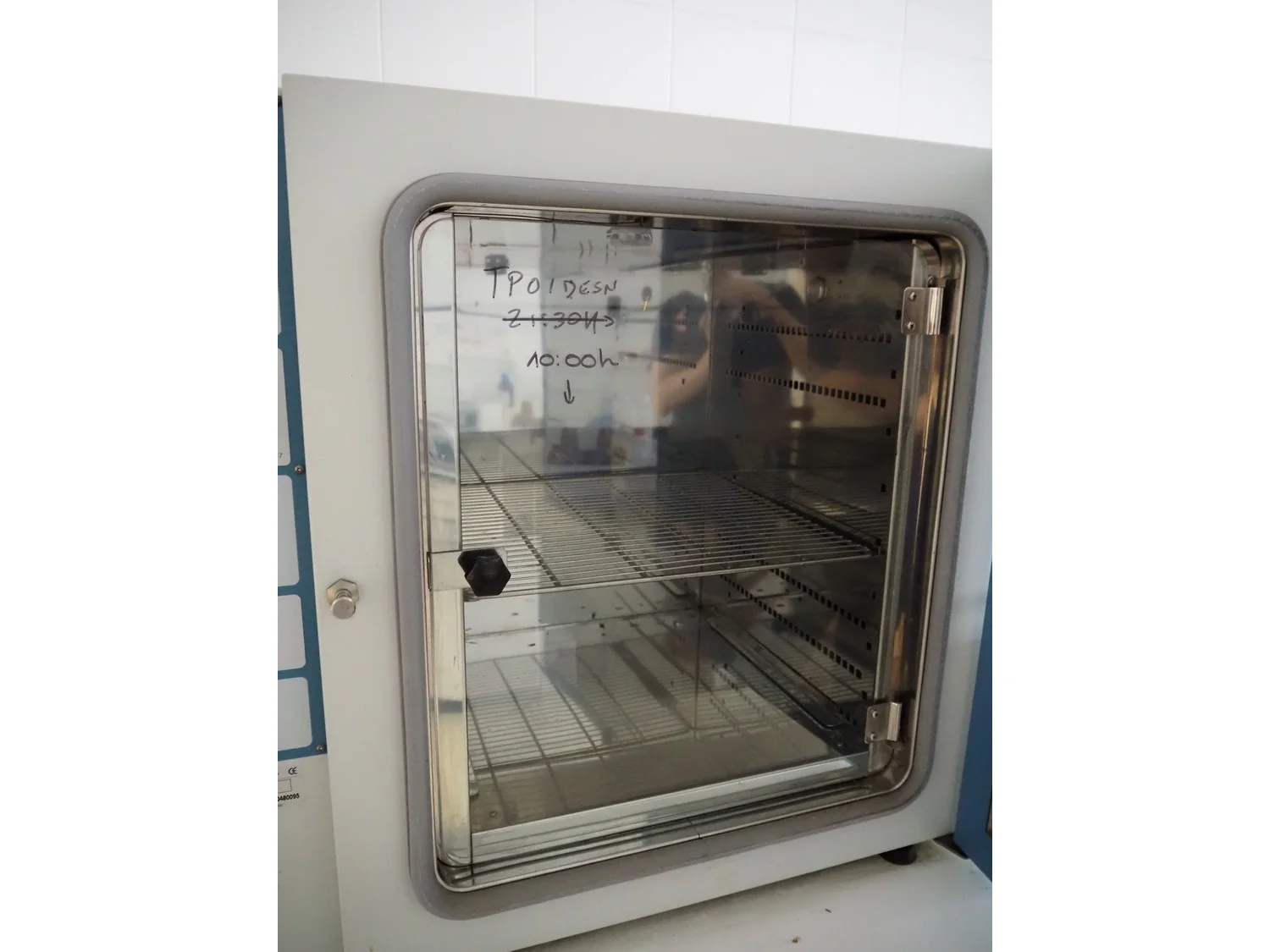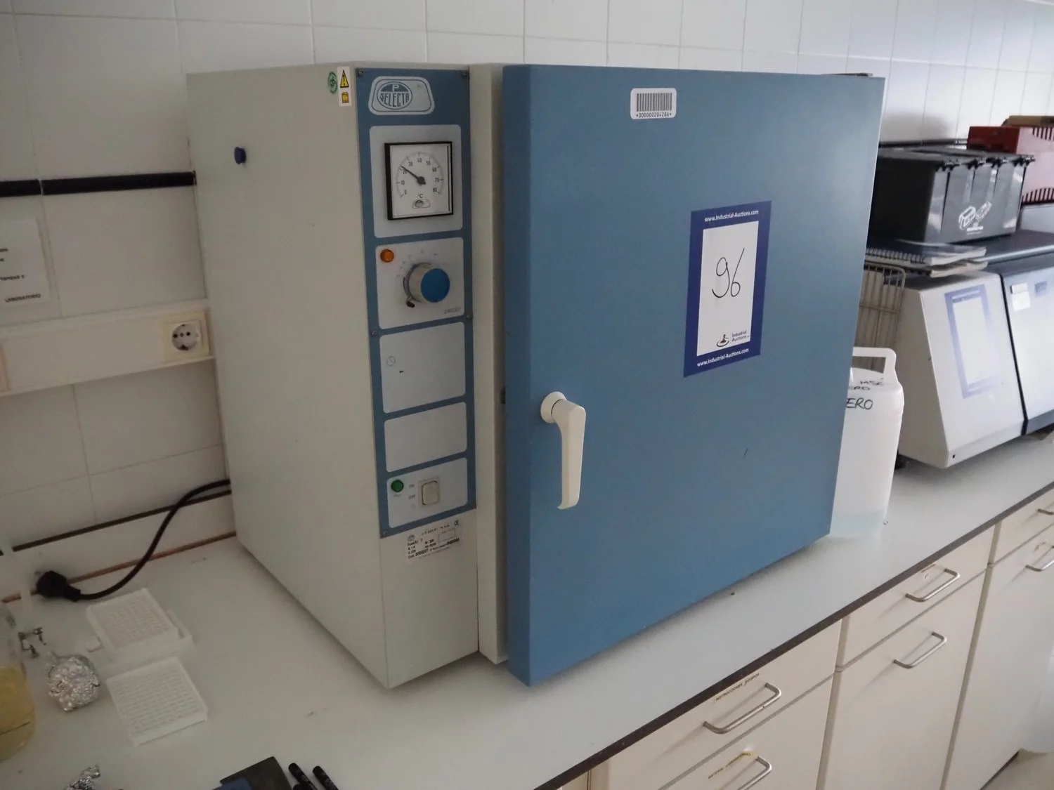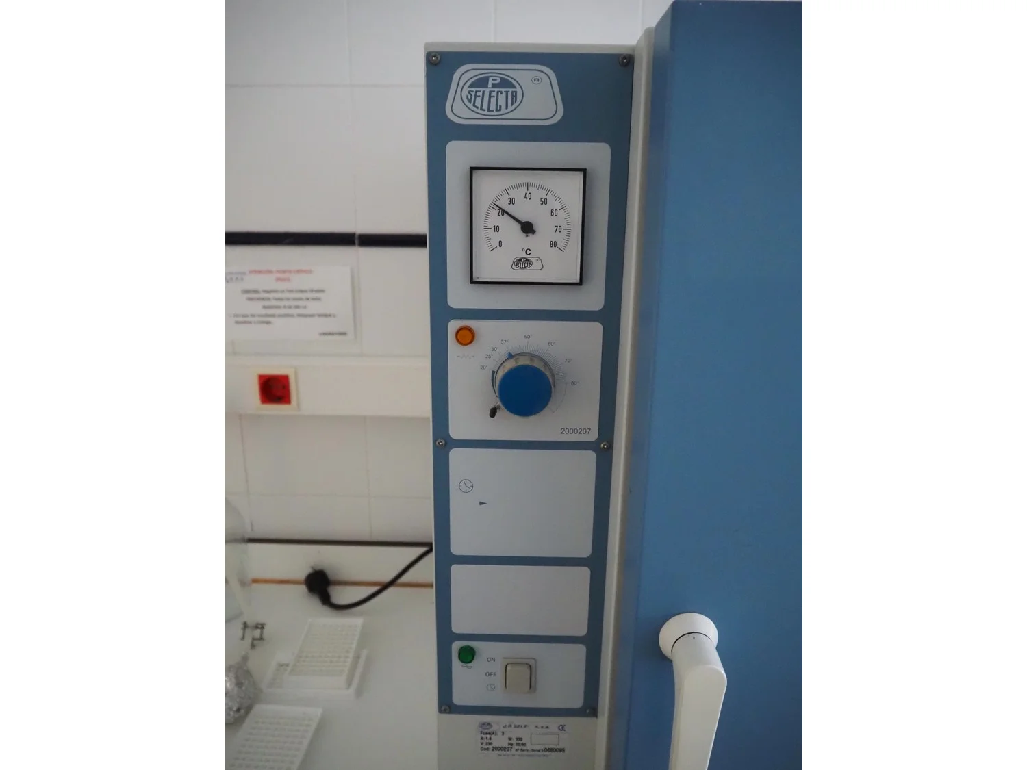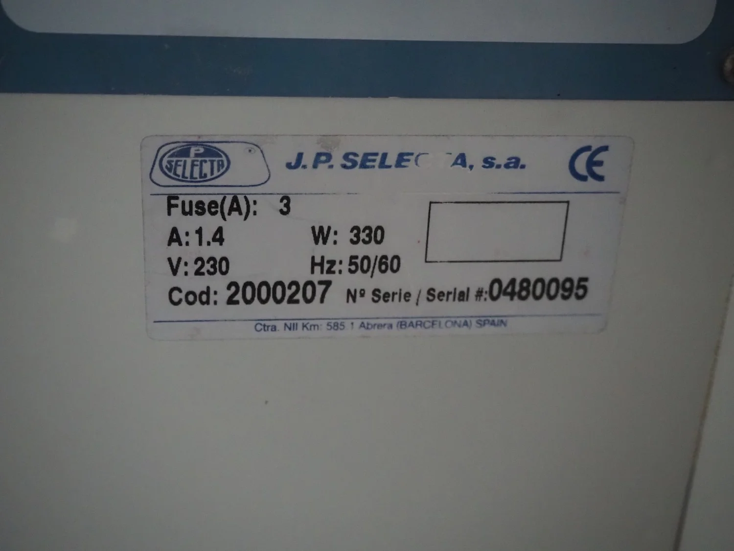 J.P. Selecta s.a. incubator, serial number: 0480095, 230 V, 50/60 Hz, 1.4 A, 330 W, dimensions: 750 mm x 600 mm x 700 mm.