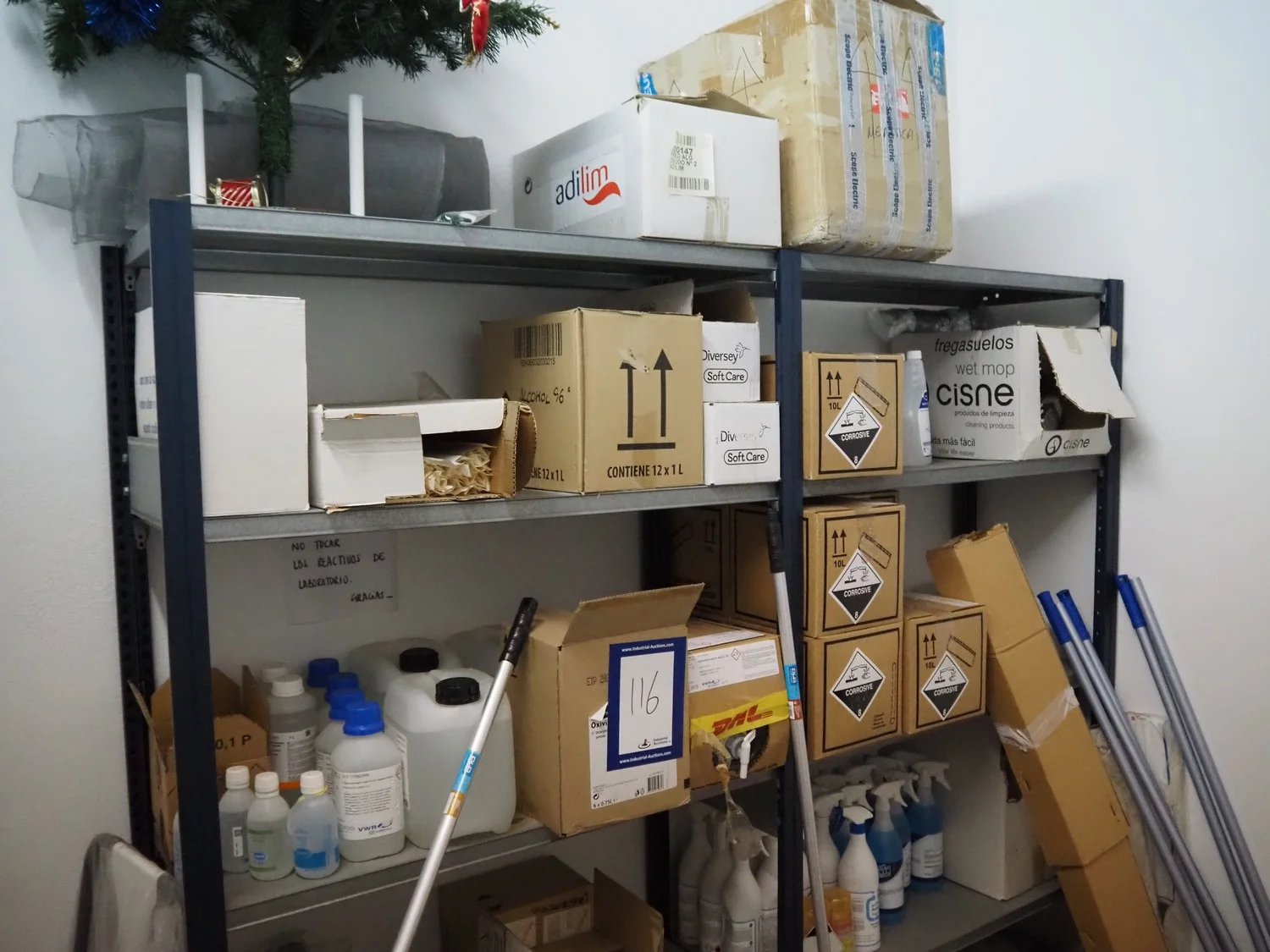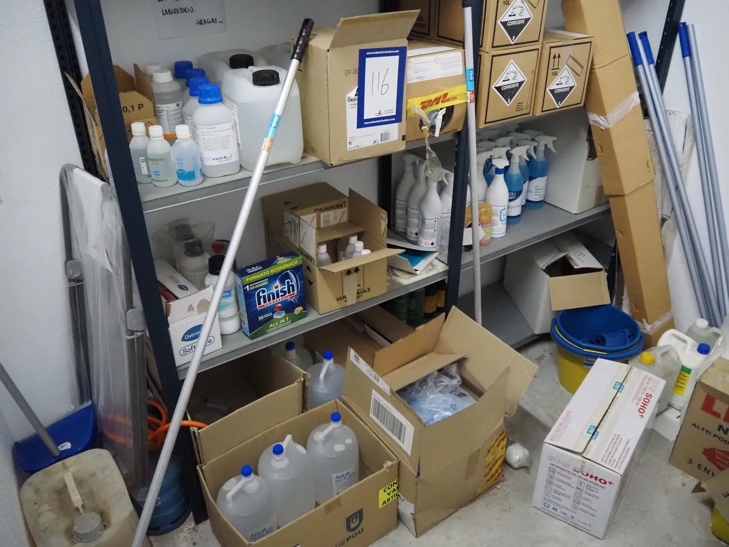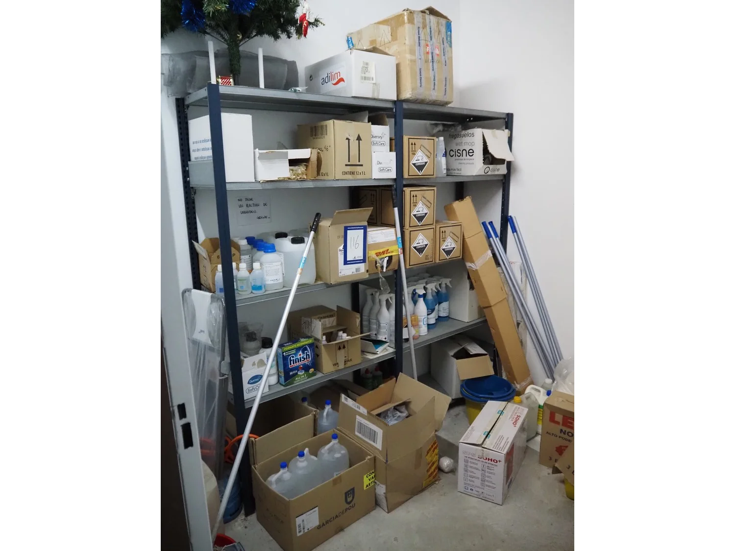 Steel rack with large amount of various cleaning equipment, dimensions rack: 2050 mm x 430 mm x 1970 mm.