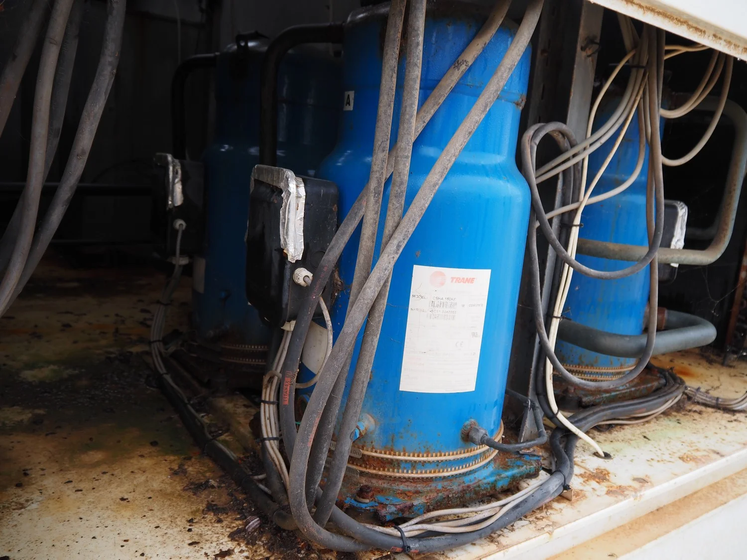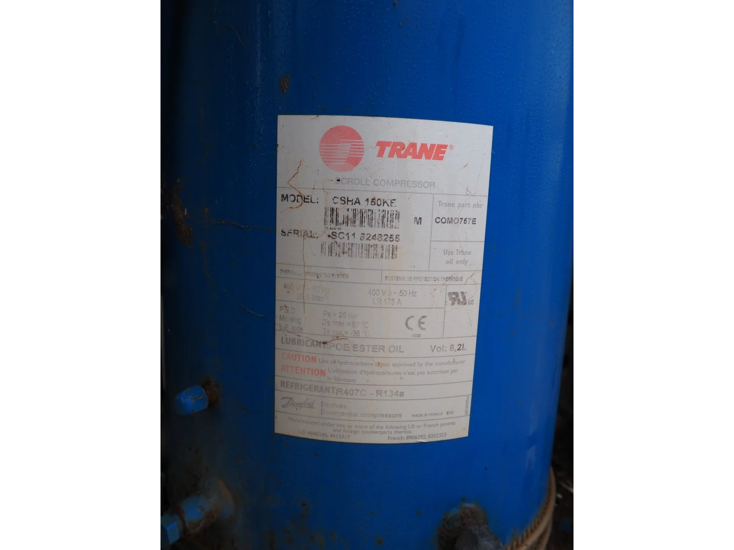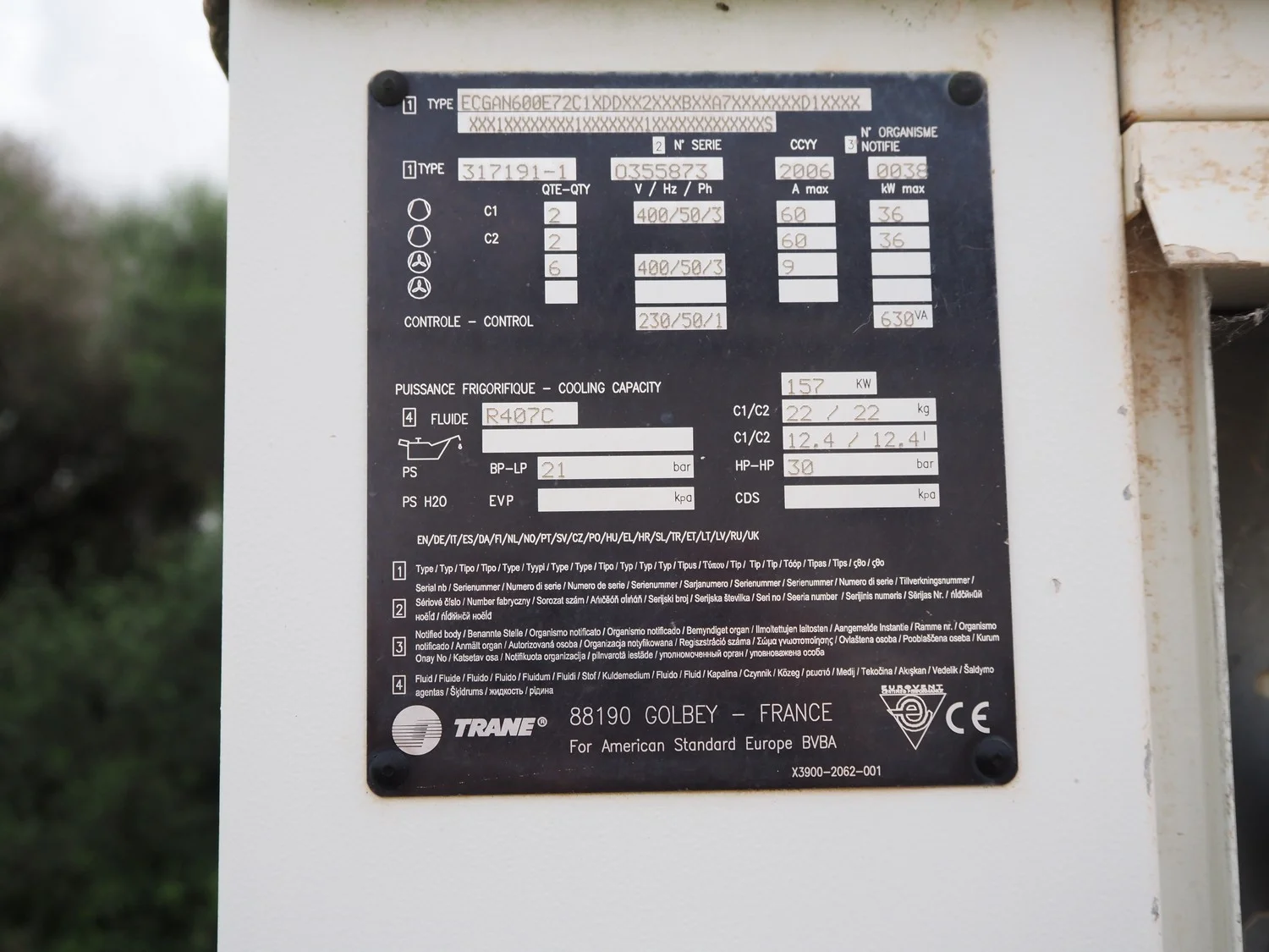 Trane water chiller, type: 317191-1, serial number: 0355873, year of construction: 2006, 400 V, 3 Ph, 50 Hz, 60 A, 36 kW, refrigerant: R407C, dimensions: 3400 mm x 2300 mm x 2200 mm.