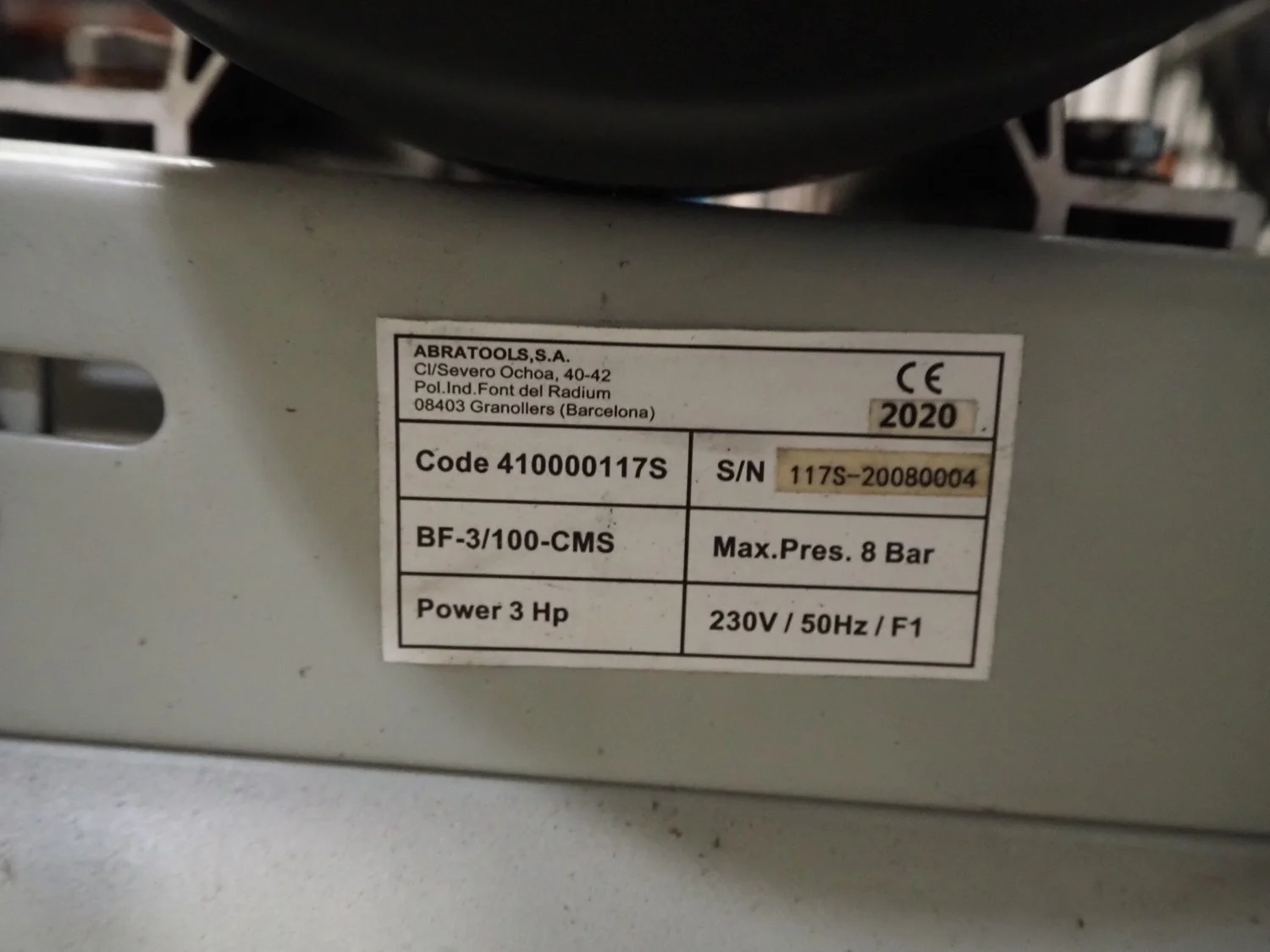 Abratools SA air compressor, type: BF-3/100-CMS, serial number: 117S-20080004, year of construction: 2020, 230 V, 50 Hz, dimensions: 950 mm x 500 mm x 800 mm.