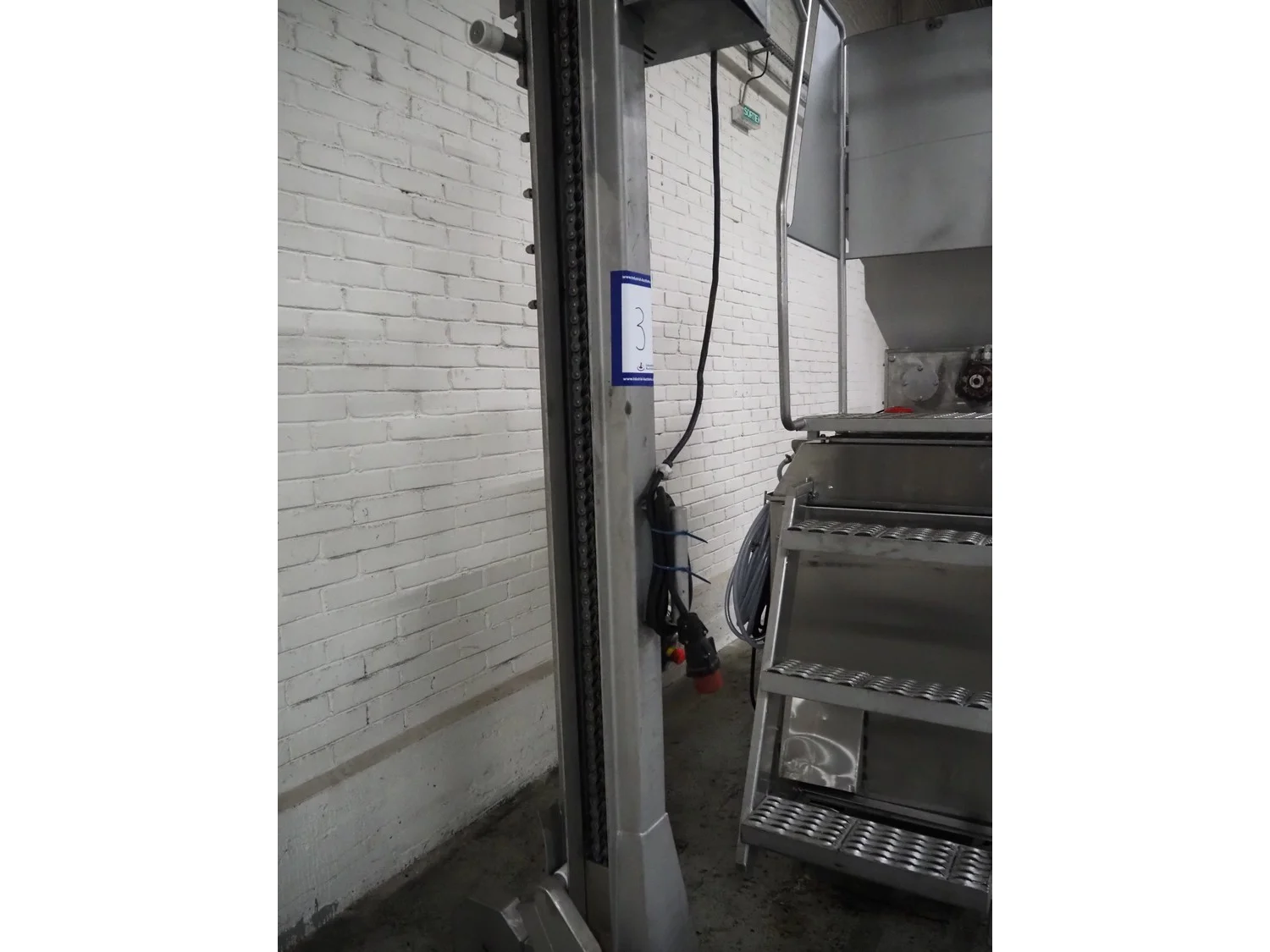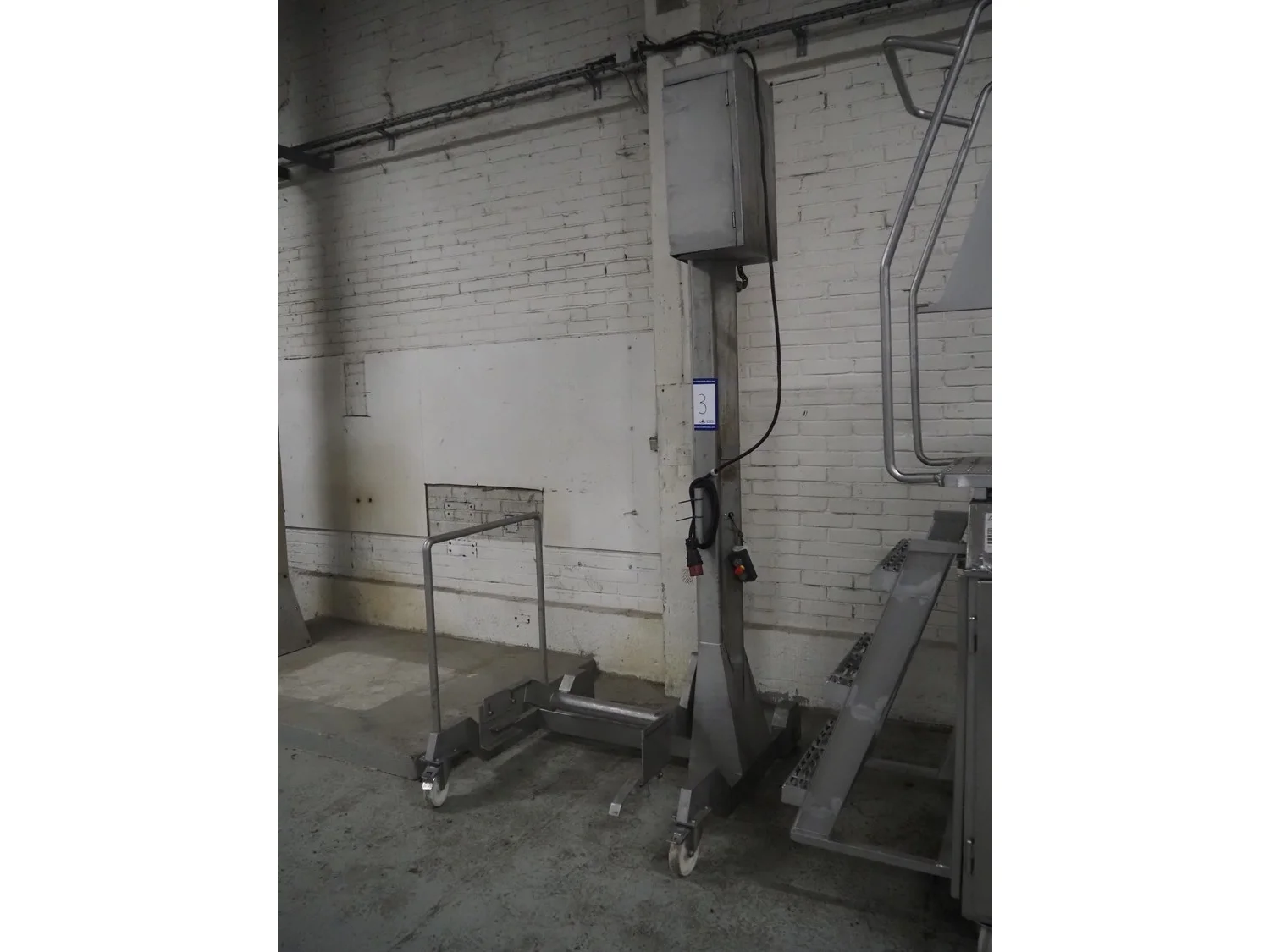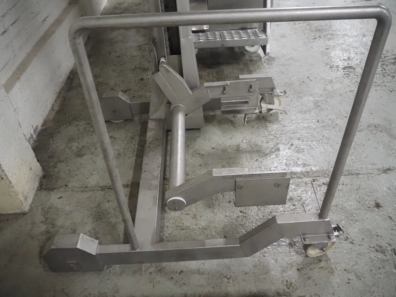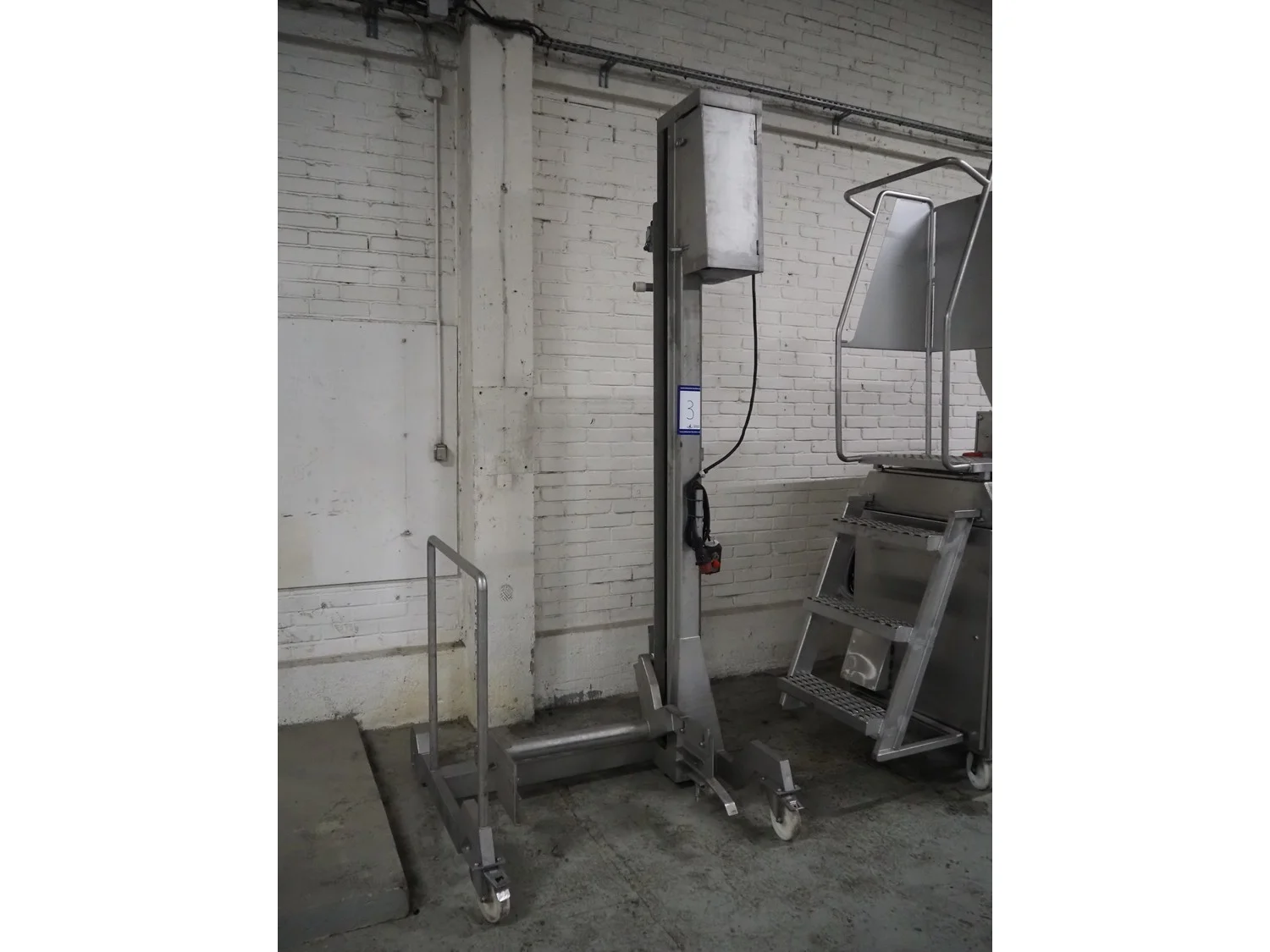 KG Lyften mobile lifter for 200 liter meat bins, elevating height: 2000 mm, total dimensions: 1200 mm x 1200 mm x 2400 mm.