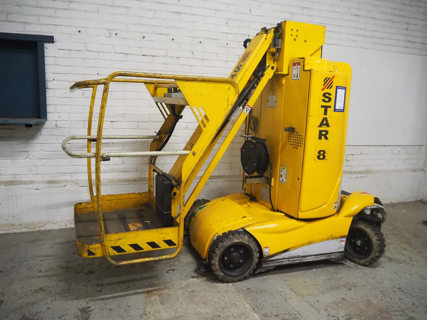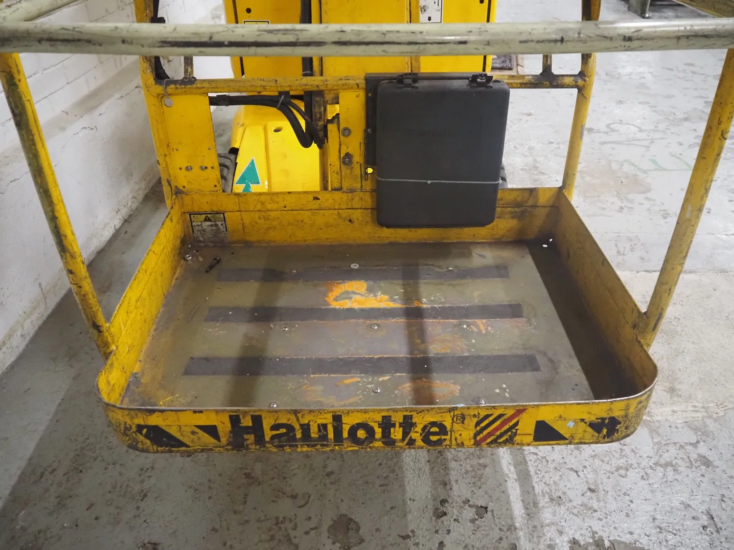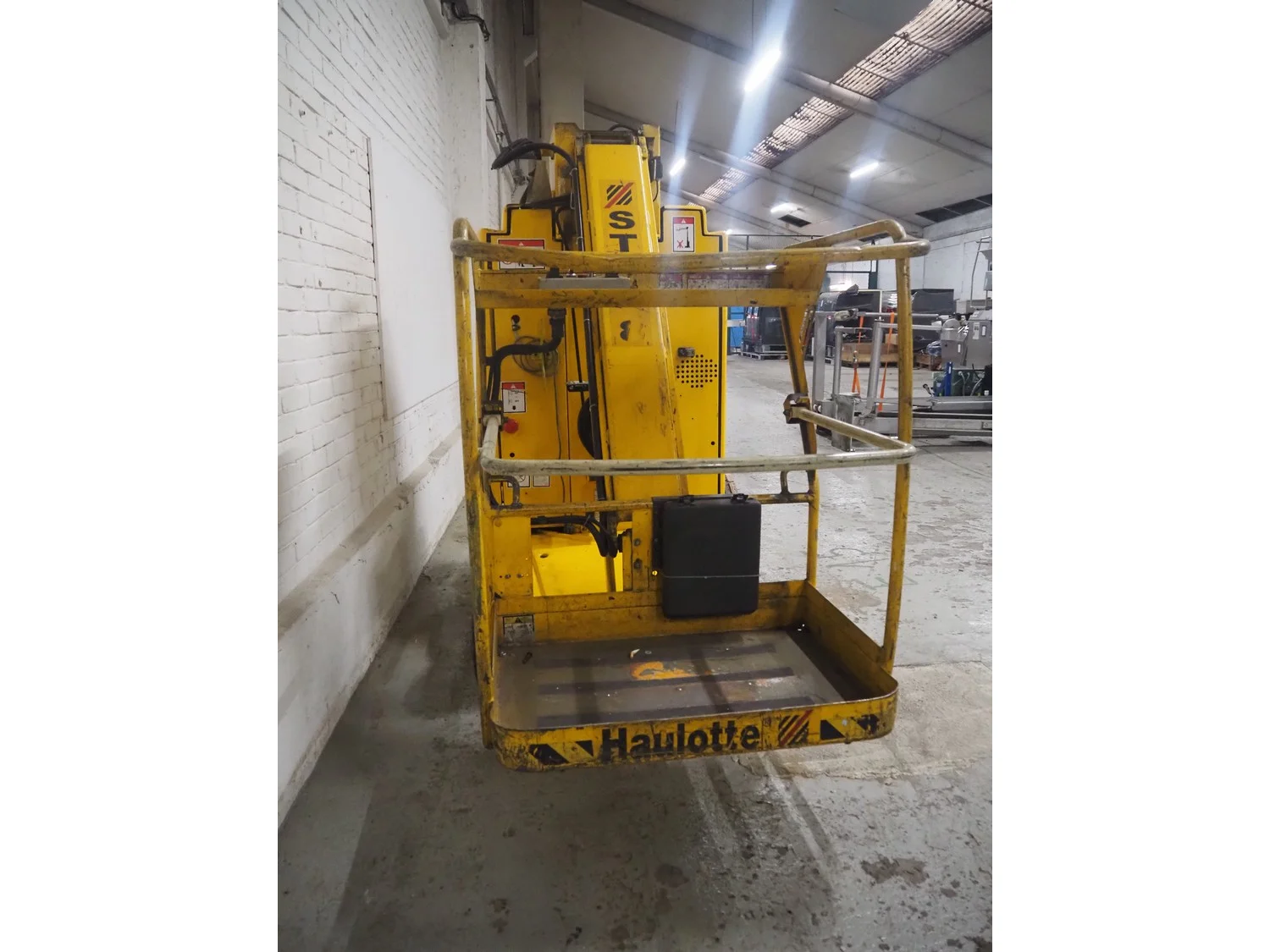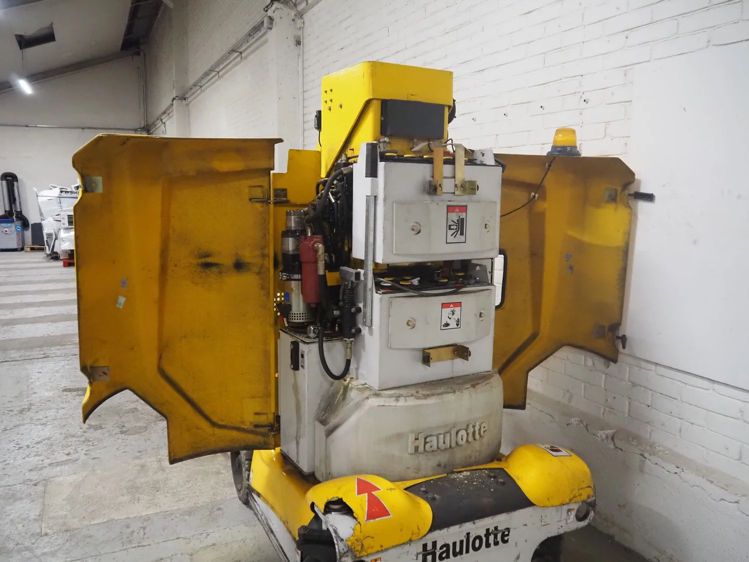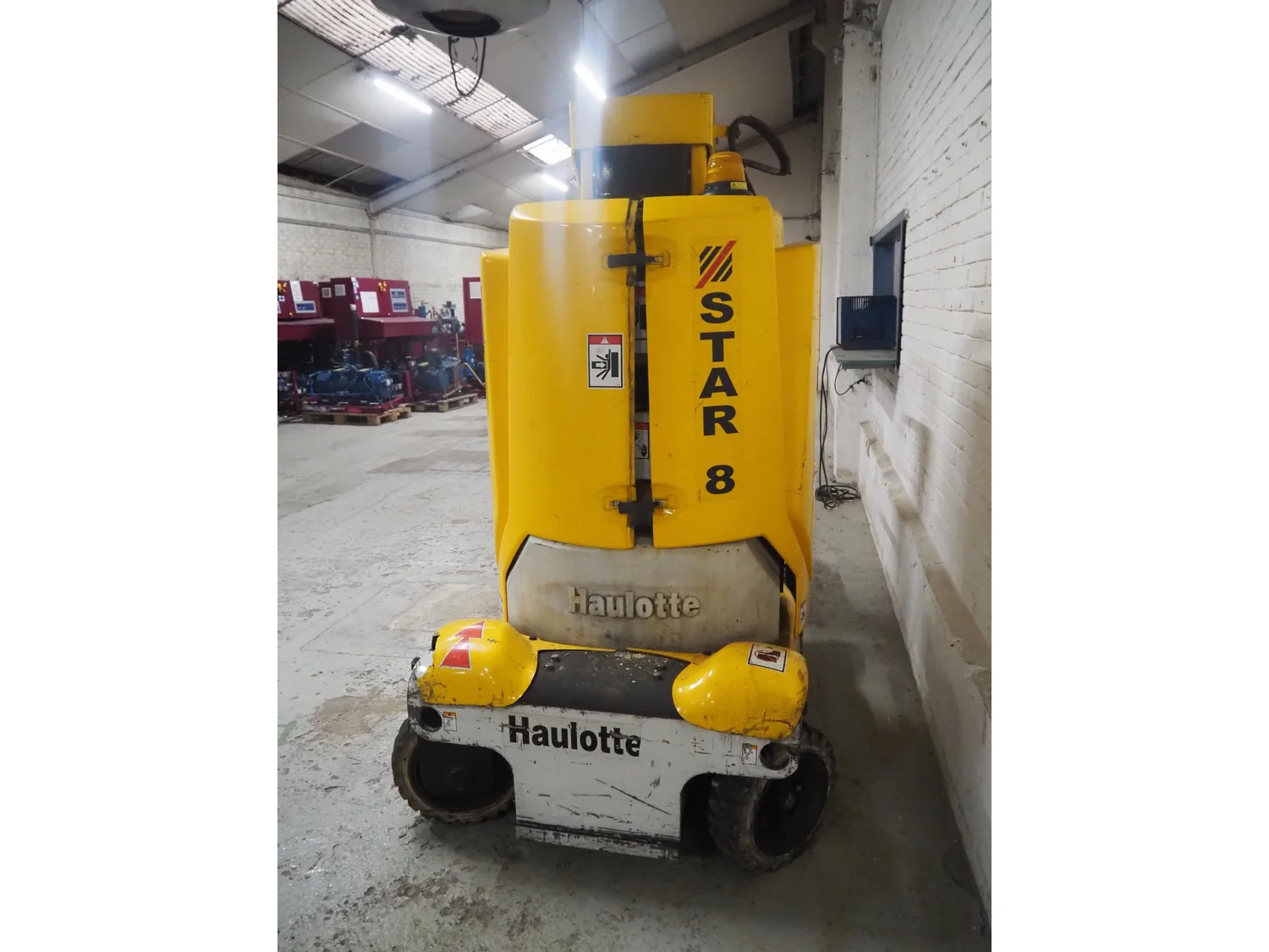 Haulotte electric mast lift, type: STAR 8, serial number: ME102097, year of construction: 2004, 1.2 kW, weight: 2515 Kg, lifting capacity: 200 kg, working height: 8.2 meters, platform height: 6.2 meters, dimensions platform: 920 mm x 660 mm, total dimensions: 2450 mm x 1050 mm x 1980 mm. Damaged.