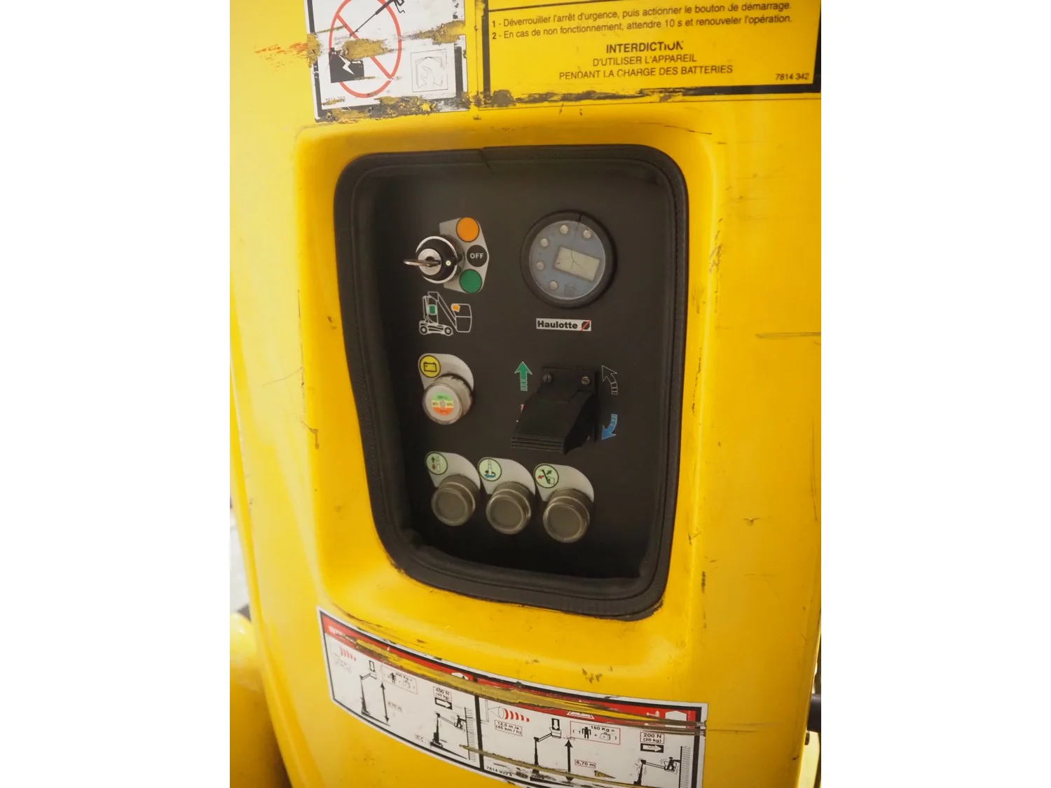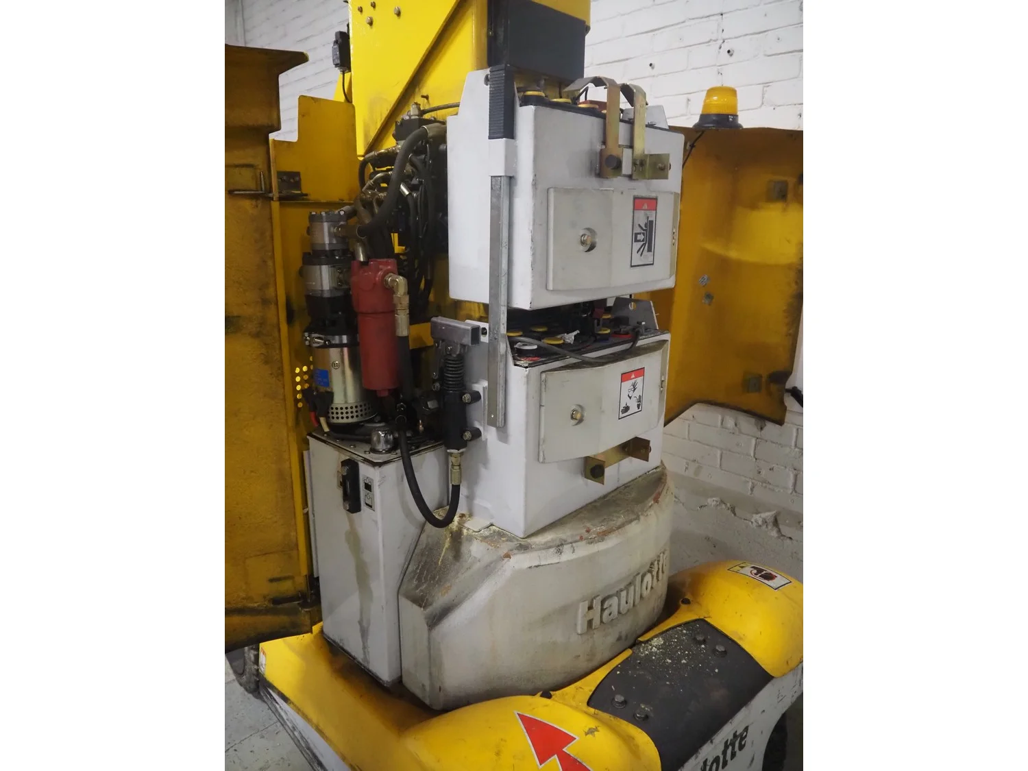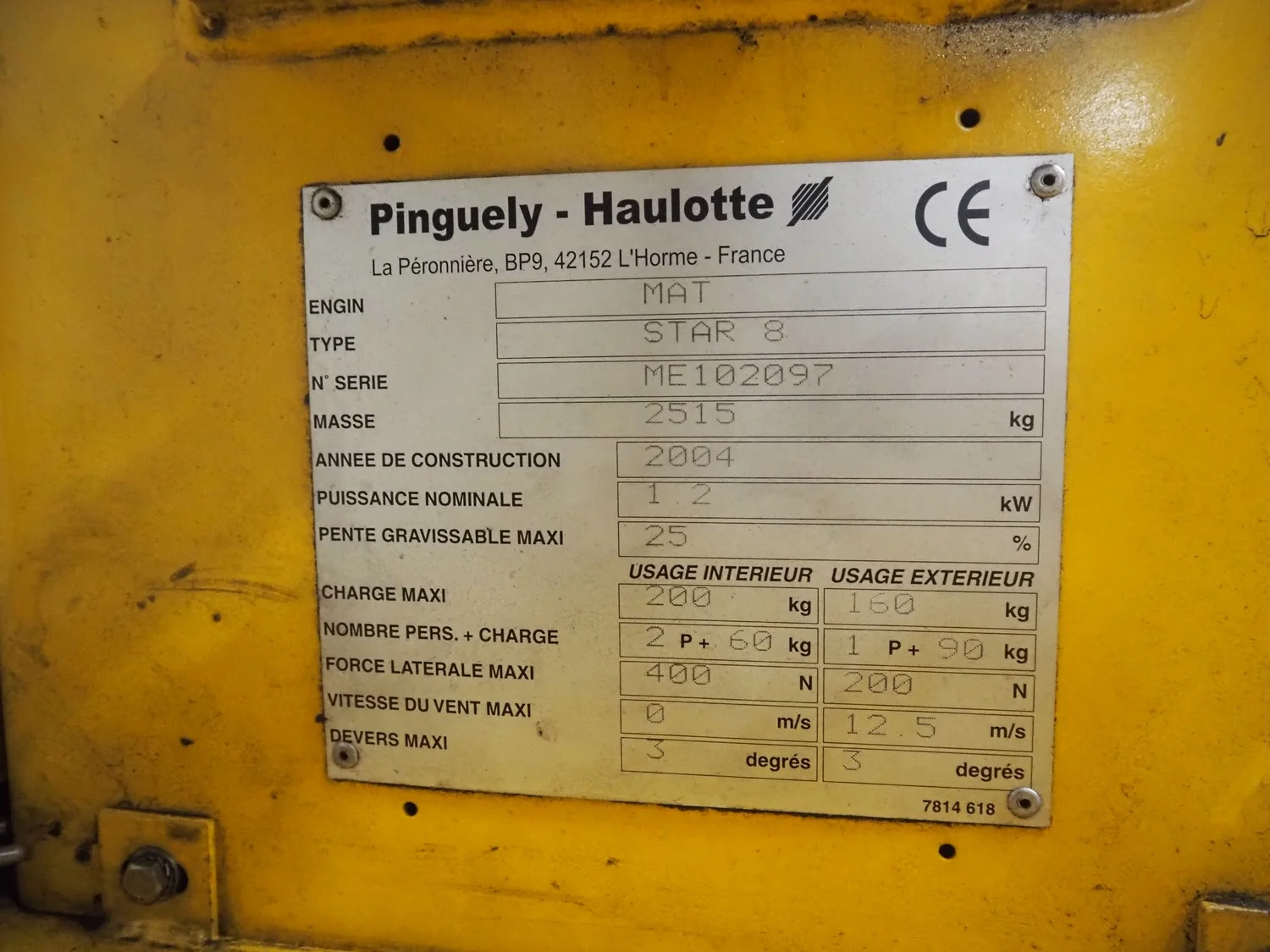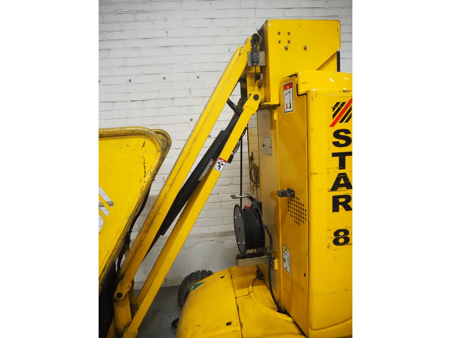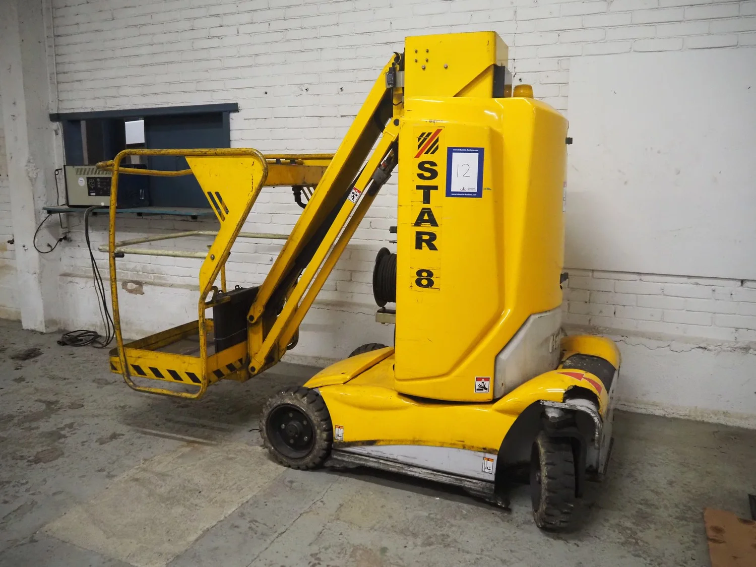 Haulotte electric mast lift, type: STAR 8, serial number: ME102097, year of construction: 2004, 1.2 kW, weight: 2515 Kg, lifting capacity: 200 kg, working height: 8.2 meters, platform height: 6.2 meters, dimensions platform: 920 mm x 660 mm, total dimensions: 2450 mm x 1050 mm x 1980 mm. Damaged.