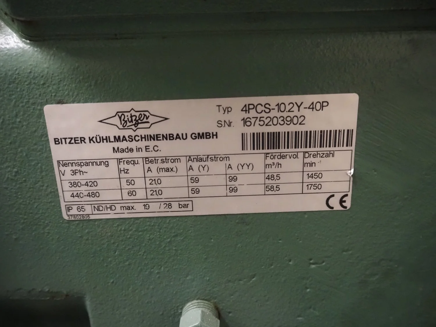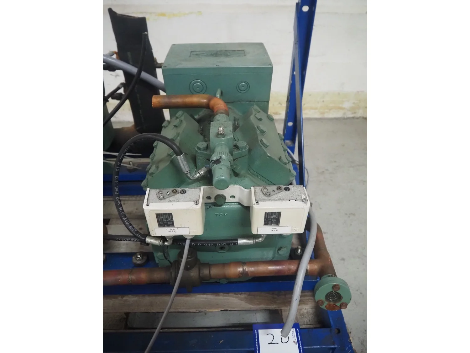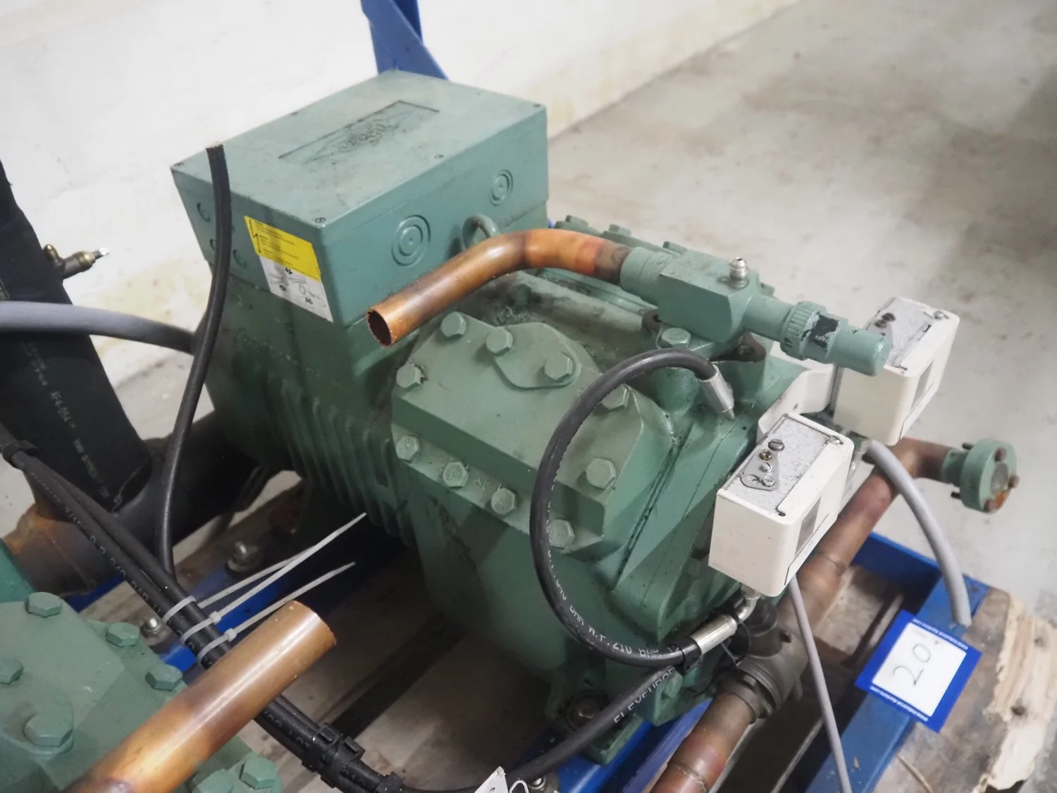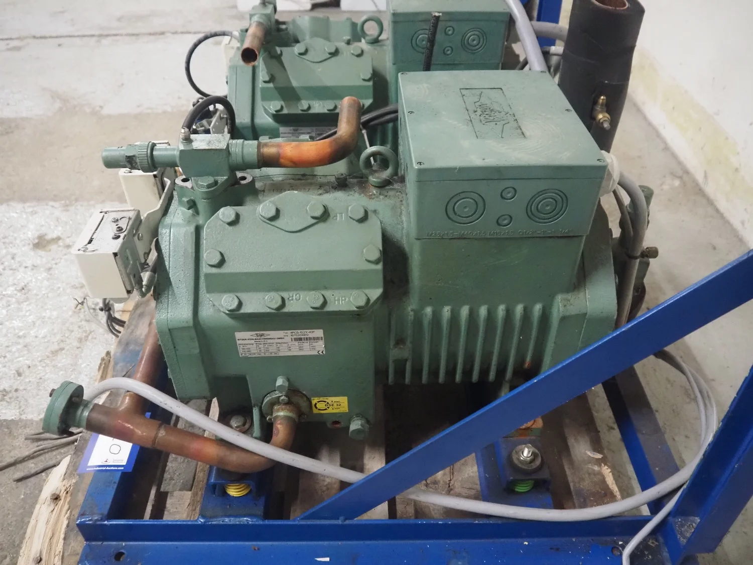 Bitzer Kühlmaschinenbau GmbH compressor rack with 2 Bitzer Kühlmaschinenbau GmbH cooling compressors, type: (2x) 4PCS-10.2Y-40S, capacity: 48.5/58.5 m³ per hour, dimensions: 1050 mm x 780 mm x 720 mm.