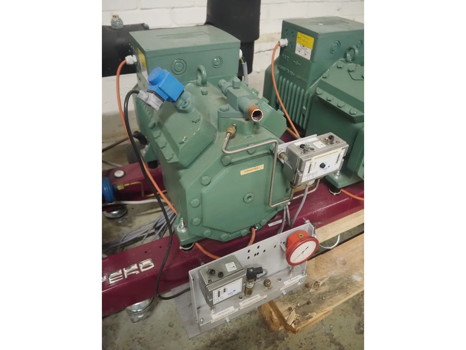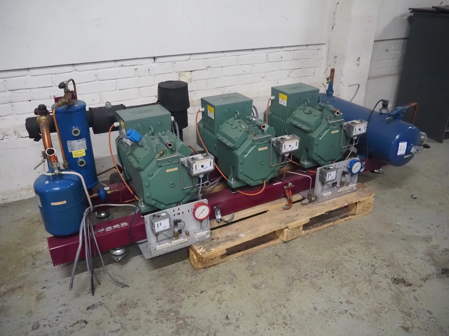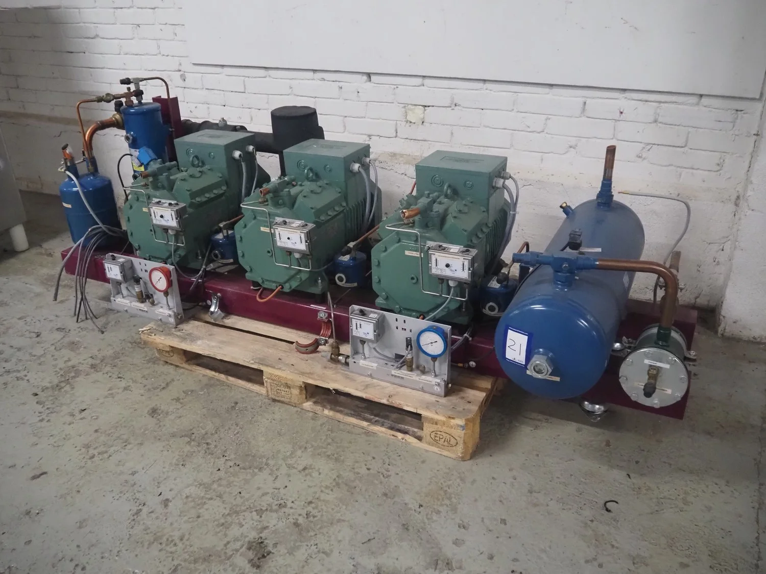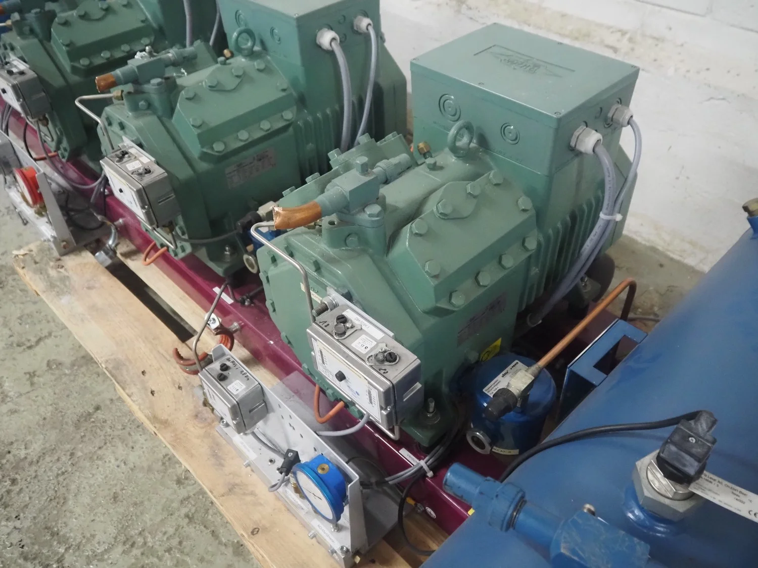 Teko compressor rack with 3 Bitzer Kühlmaschinenbau GmbH cooling compressors, type: (3x) 4NCS-10.2Y-40P, capacity: 56.2/67.4 m³ per hour, dimensions: 2450 mm x 850 mm x 900 mm.