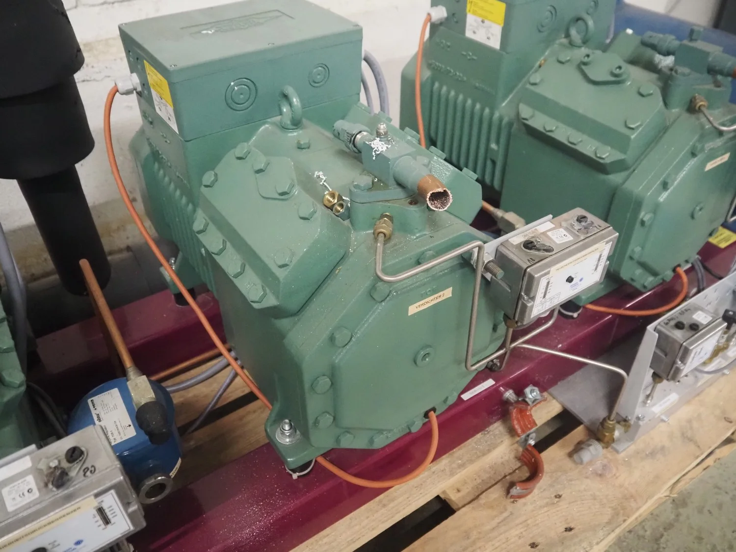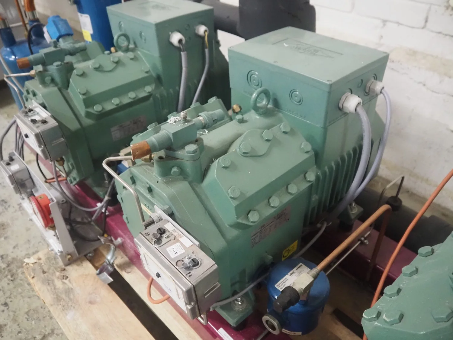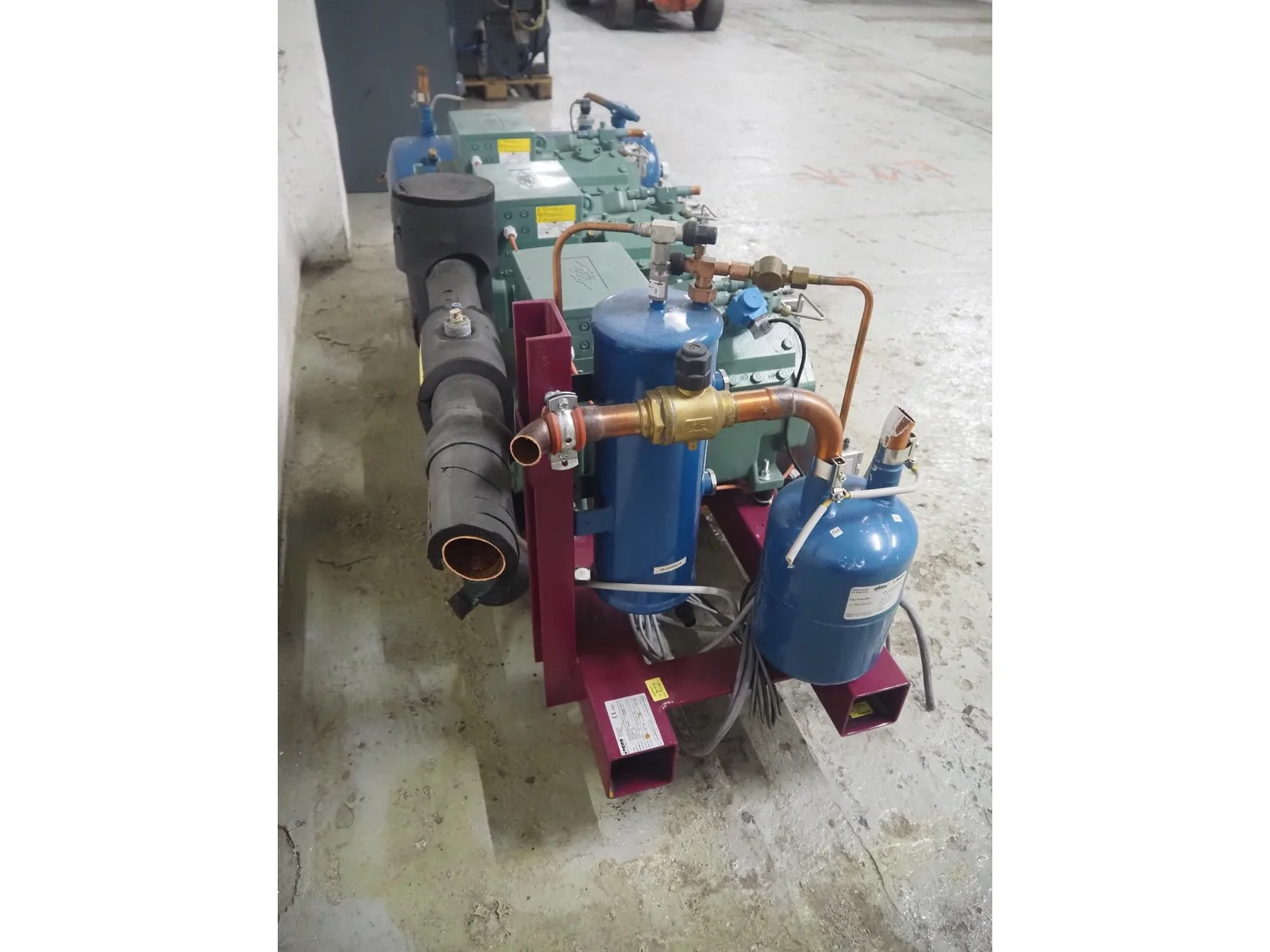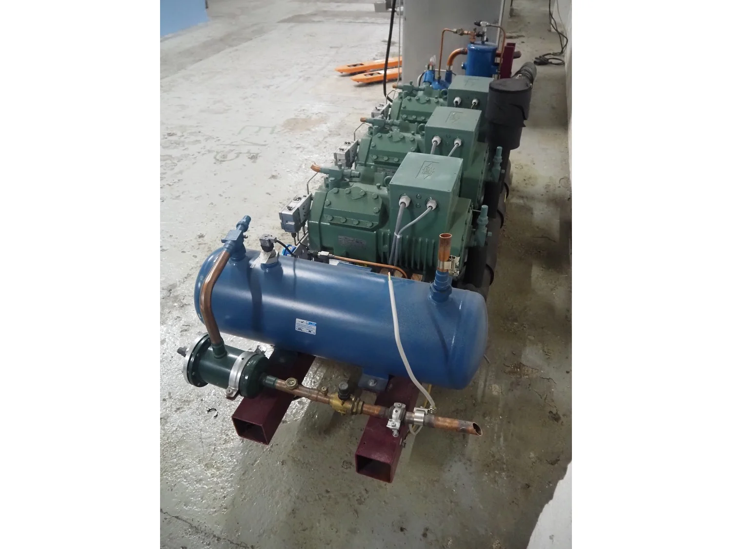 Teko compressor rack with 3 Bitzer Kühlmaschinenbau GmbH cooling compressors, type: (3x) 4NCS-10.2Y-40P, capacity: 56.2/67.4 m³ per hour, dimensions: 2450 mm x 850 mm x 900 mm.