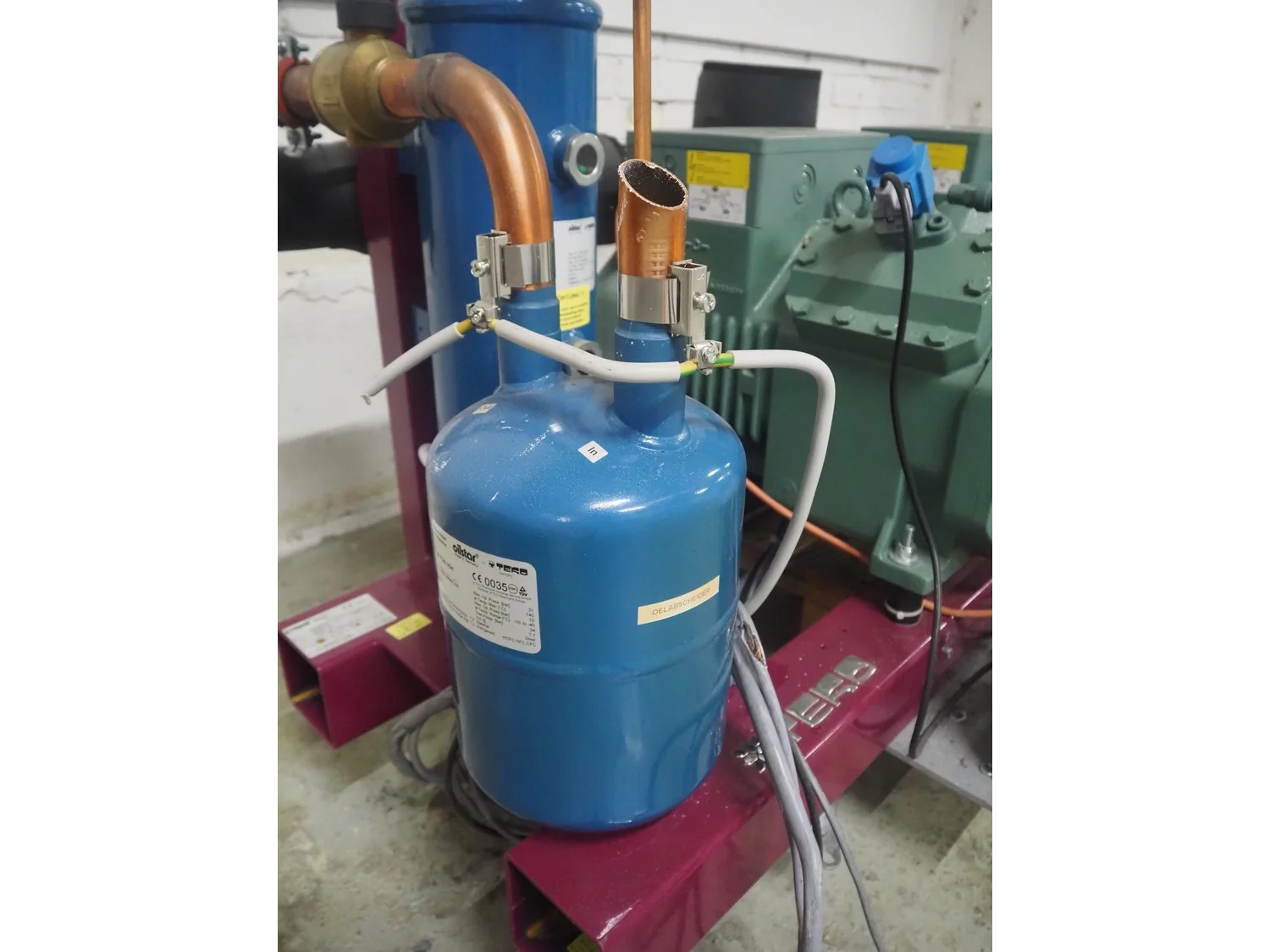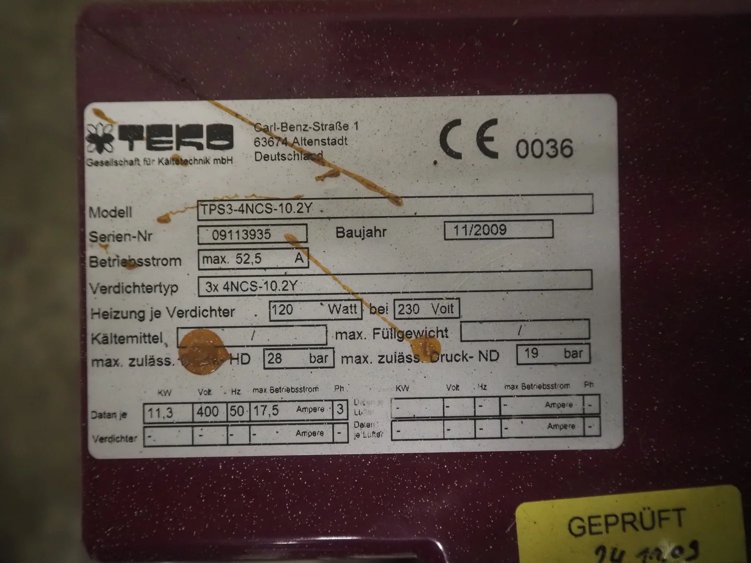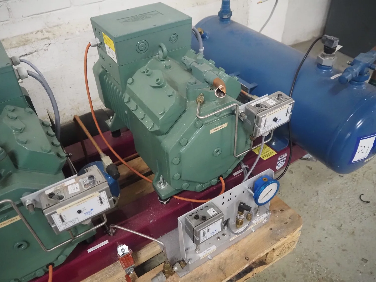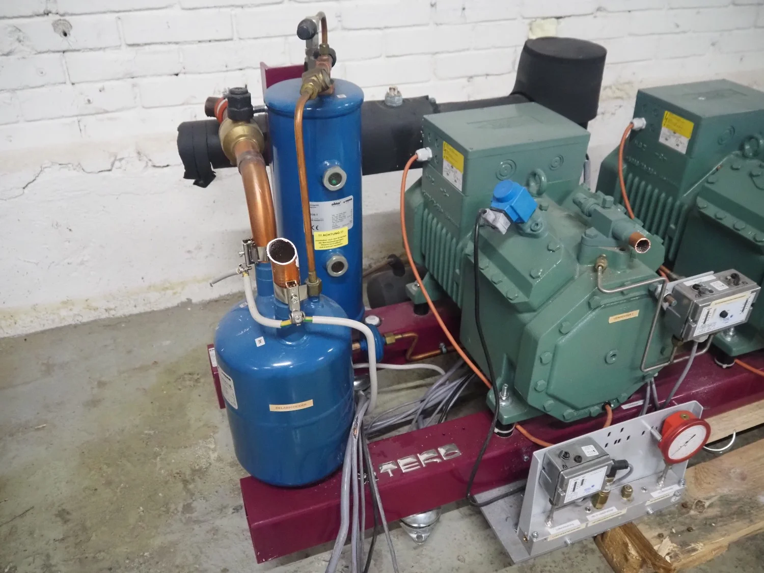 Teko compressor rack with 3 Bitzer Kühlmaschinenbau GmbH cooling compressors, type: (3x) 4NCS-10.2Y-40P, capacity: 56.2/67.4 m³ per hour, dimensions: 2450 mm x 850 mm x 900 mm.