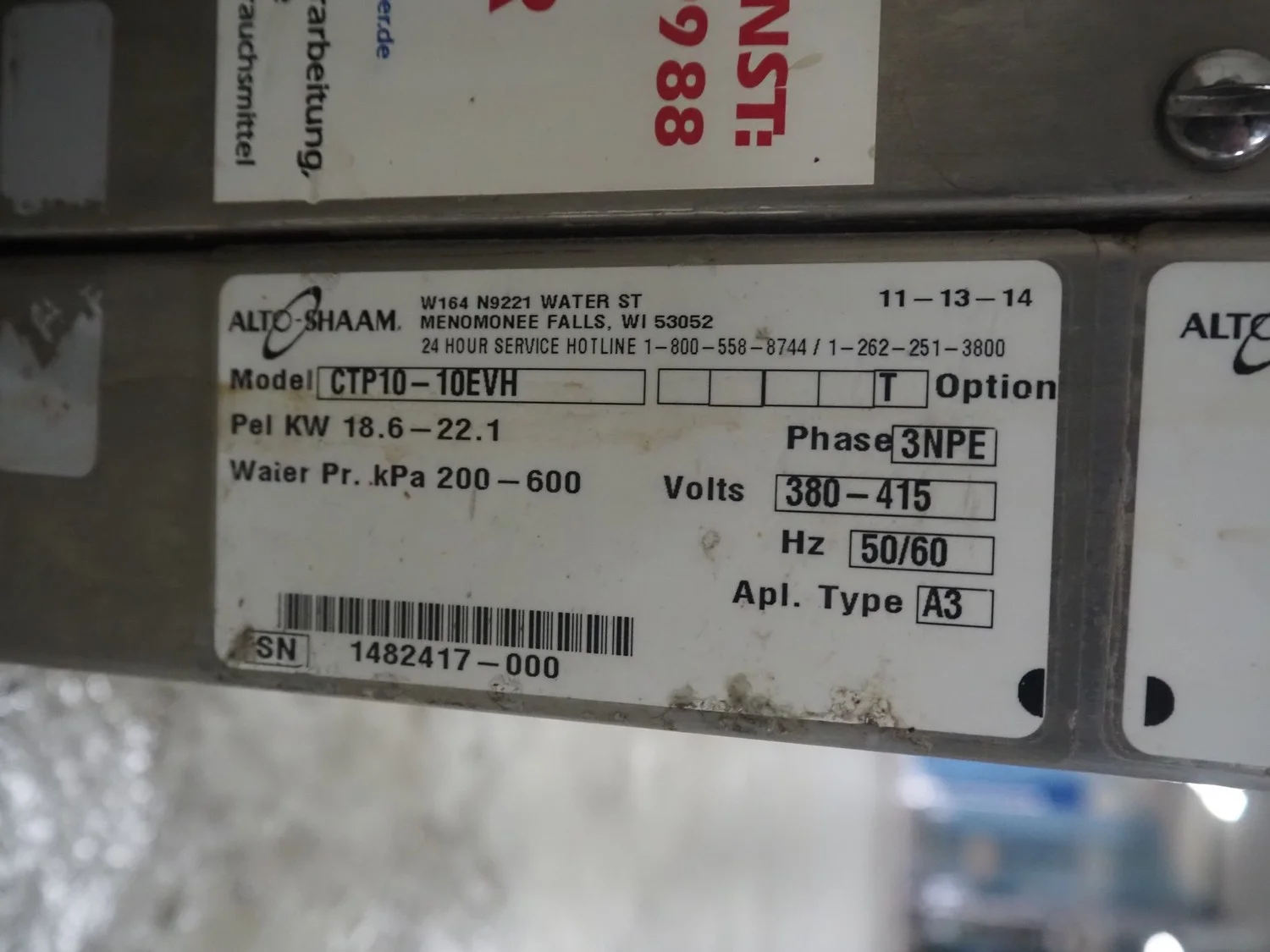 Alto-Shaam combi oven, model: CTP10-10EVH, serial number: 1482417 - 000, 380-415 V, 3 Ph, 50/60 Hz, 11 floors, dimensions each floor: 530 mm x 330 mm, total dimensions: 1000 mm x 920 mm x 1520 mm.