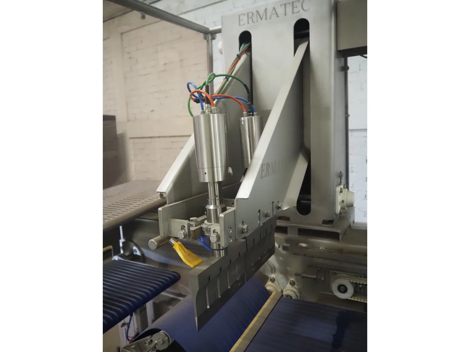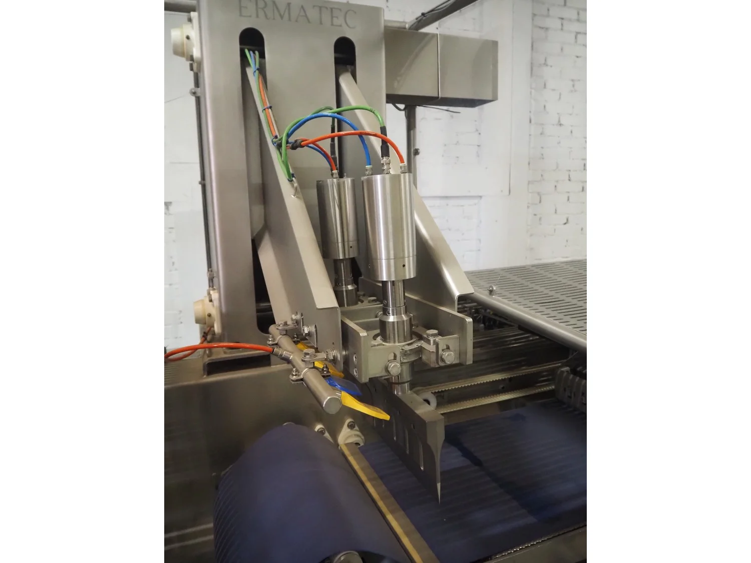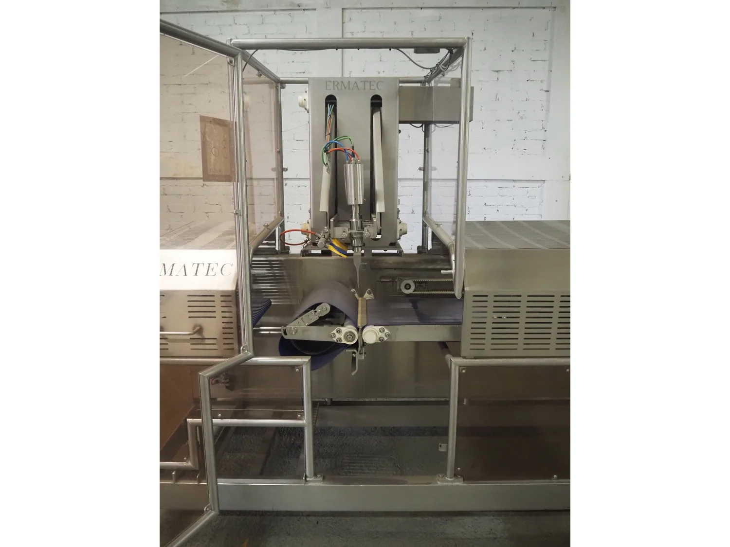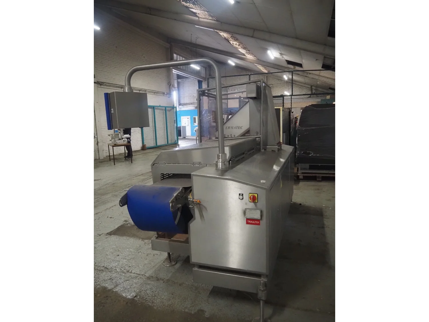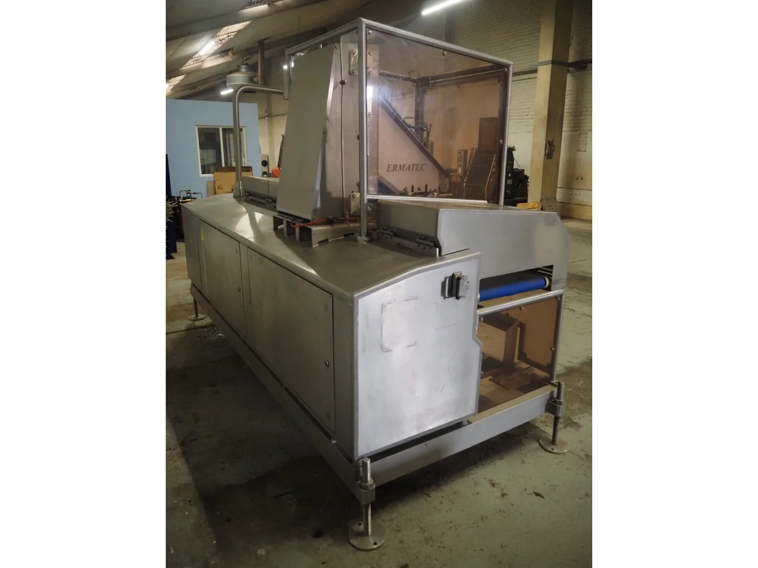 Ermatec slicer for cheese, serie: TRENCHEUR.US, number: 837, year of construction: 30.09.2005, plastic belt, belt width: 420 mm, working width: 485 mm, total dimensions: 3200 mm x 1300 mm x 2000 mm.