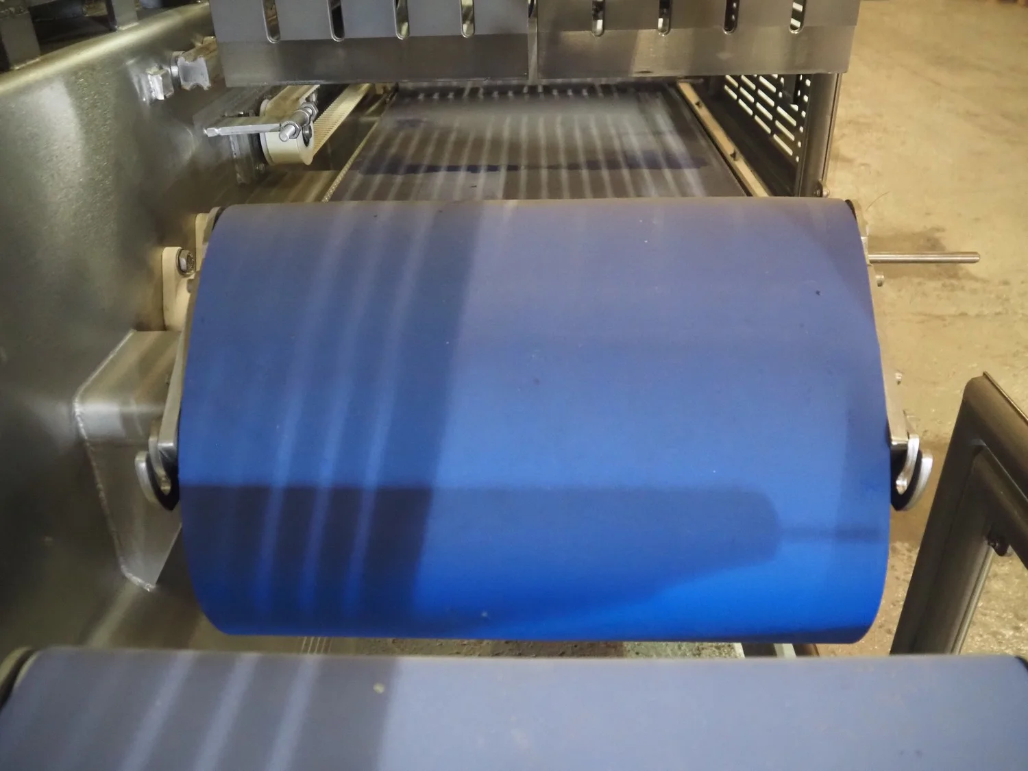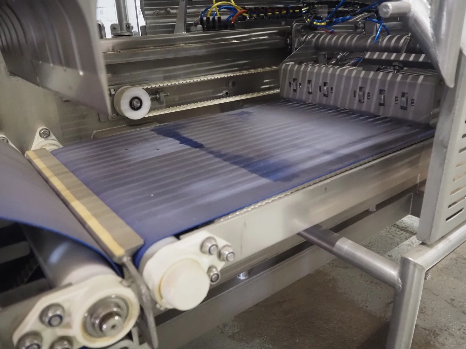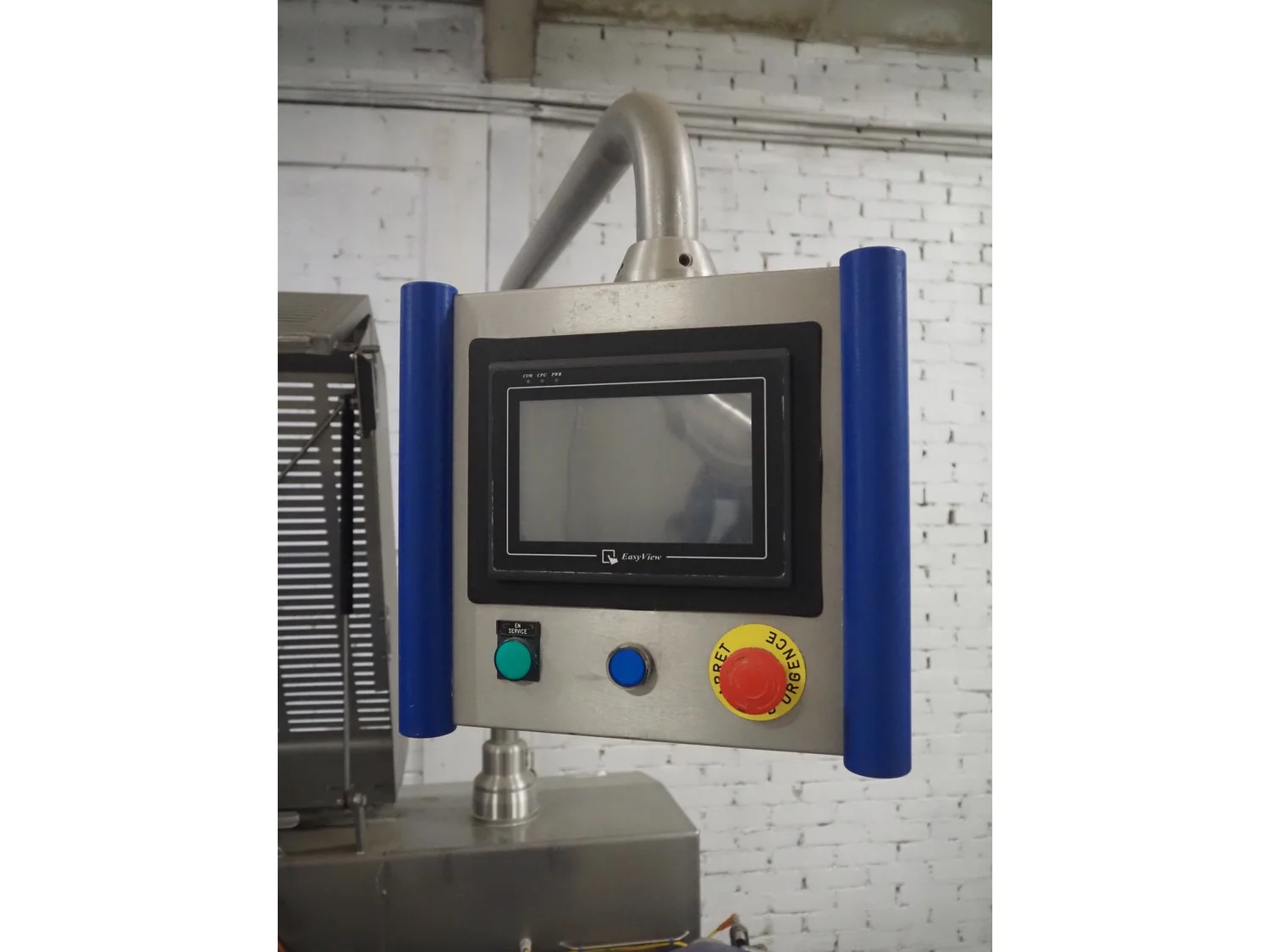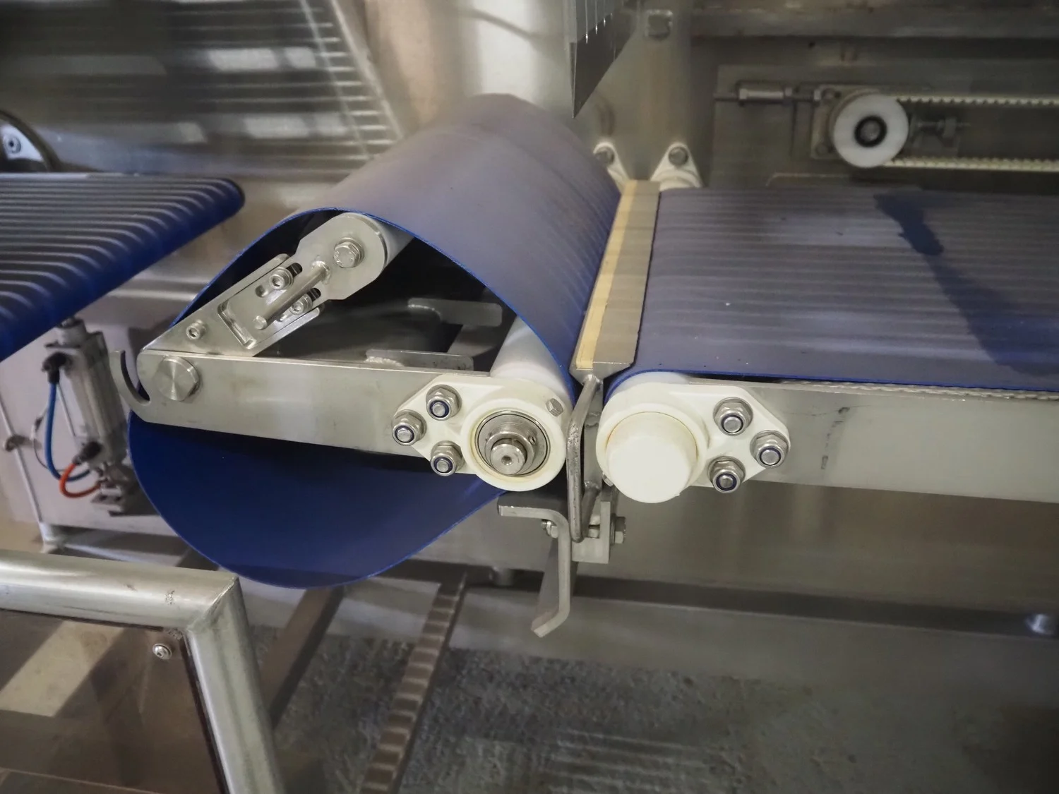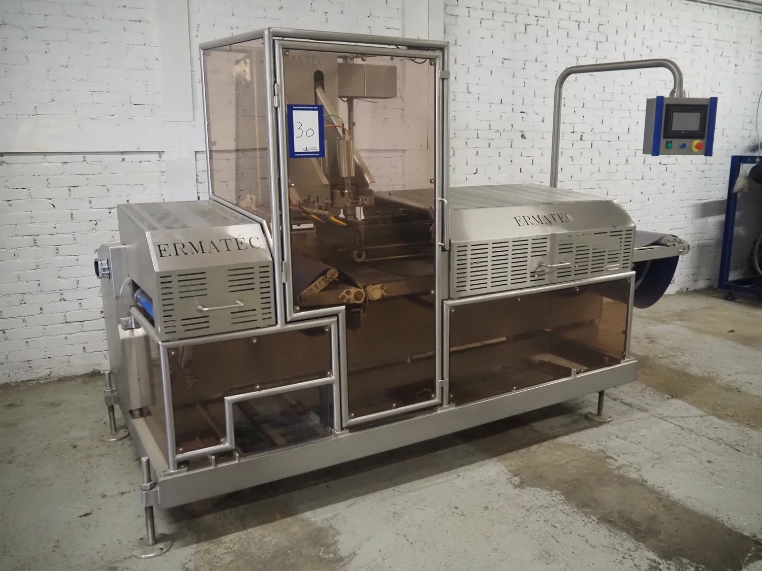 Ermatec slicer for cheese, serie: TRENCHEUR.US, number: 837, year of construction: 30.09.2005, plastic belt, belt width: 420 mm, working width: 485 mm, total dimensions: 3200 mm x 1300 mm x 2000 mm.