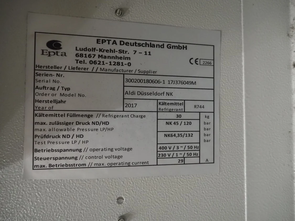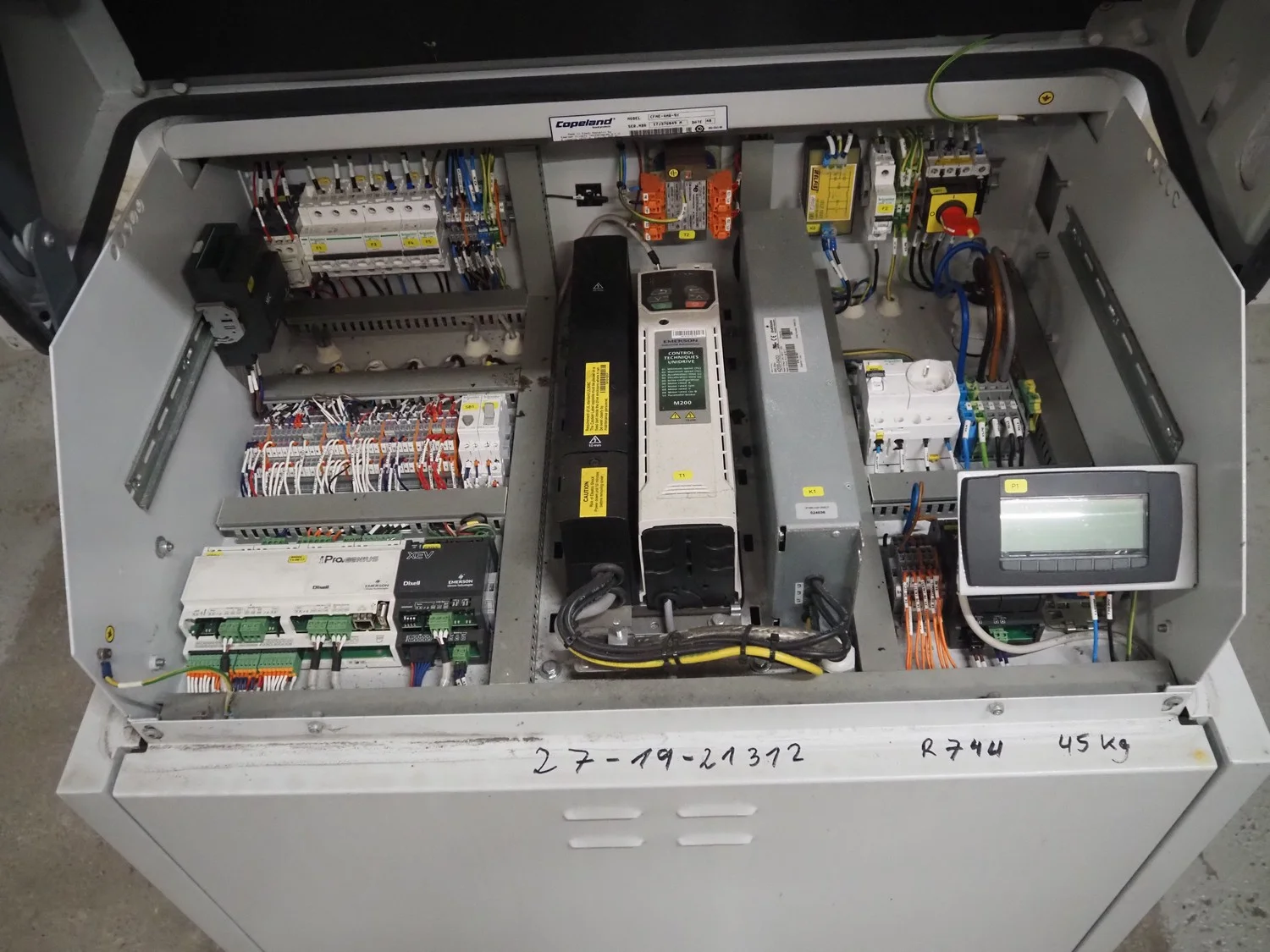 Copeland refrigeration unit, model: CFME-4MR-9X, serial number: 17J376049 M, year of construction: 21-10-2017, 230/400 V, 3 Ph, 50 Hz, 25 A, weight: 450 kg, refrigerant: R744, dimensions: 1600 mm x 900 mm x 1150 mm.