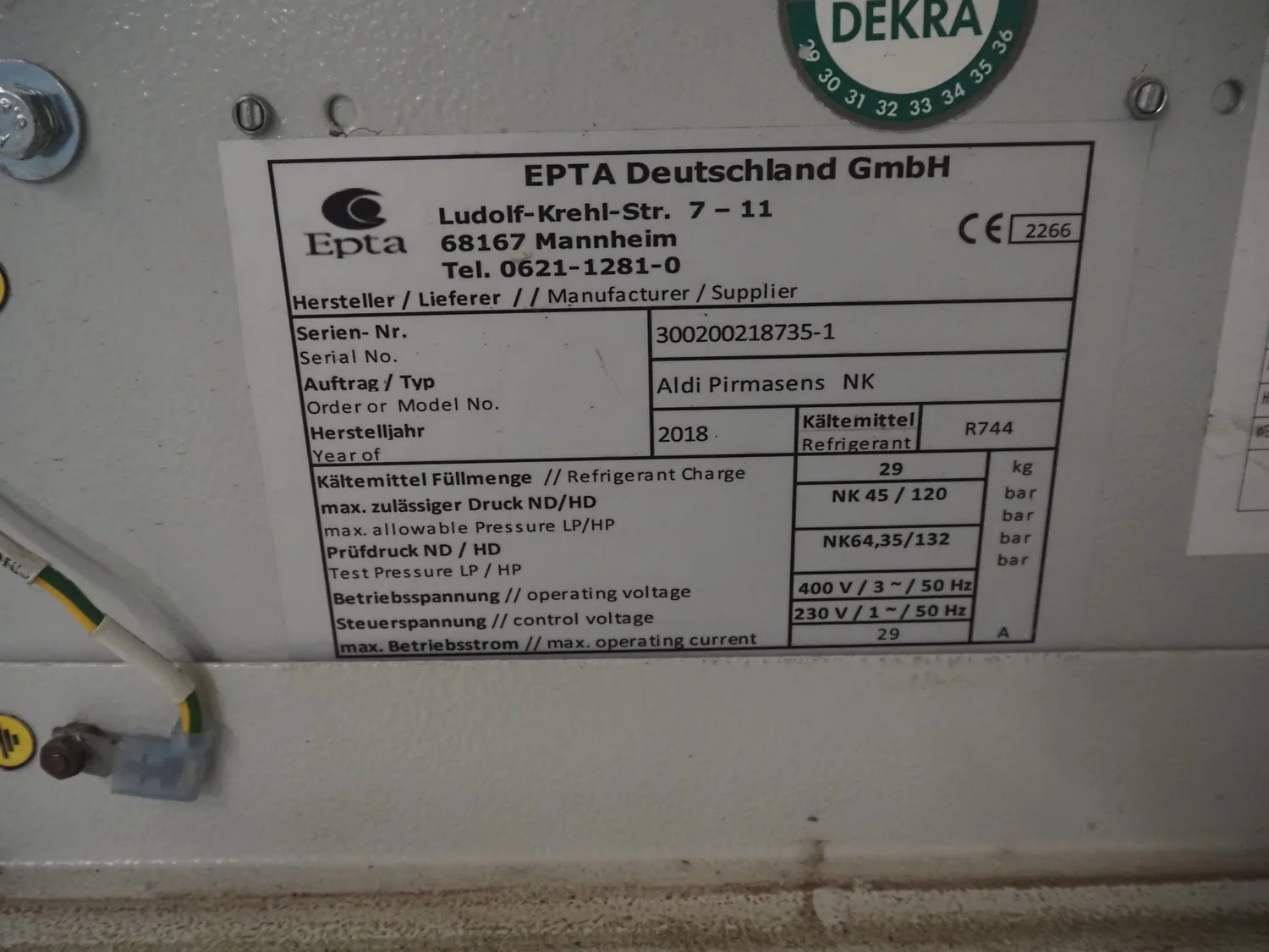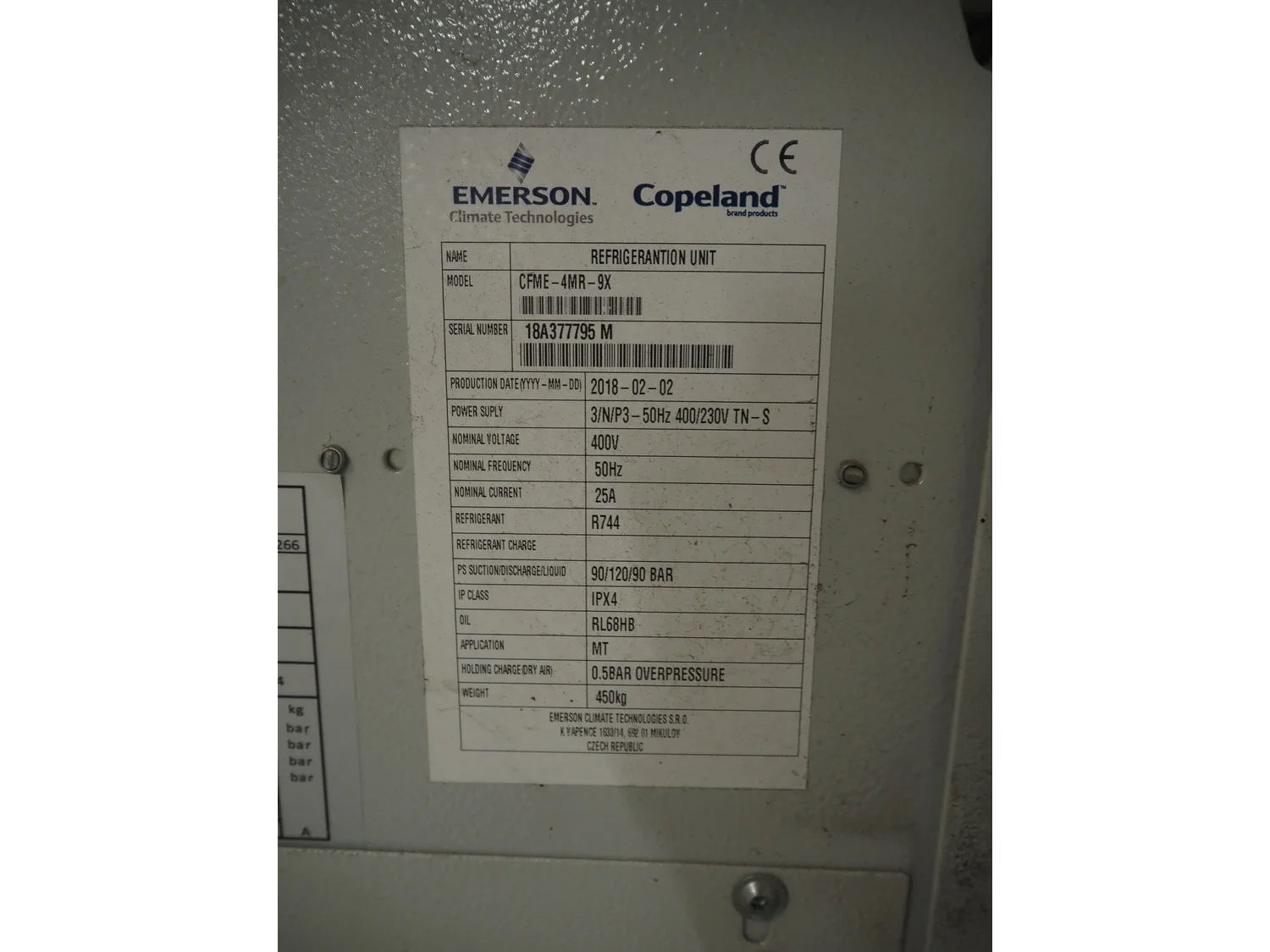 Copeland refrigeration unit, model: CFME-4MR-9X, serial number: 18A377795 M, year of construction: 02-02-2018, 230/400 V, 3 Ph, 50 Hz, 25 A, weight: 450 kg, refrigerant: R744, dimensions: 1600 mm x 900 mm x 1150 mm.